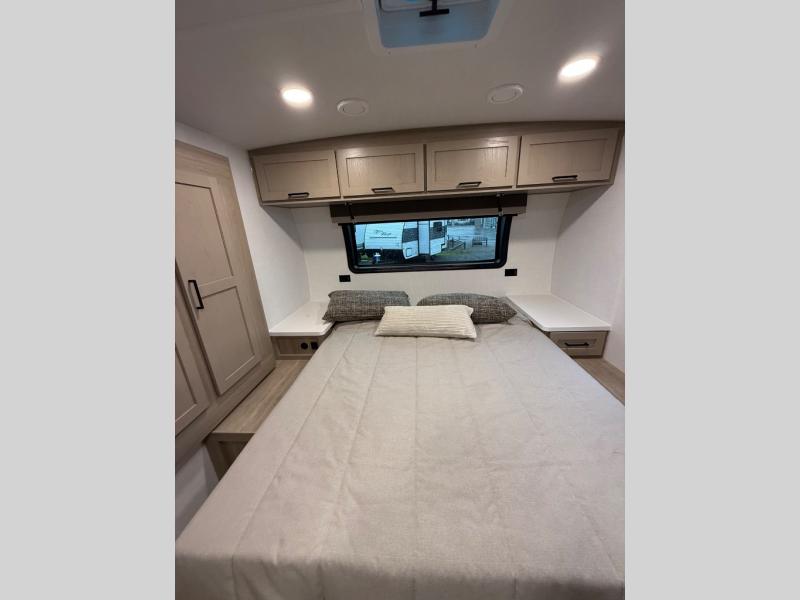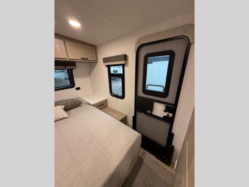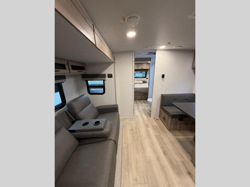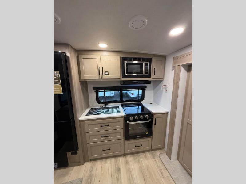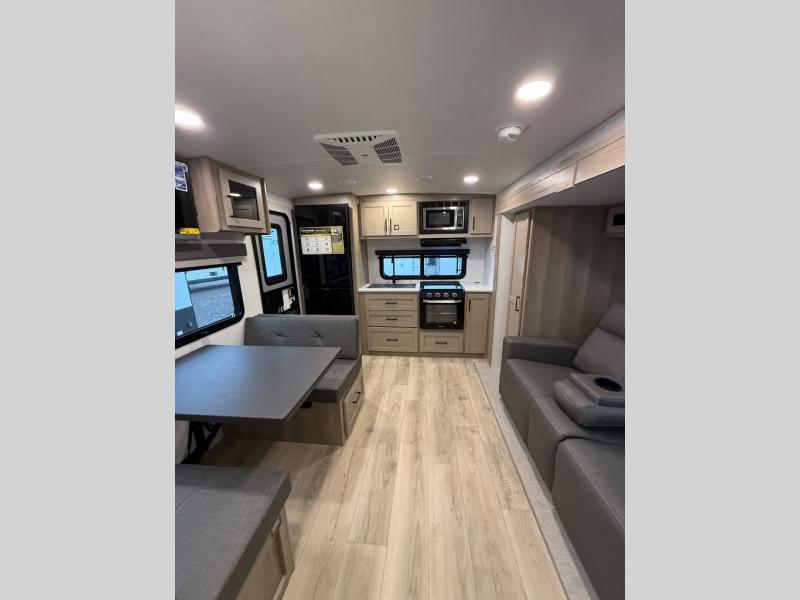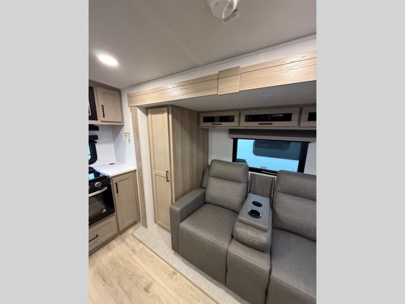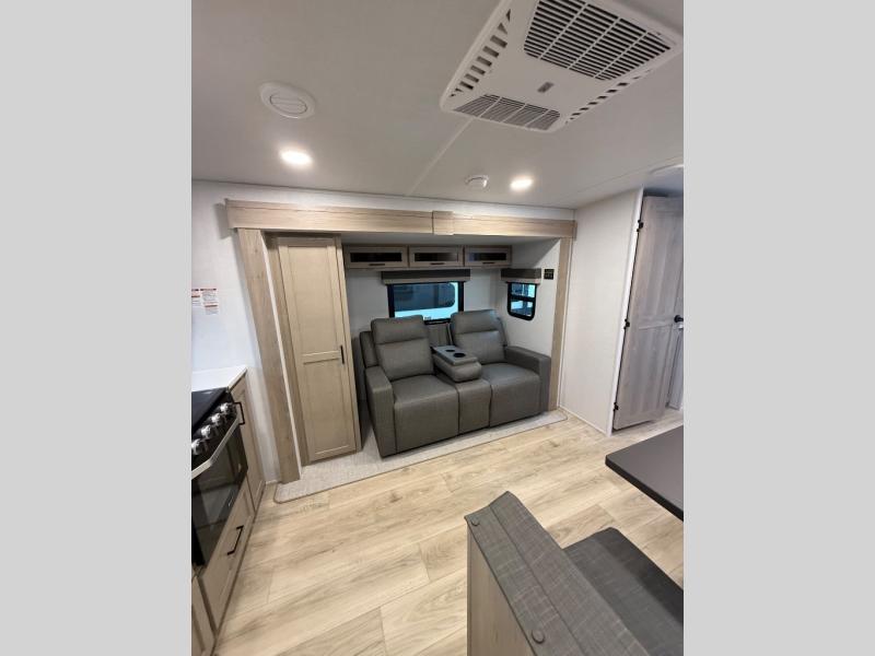 You and your spouse will have a great time camping in this travel trailer! You will have your own RV queen bed to sleep on in the front private bedroom, and an optional TV can be added if you enjoy the morning news in bed. Breakfast can be made on the three burner cooktop in the rear kitchen, or head outdoors to cook on the outside griddle. The 67" theater seating with cupholders will provide a place to relax and dine together, and the spacious walk-through bath will allow you to clean up before you head out for the day. This model includes plenty of storage space, including a pantry for your snacks, a wardrobe slide out in the bedroom, plus a drop-frame pass-through storage for larger camp gear!