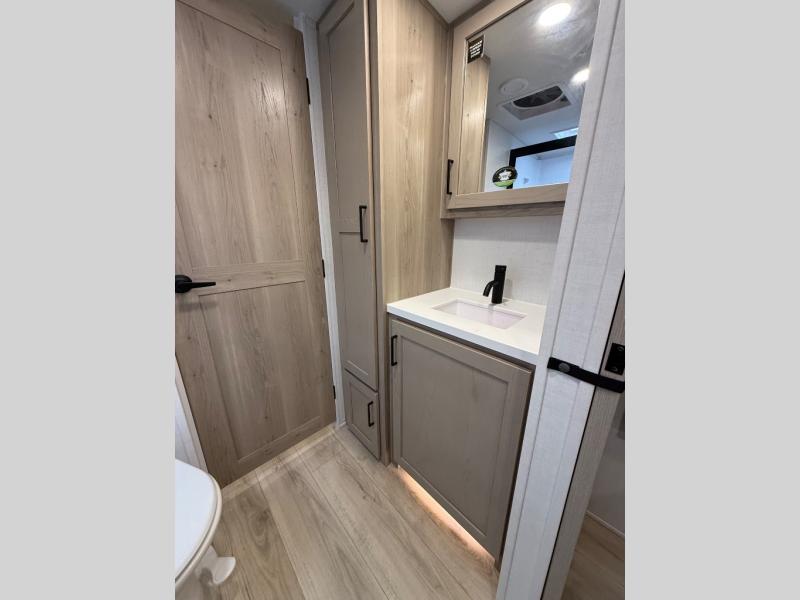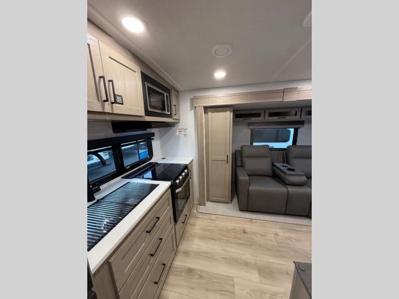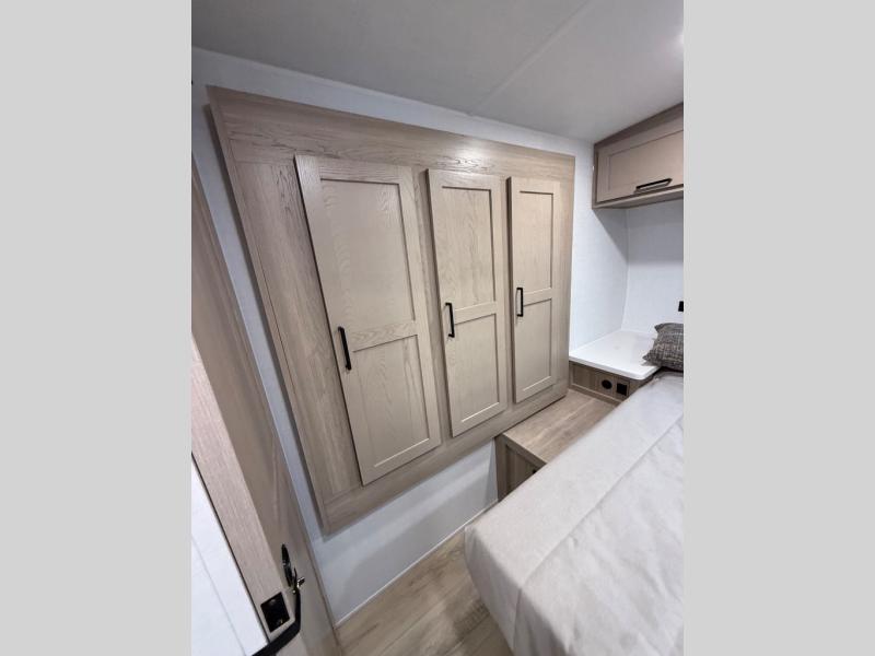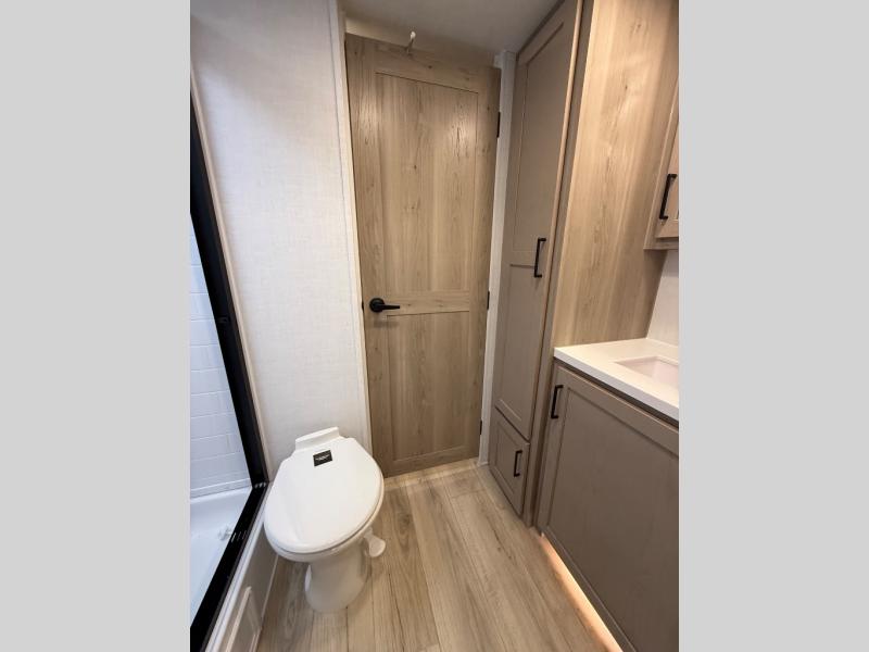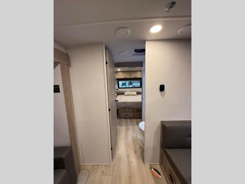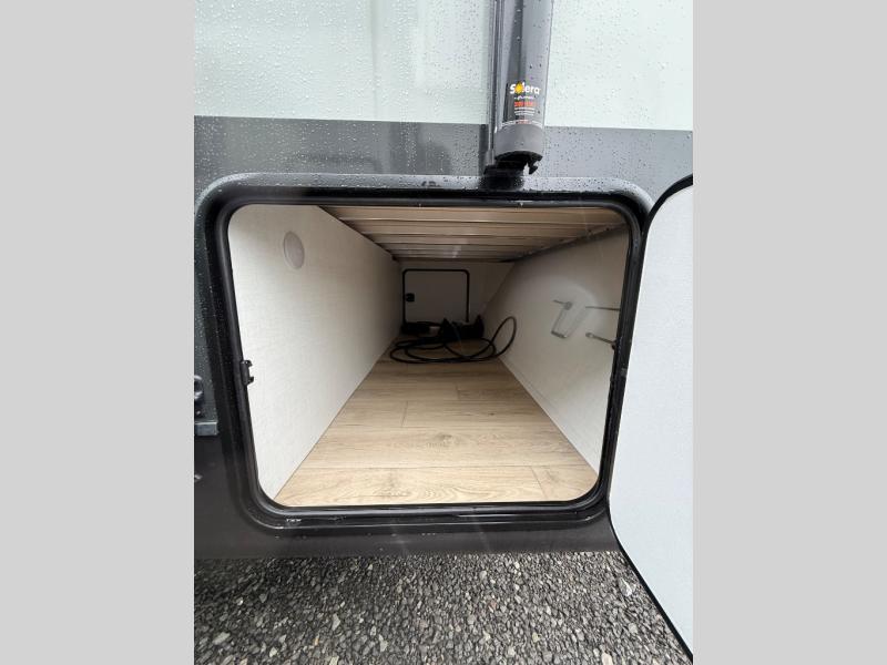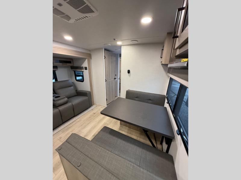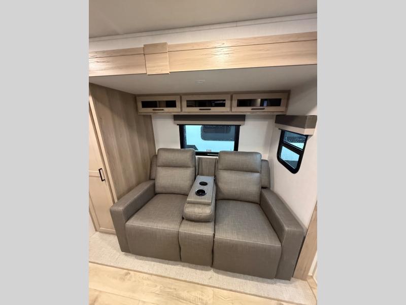 You and your spouse will have a great time camping in this travel trailer! You will have your own RV queen bed to sleep on in the front private bedroom, and an optional TV can be added if you enjoy the morning news in bed. Breakfast can be made on the three burner cooktop in the rear kitchen, or head outdoors to cook on the outside griddle. The 67" theater seating with cupholders will provide a place to relax and dine together, and the spacious walk-through bath will allow you to clean up before you head out for the day. This model includes plenty of storage space, including a pantry for your snacks, a wardrobe slide out in the bedroom, plus a drop-frame pass-through storage for larger camp gear!