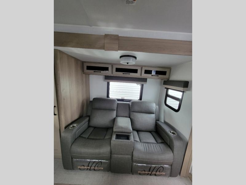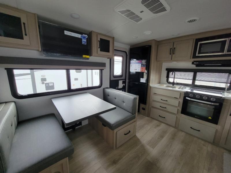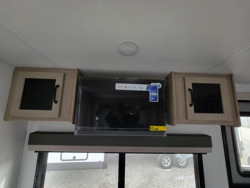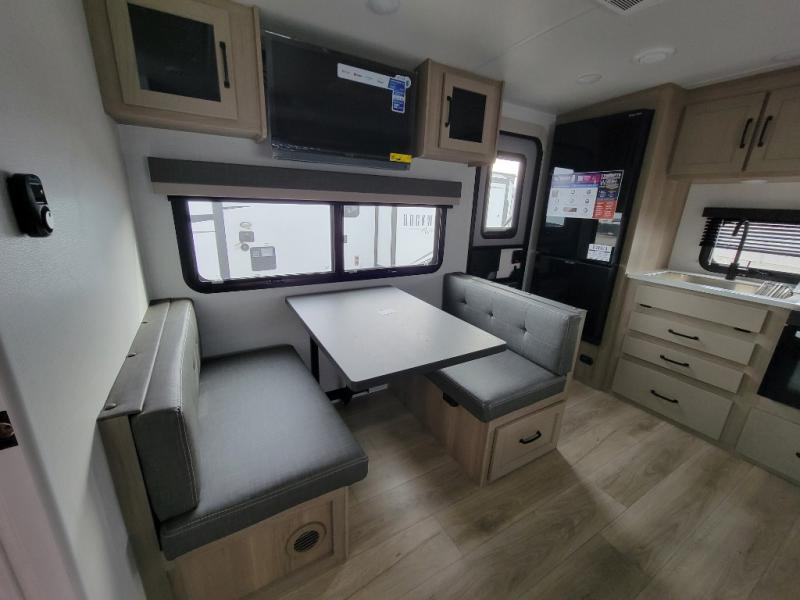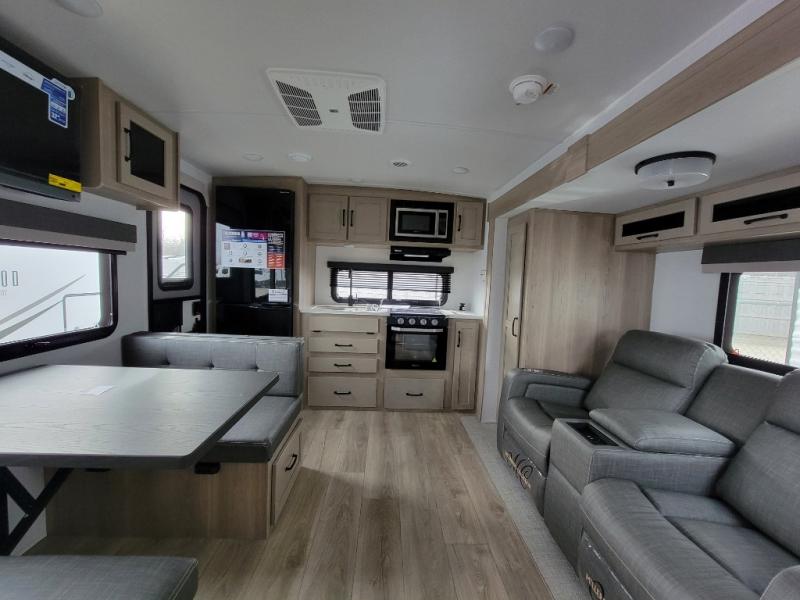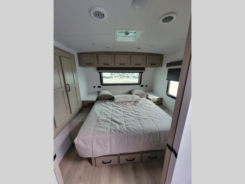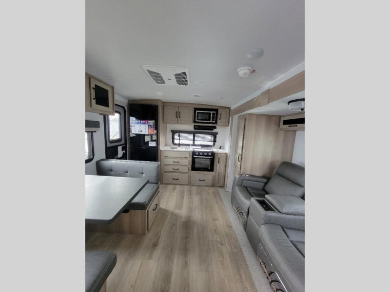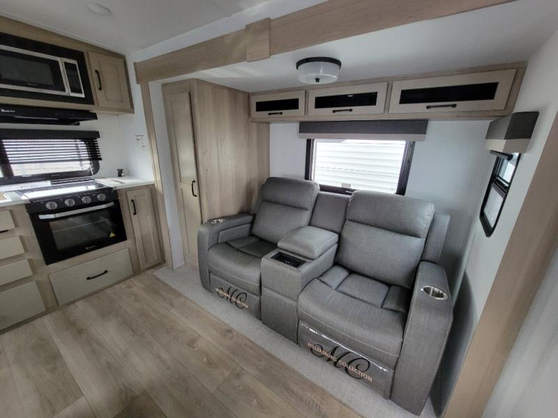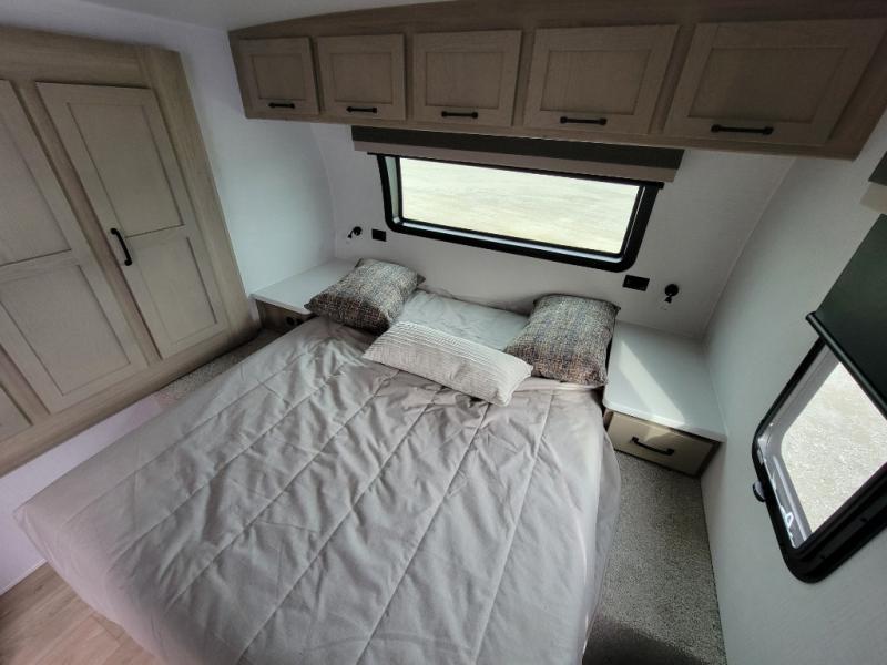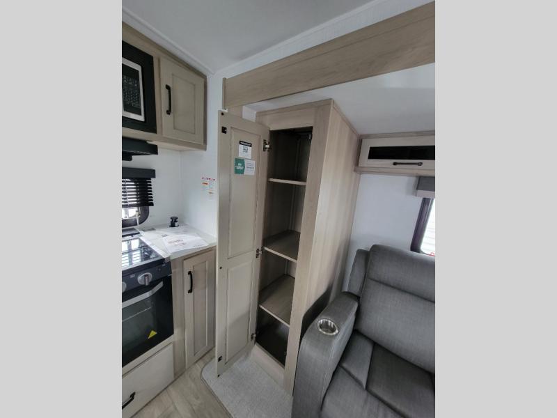 You and your spouse will have a great time camping in this travel trailer! You will have your own RV queen bed to sleep on in the front private bedroom, and an optional TV can be added if you enjoy the morning news in bed. Breakfast can be made on the three burner cooktop in the rear kitchen, or head outdoors to cook on the outside griddle. The 67" theater seating with cupholders will provide a place to relax and dine together, and the spacious walk-through bath will allow you to clean up before you head out for the day. This model includes plenty of storage space, including a pantry for your snacks, a wardrobe slide out in the bedroom, plus a drop-frame pass-through storage for larger camp gear!