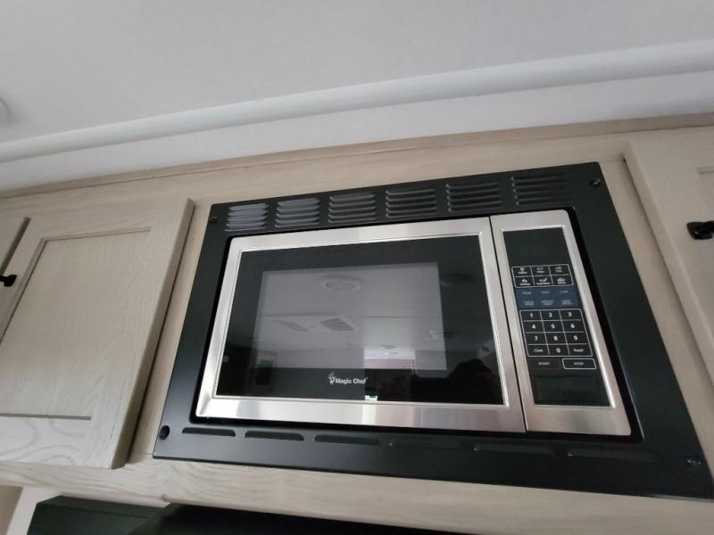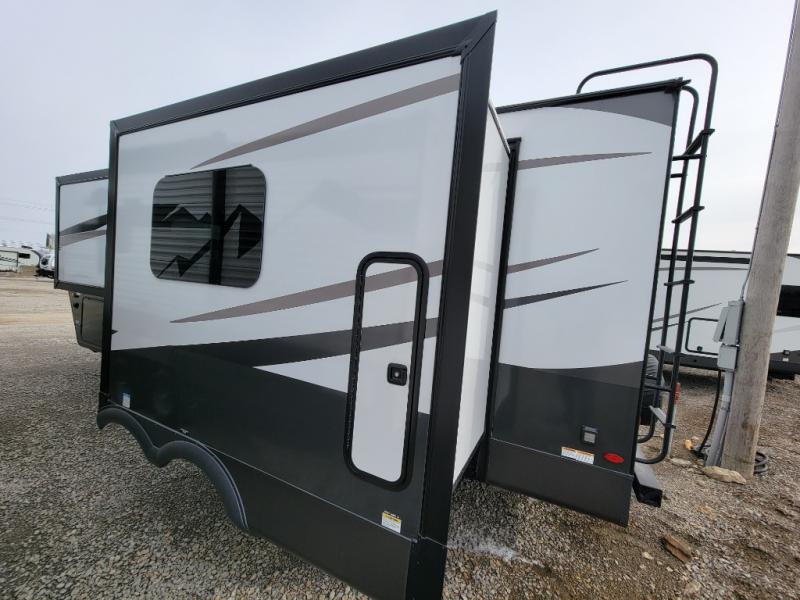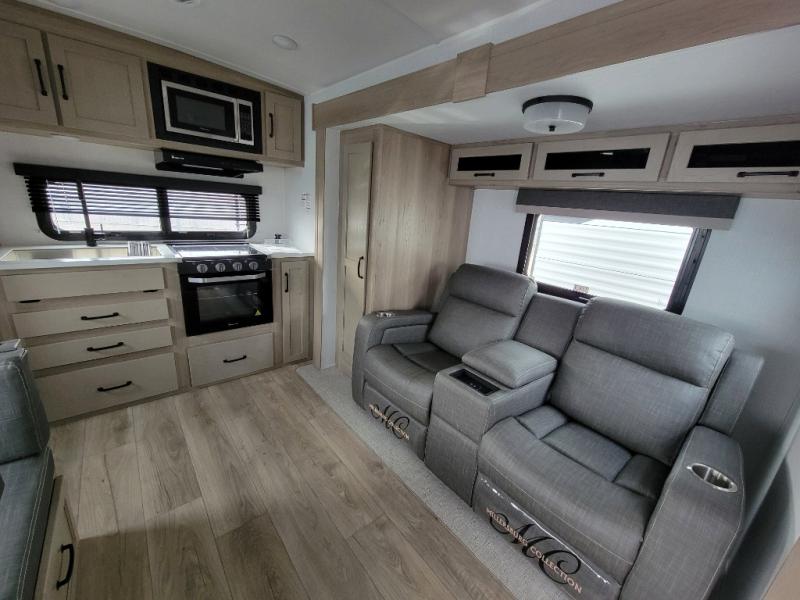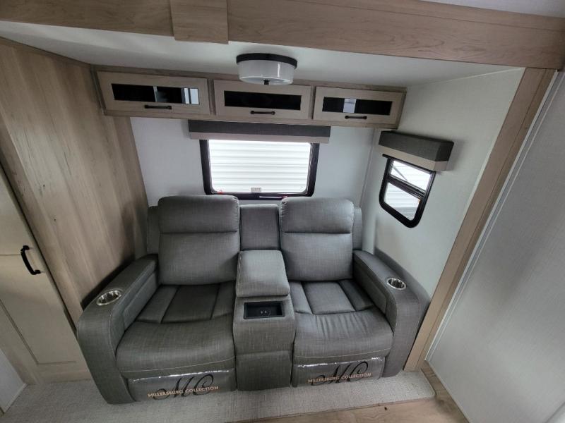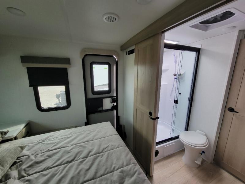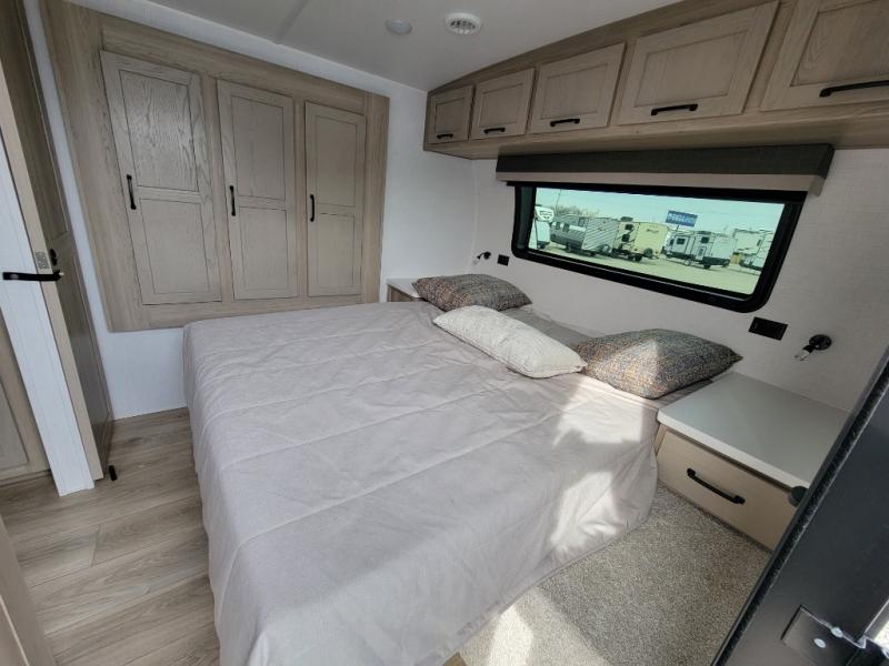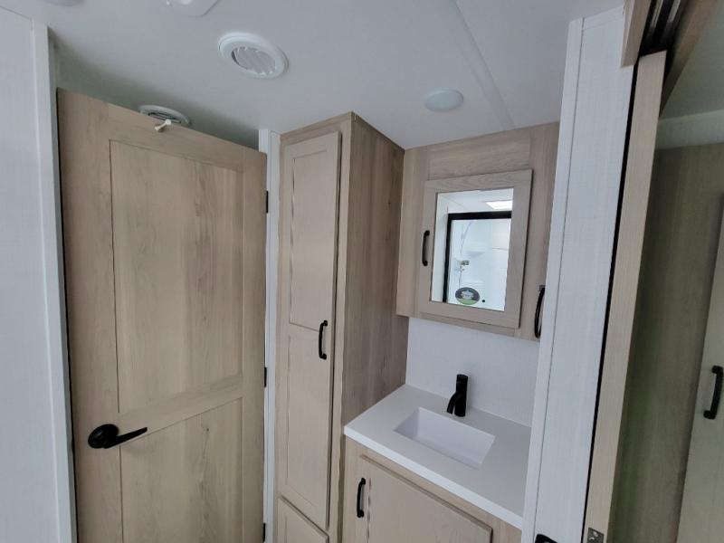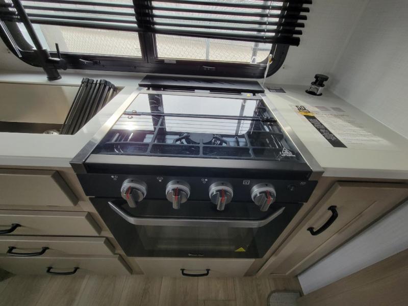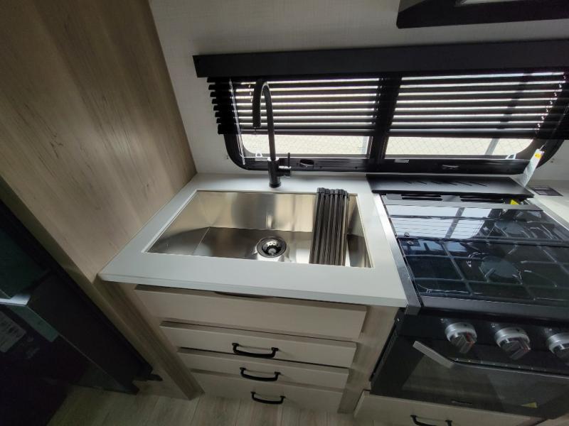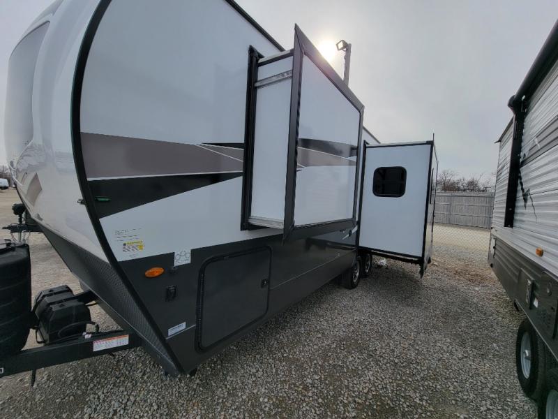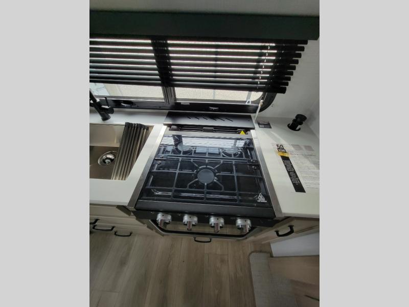 You and your spouse will have a great time camping in this travel trailer! You will have your own RV queen bed to sleep on in the front private bedroom, and an optional TV can be added if you enjoy the morning news in bed. Breakfast can be made on the three burner cooktop in the rear kitchen, or head outdoors to cook on the outside griddle. The 67" theater seating with cupholders will provide a place to relax and dine together, and the spacious walk-through bath will allow you to clean up before you head out for the day. This model includes plenty of storage space, including a pantry for your snacks, a wardrobe slide out in the bedroom, plus a drop-frame pass-through storage for larger camp gear!