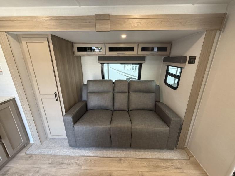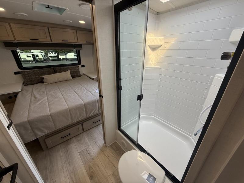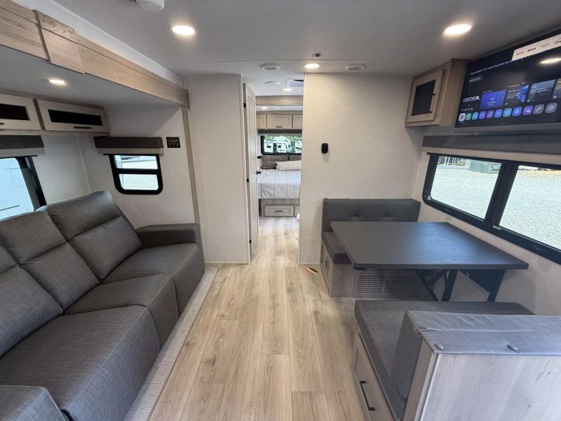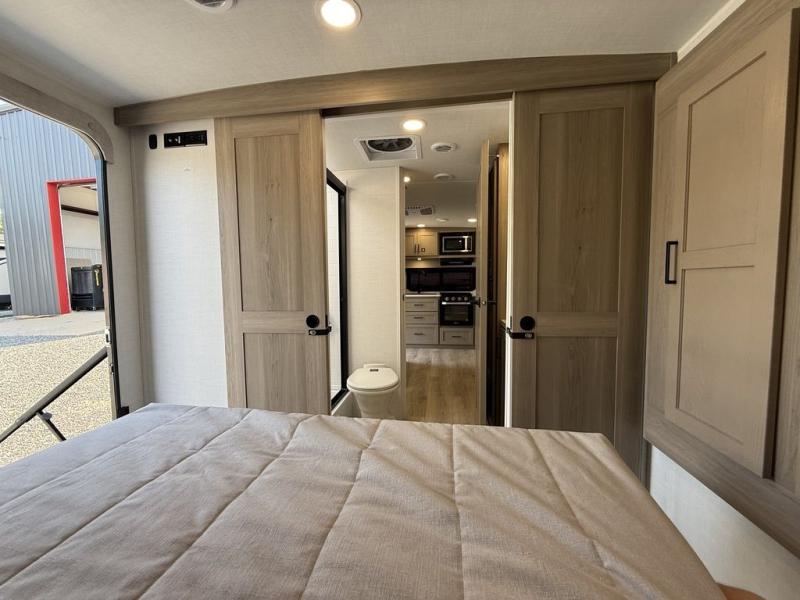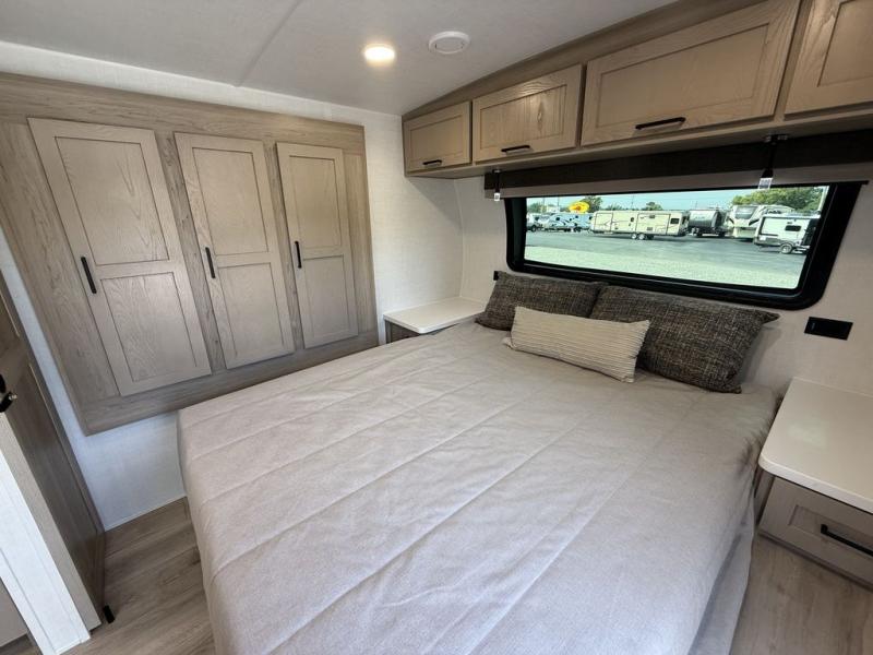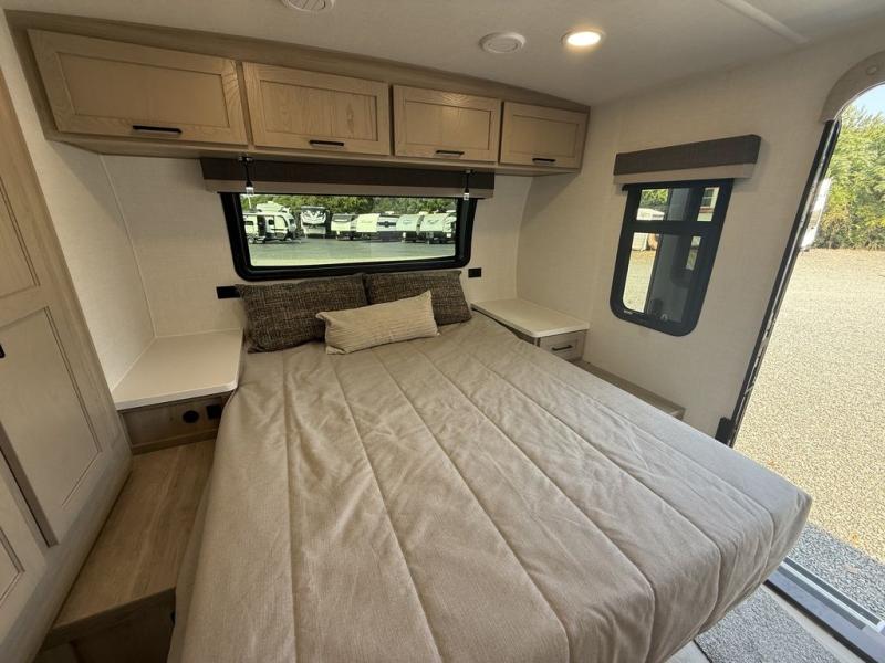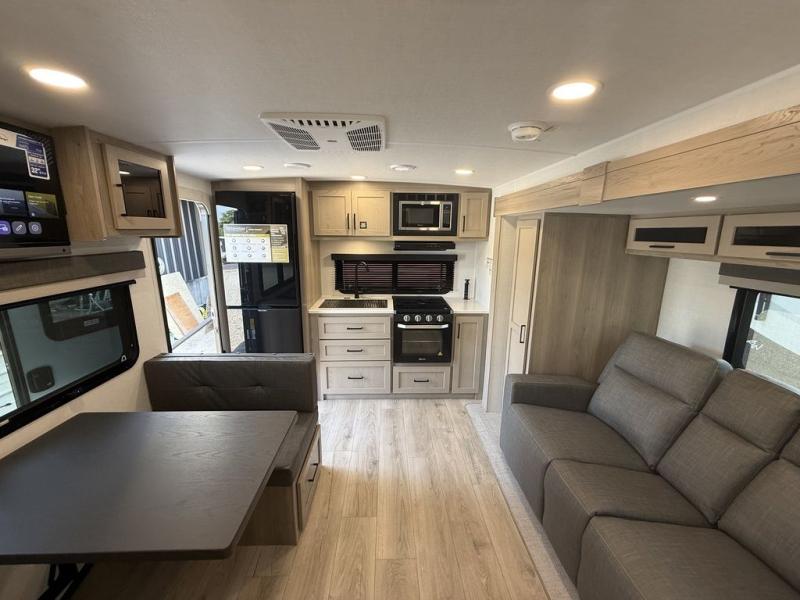 You and your spouse will have a great time camping in this travel trailer! You will have your own RV queen bed to sleep on in the front private bedroom, and an optional TV can be added if you enjoy the morning news in bed. Breakfast can be made on the three burner cooktop in the rear kitchen, or head outdoors to cook on the outside griddle. The 67" theater seating with cupholders will provide a place to relax and dine together, and the spacious walk-through bath will allow you to clean up before you head out for the day. This model includes plenty of storage space, including a pantry for your snacks, a wardrobe slide out in the bedroom, plus a drop-frame pass-through storage for larger camp gear!