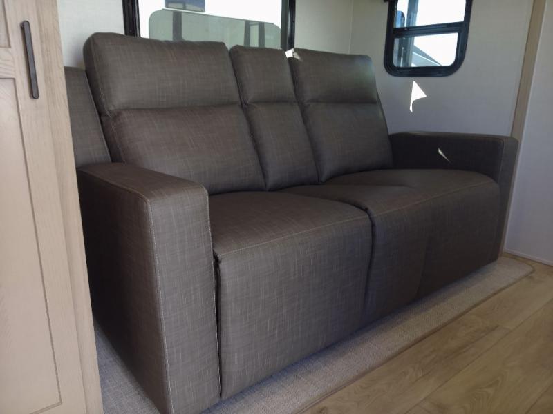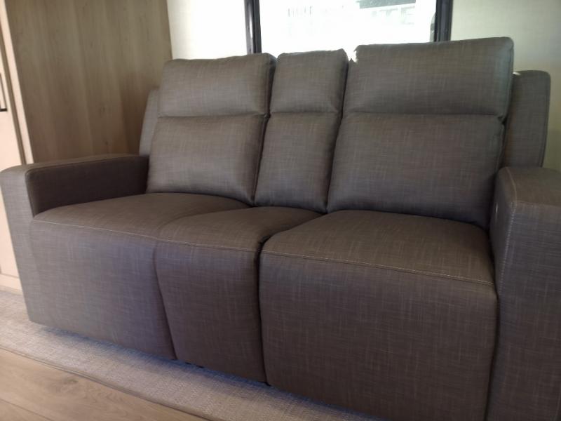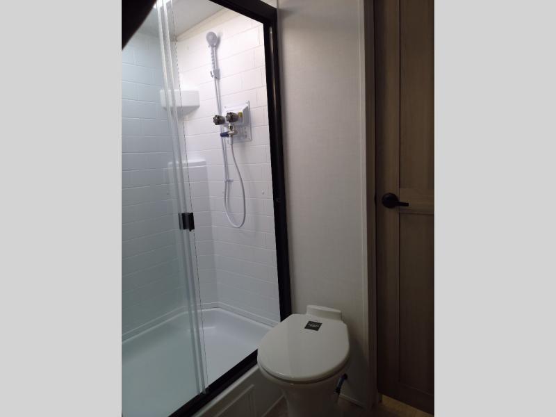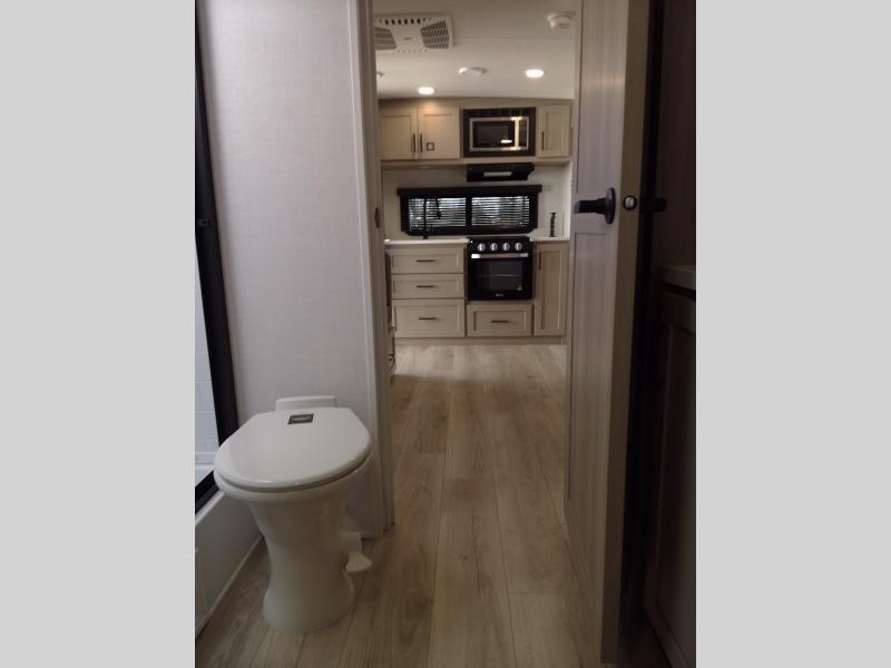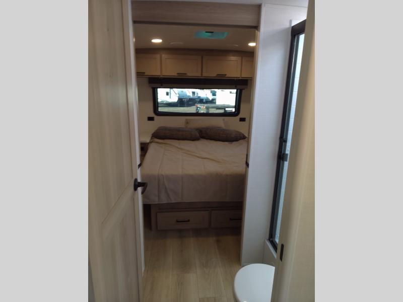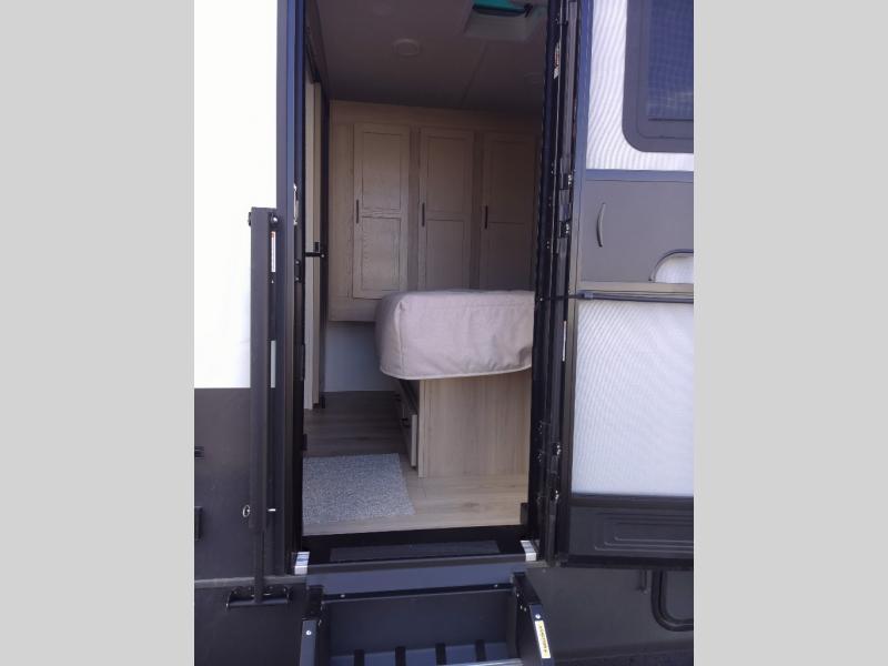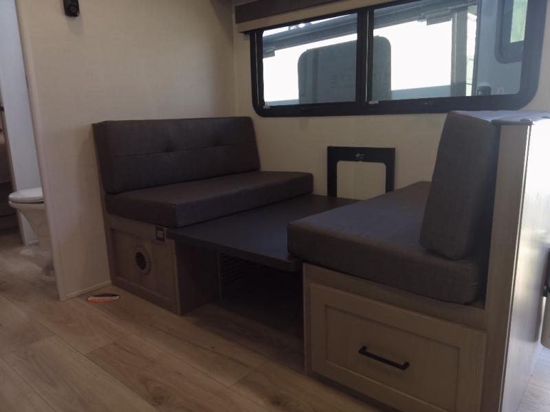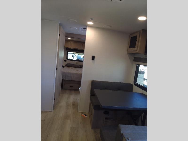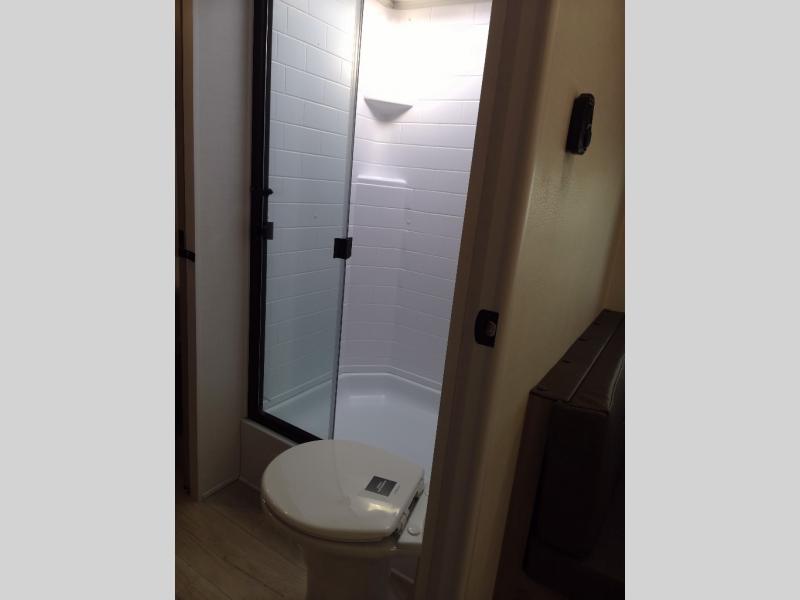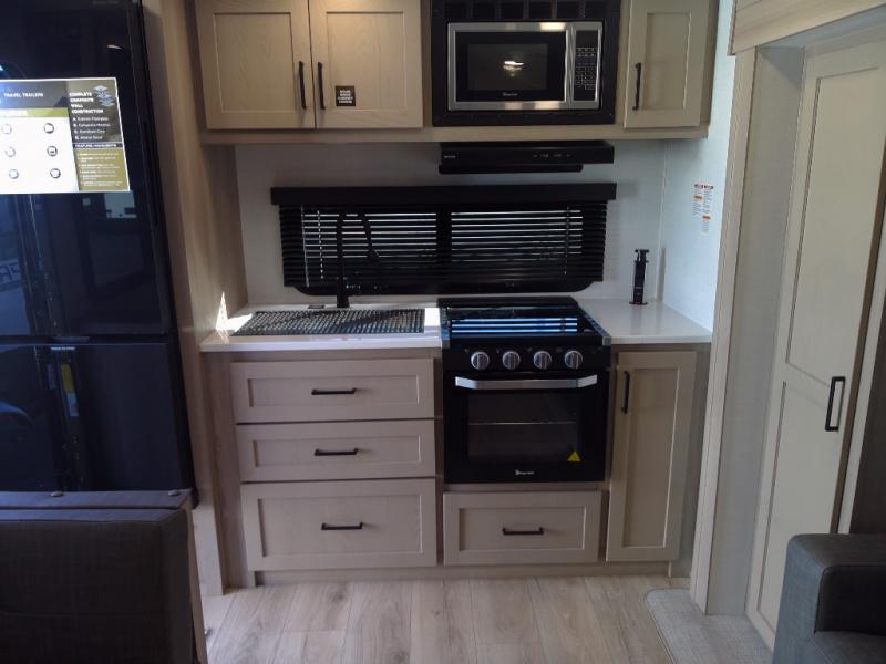You and your spouse will have a great time camping in this travel trailer! You will have your own RV queen bed to sleep on in the front private bedroom, and an optional TV can be added if you enjoy the morning news in bed. Breakfast can be made on the three burner cooktop in the rear kitchen, or head outdoors to cook on the outside griddle. The 67" theater seating with cupholders will provide a place to relax and dine together, and the spacious walk-through bath will allow you to clean up before you head out for the day. This model includes plenty of storage space, including a pantry for your snacks, a wardrobe slide out in the bedroom, plus a drop-frame pass-through storage for larger camp gear!