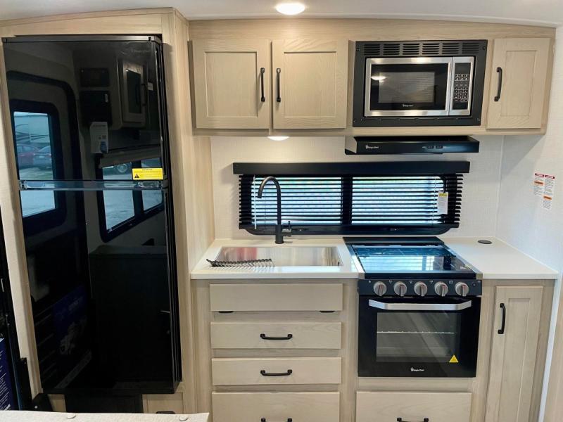 Each Rockwood Mini Lite travel trailer by Forest River is constructed with a fully laminated one-piece walkable roof, sleek frameless windows, and a six-sided full aluminum frame for strength and durability. The 12V thermostatically controlled heated tanks, plus radiant foil in the underbelly will allow you to camp well into the colder months, and the 200W roof solar panel will be perfect for a little off-gridding. Each model includes solid surface kitchen countertops, hidden hinge cabinet doors, roller shades, plus many more interior features. Having an AIR 360+ omnidirectional antenna with WiFi prep on board gives you the option to get some work done if it's needed, and the power tongue jack provides hassle-free set up, so you can enjoy more time relaxing!