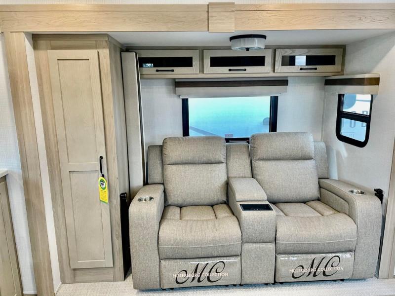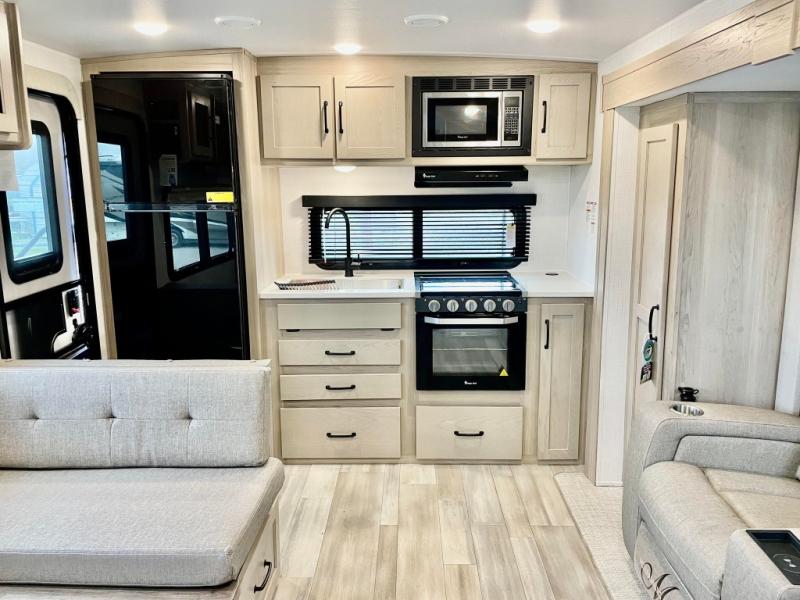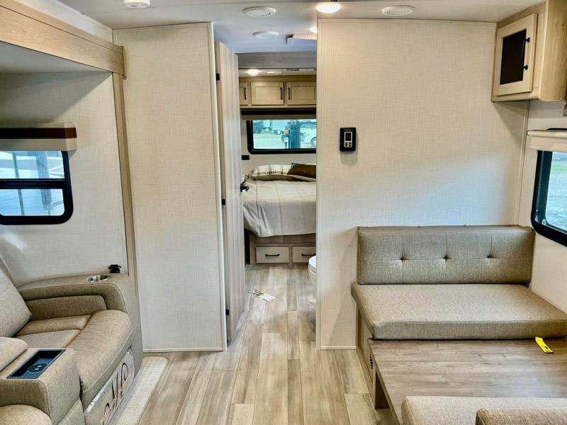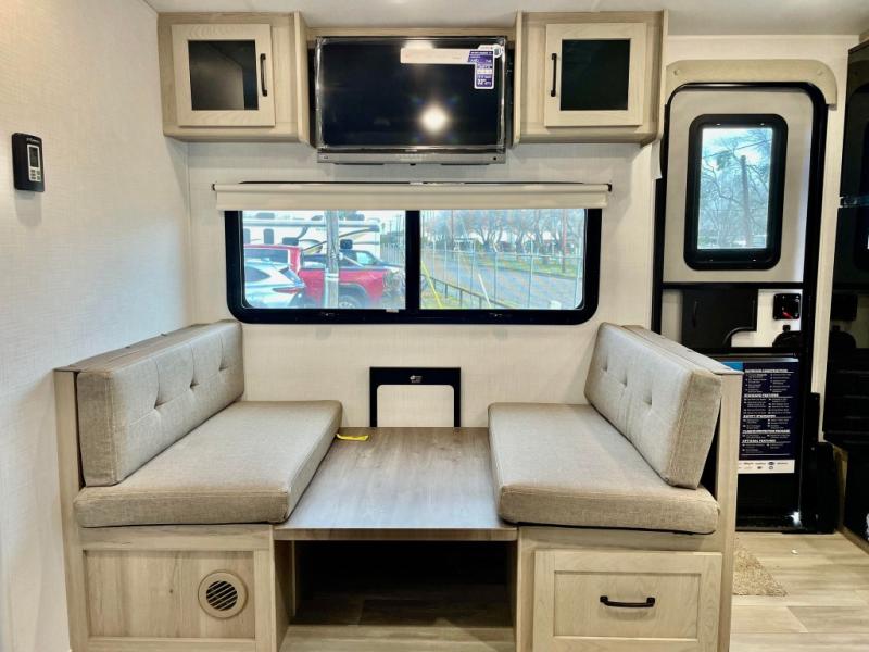 You and your spouse will have a great time camping in this travel trailer! You will have your own RV queen bed to sleep on in the front private bedroom, and an optional TV can be added if you enjoy the morning news in bed. Breakfast can be made on the three burner cooktop in the rear kitchen. The 67" theater seating with cupholders will provide a place to relax and dine together, and the spacious walk-through bath will allow you to clean up before you head out for the day. This model includes plenty of storage space, including a pantry for your snacks, a wardrobe slide out in the bedroom, plus a drop-frame pass-through storage for larger camp gear!