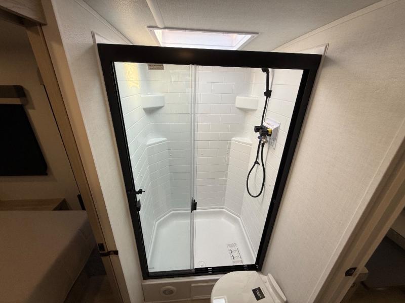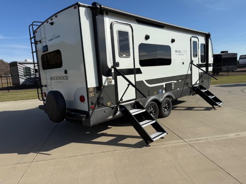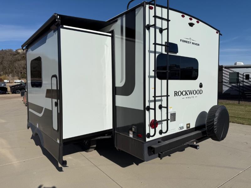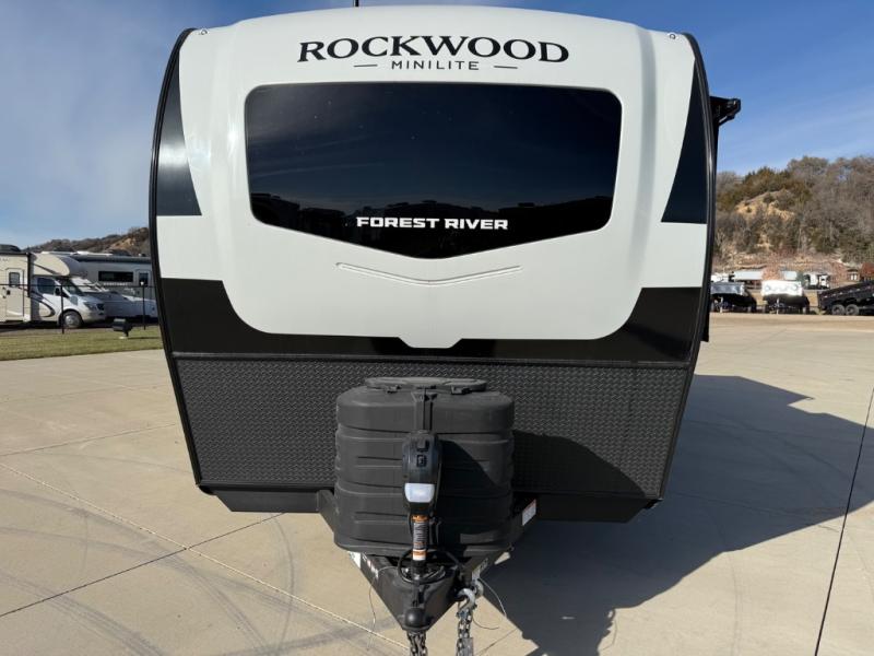 Each Rockwood Mini Lite travel trailer by Forest River is constructed with a fully laminated one-piece walkable roof, sleek frameless windows, and a six-sided full aluminum frame for strength and durability. The 12V thermostatically controlled heated tanks, plus radiant foil in the underbelly will allow you to camp well into the colder months, and the 200W roof solar panel will be perfect for a little off-gridding. Each model includes solid surface kitchen countertops, hidden hinge cabinet doors, roller shades, plus many more interior features. Having an AIR 360+ omnidirectional antenna with WiFi prep on board gives you the option to get some work done if it's needed, and the power tongue jack provides hassle-free set up, so you can enjoy more time relaxing!