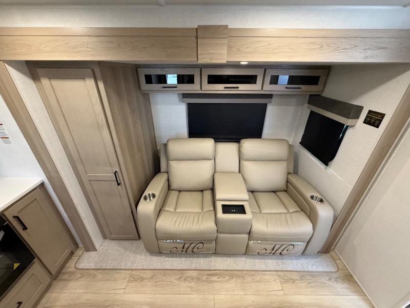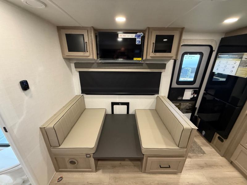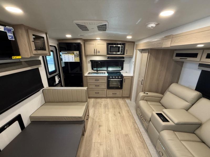 You and your spouse will have a great time camping in this travel trailer! You will have your own RV queen bed to sleep on in the front private bedroom, and an optional TV can be added if you enjoy the morning news in bed. Breakfast can be made on the three burner cooktop in the rear kitchen, or head outdoors to cook on the outside griddle. The 67" theater seating with cupholders will provide a place to relax and dine together, and the spacious walk-through bath will allow you to clean up before you head out for the day. This model includes plenty of storage space, including a pantry for your snacks, a wardrobe slide out in the bedroom, plus a drop-frame pass-through storage for larger camp gear!