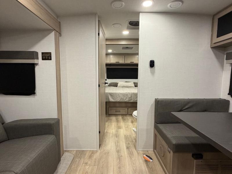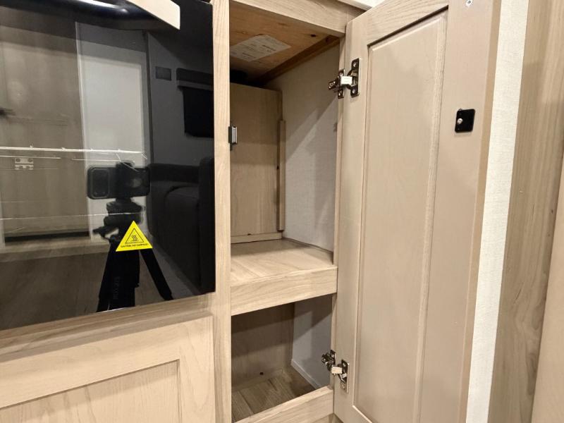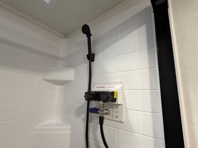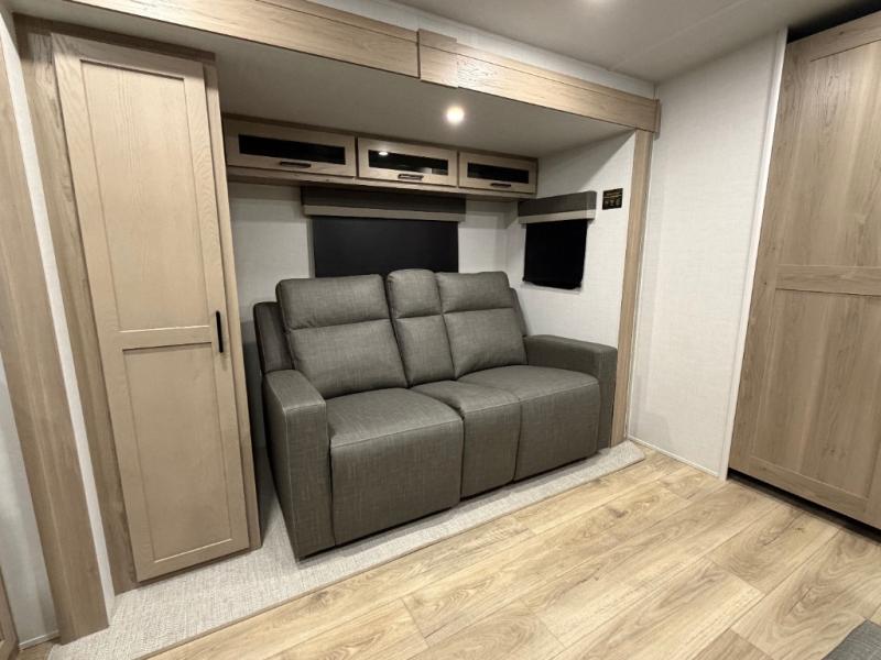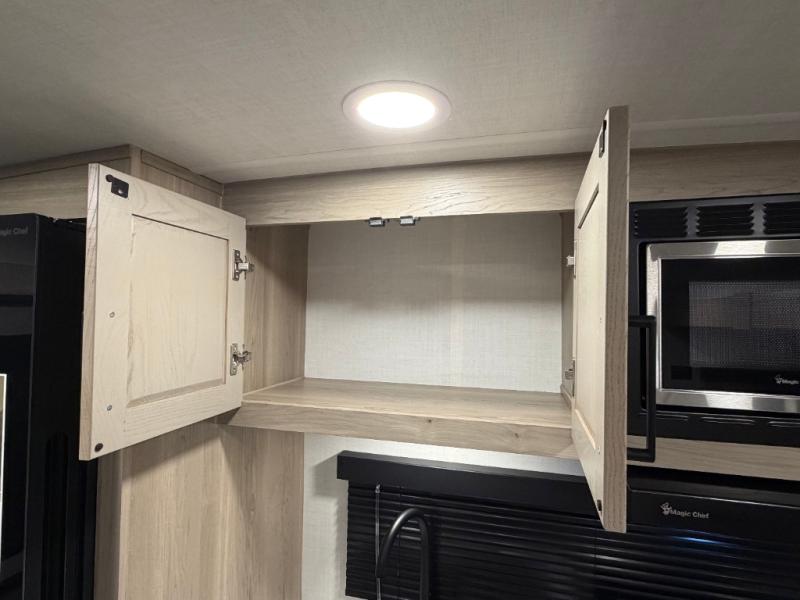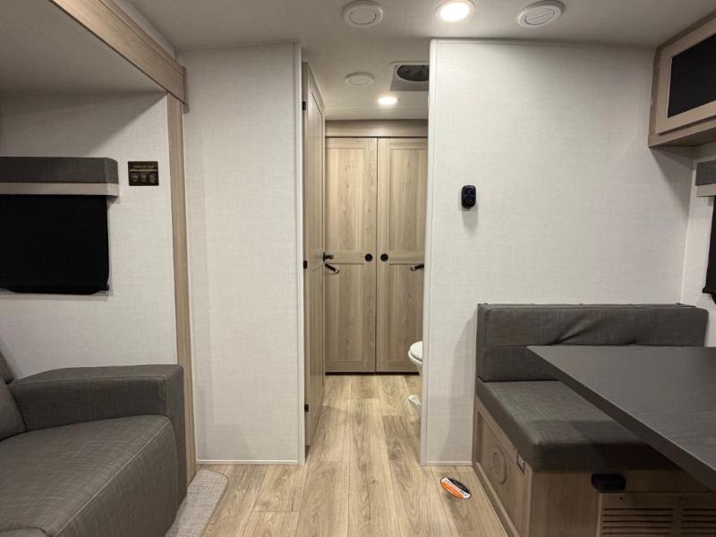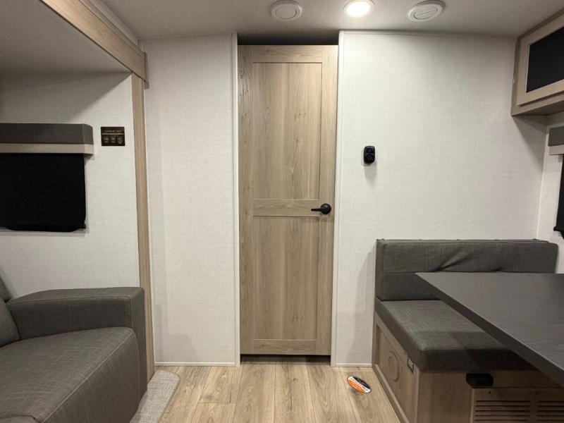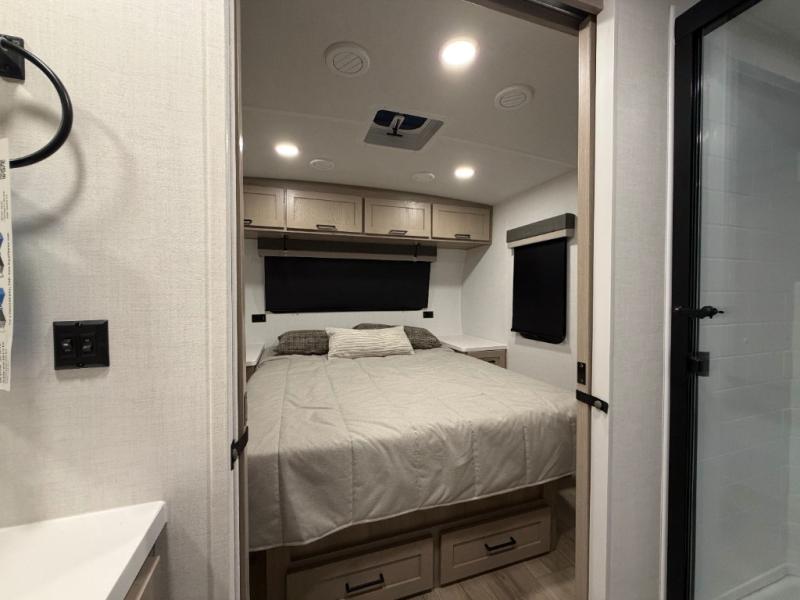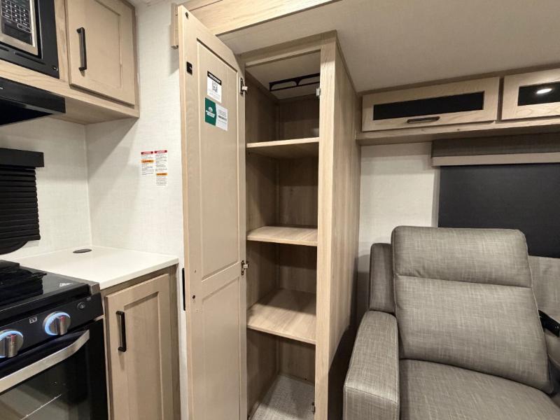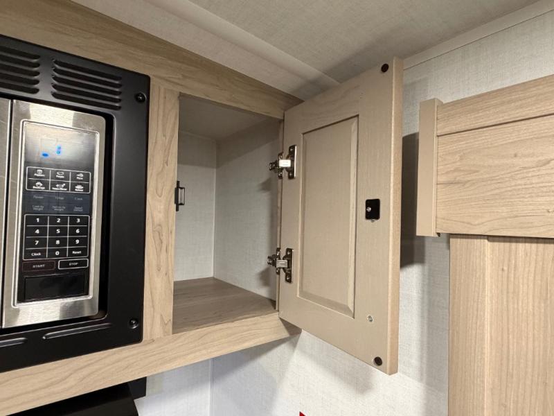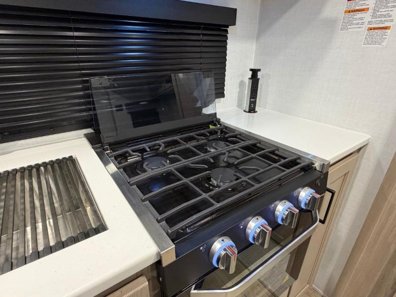 You and your spouse will have a great time camping in this travel trailer! You will have your own RV queen bed to sleep on in the front private bedroom, and an optional TV can be added if you enjoy the morning news in bed. Breakfast can be made on the three burner cooktop in the rear kitchen, or head outdoors to cook on the outside griddle. The 67" theater seating with cupholders will provide a place to relax and dine together, and the spacious walk-through bath will allow you to clean up before you head out for the day. This model includes plenty of storage space, including a pantry for your snacks, a wardrobe slide out in the bedroom, plus a drop-frame pass-through storage for larger camp gear!