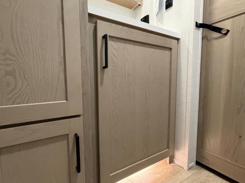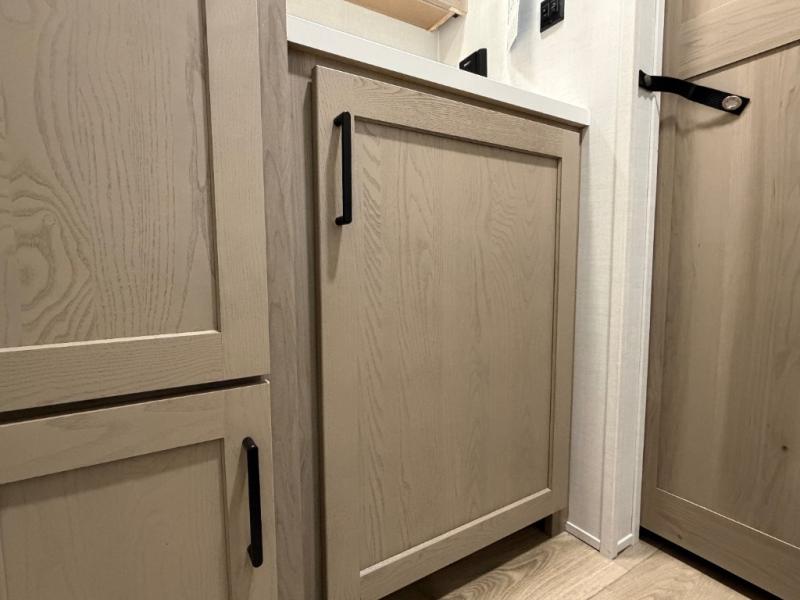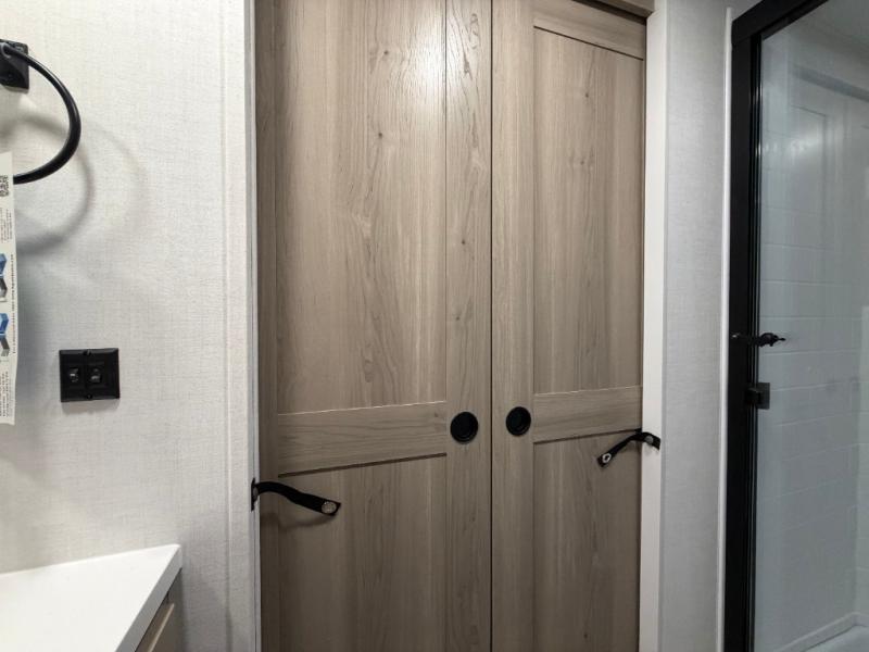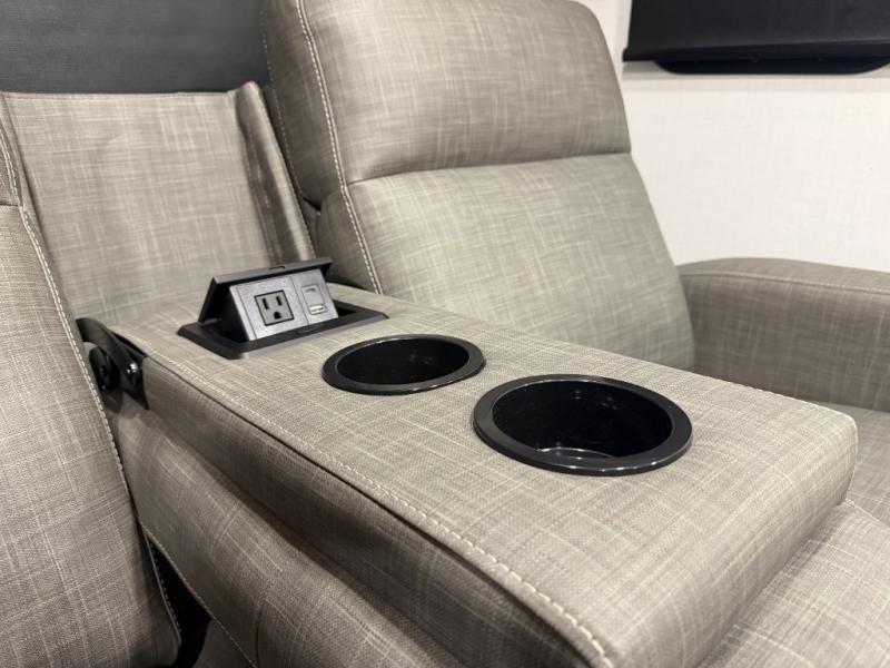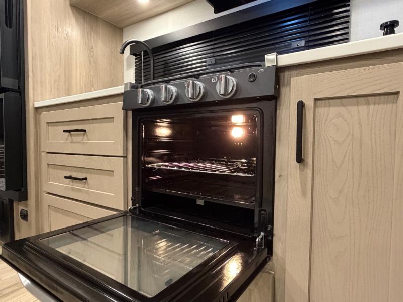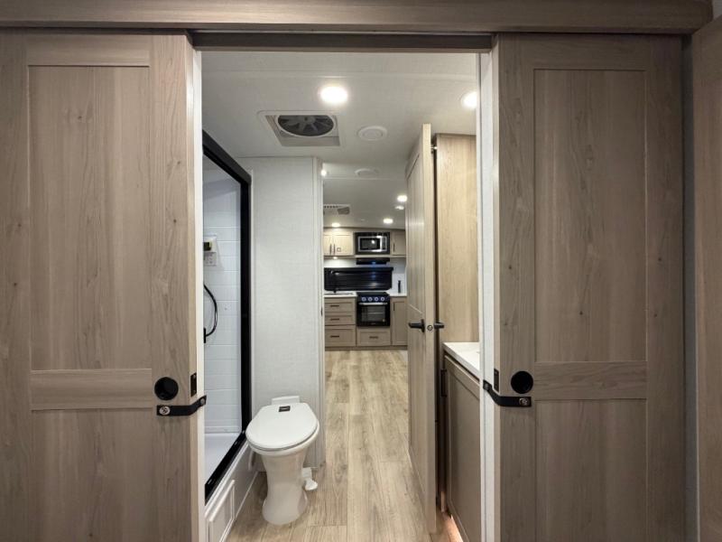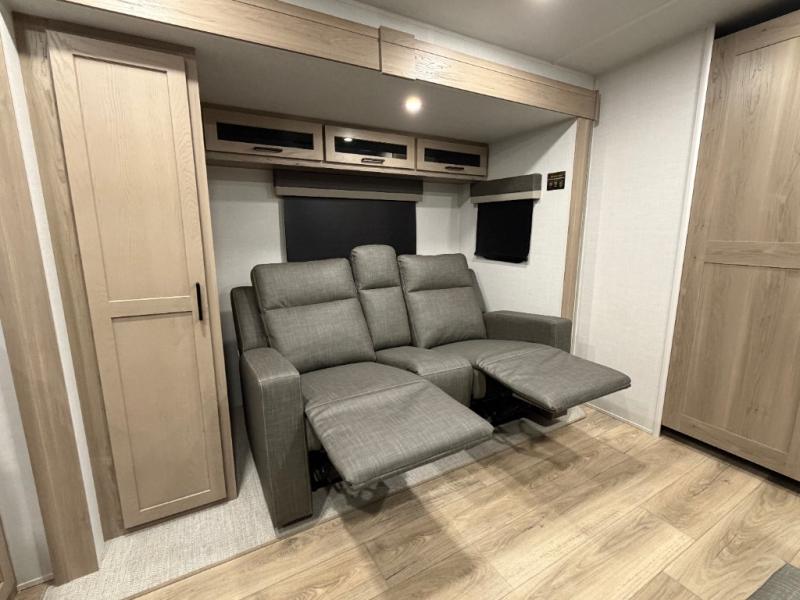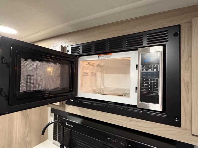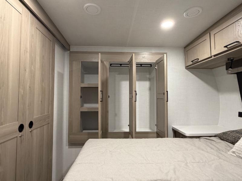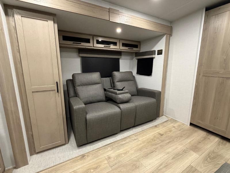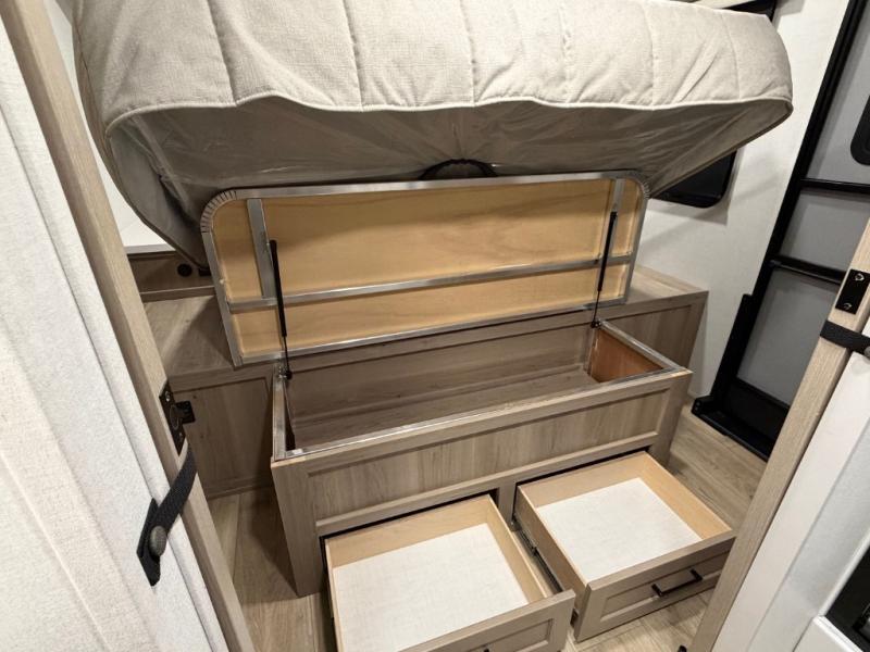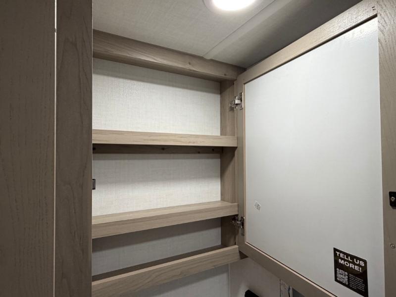 You and your spouse will have a great time camping in this travel trailer! You will have your own RV queen bed to sleep on in the front private bedroom, and an optional TV can be added if you enjoy the morning news in bed. Breakfast can be made on the three burner cooktop in the rear kitchen, or head outdoors to cook on the outside griddle. The 67" theater seating with cupholders will provide a place to relax and dine together, and the spacious walk-through bath will allow you to clean up before you head out for the day. This model includes plenty of storage space, including a pantry for your snacks, a wardrobe slide out in the bedroom, plus a drop-frame pass-through storage for larger camp gear!