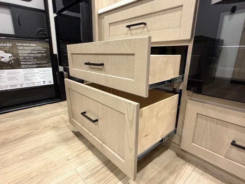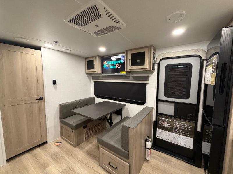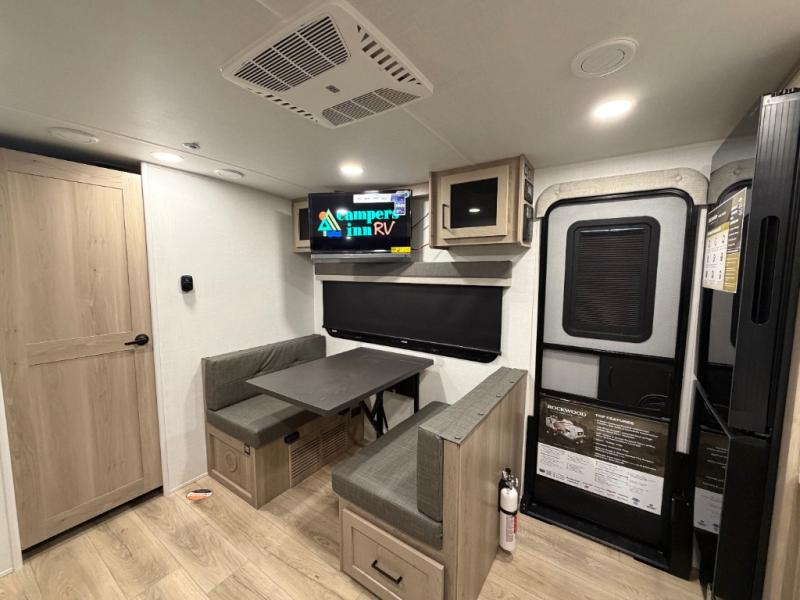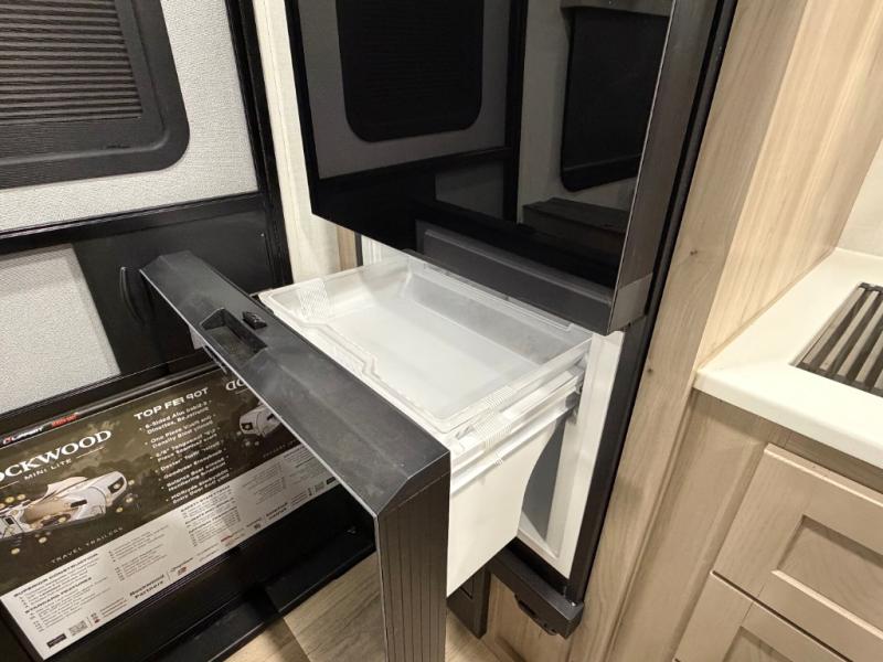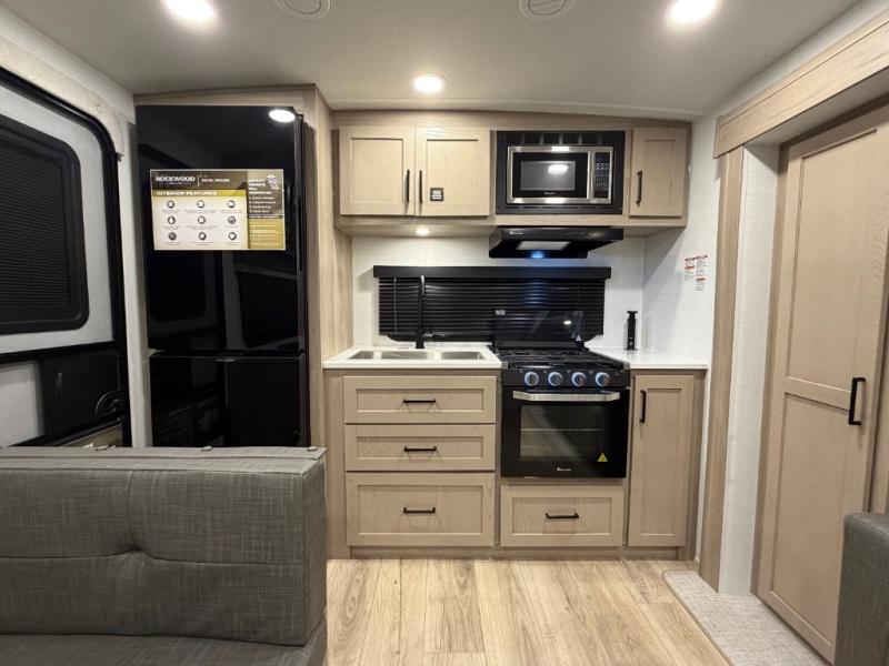 Each Rockwood Mini Lite travel trailer by Forest River is constructed with a fully laminated one-piece walkable roof, sleek frameless windows, and a six-sided full aluminum frame for strength and durability. The 12V thermostatically controlled heated tanks, plus radiant foil in the underbelly will allow you to camp well into the colder months, and the 200W roof solar panel will be perfect for a little off-gridding. Each model includes solid surface kitchen countertops, hidden hinge cabinet doors, roller shades, plus many more interior features. Having an AIR 360+ omnidirectional antenna with WiFi prep on board gives you the option to get some work done if it's needed, and the power tongue jack provides hassle-free set up, so you can enjoy more time relaxing!