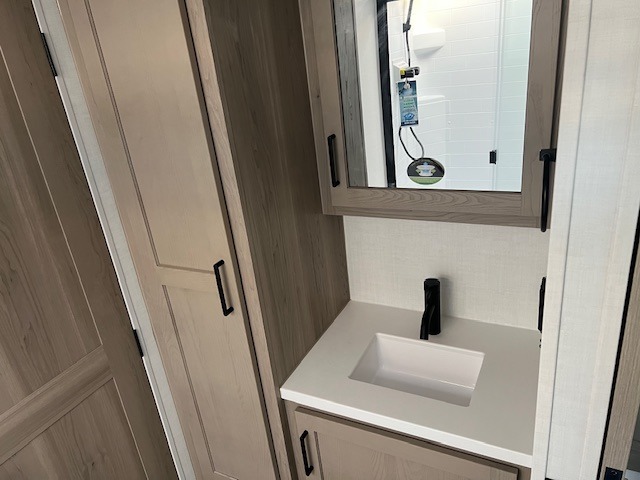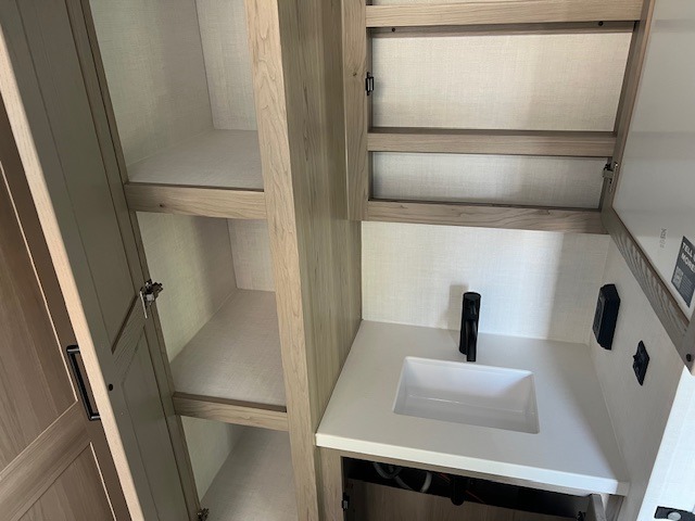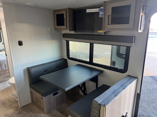 You and your spouse will have a great time camping in this travel trailer! You will have your own RV queen bed to sleep on in the front private bedroom, and an optional TV can be added if you enjoy the morning news in bed. Breakfast can be made on the three burner cooktop in the rear kitchen. The 67" theater seating with cupholders will provide a place to relax and dine together, and the spacious walk-through bath will allow you to clean up before you head out for the day. This model includes plenty of storage space, including a pantry for your snacks, a wardrobe slide out in the bedroom, plus a drop-frame pass-through storage for larger camp gear!