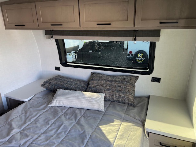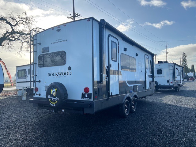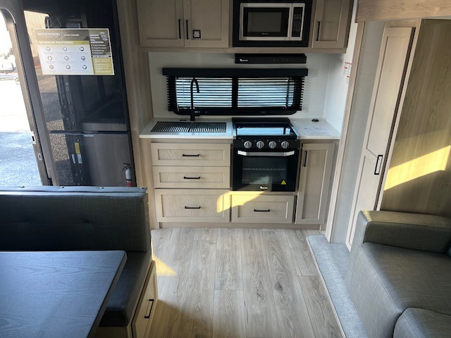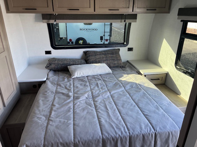 Each Rockwood Mini Lite travel trailer by Forest River is constructed with a fully laminated one-piece walkable roof, sleek frameless windows, and a six-sided full aluminum frame for strength and durability. The 12V thermostatically controlled heated tanks, plus radiant foil in the underbelly will allow you to camp well into the colder months, and the 200W roof solar panel will be perfect for a little off-gridding. Each model includes solid surface kitchen countertops, hidden hinge cabinet doors, roller shades, plus many more interior features. Having an AIR 360+ omnidirectional antenna with WiFi prep on board gives you the option to get some work done if it's needed, and the power tongue jack provides hassle-free set up, so you can enjoy more time relaxing!