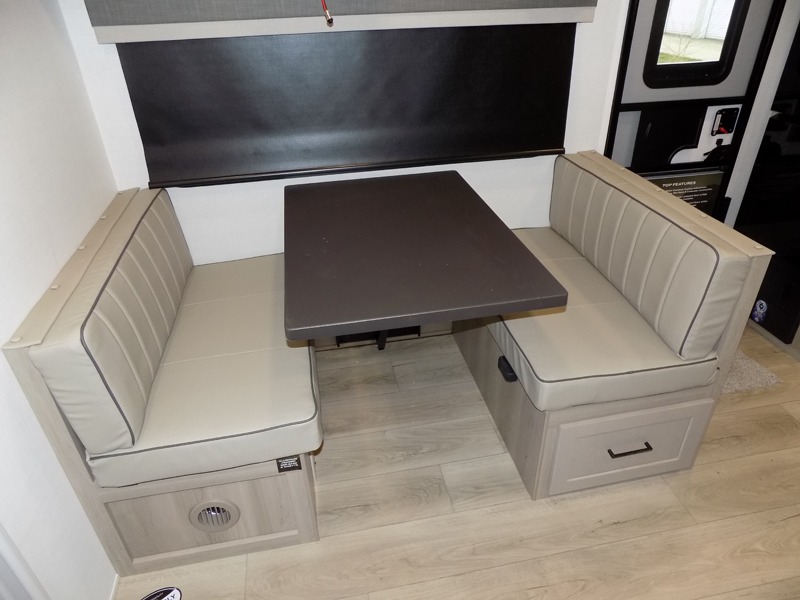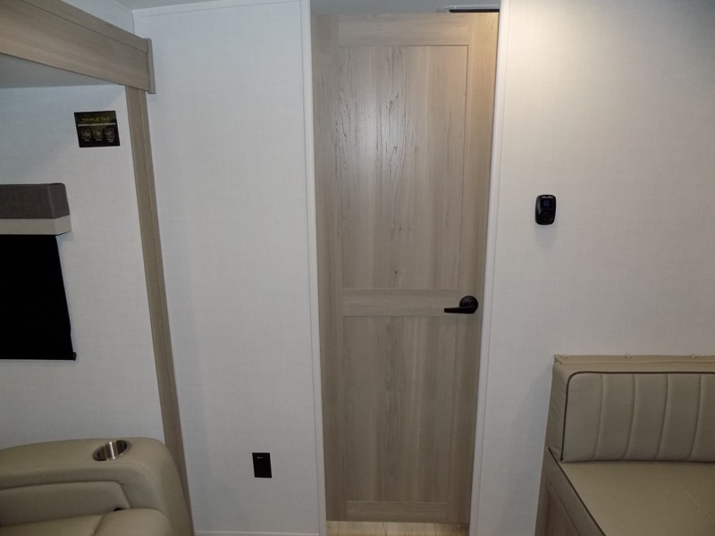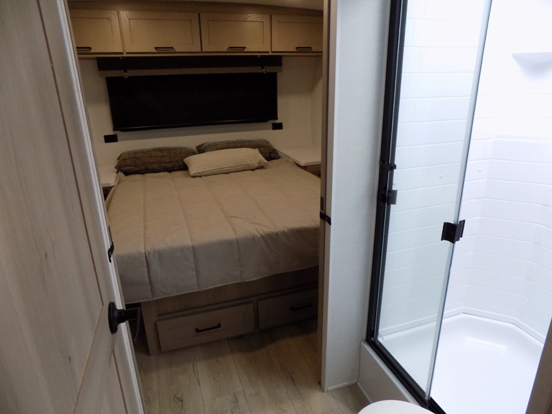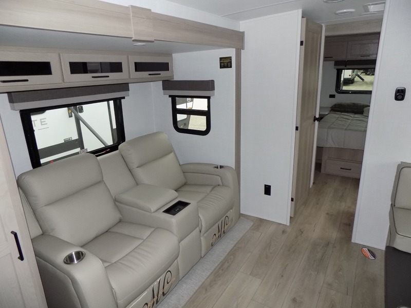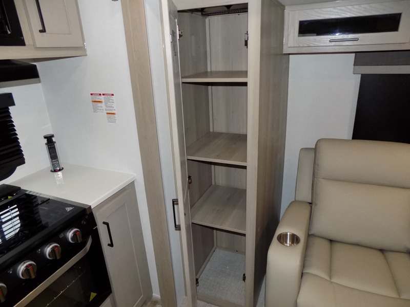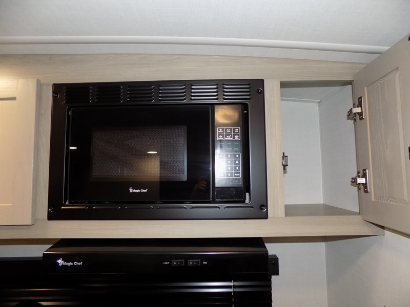 You and your spouse will have a great time camping in this travel trailer! You will have your own RV queen bed to sleep on in the front private bedroom, and an optional TV can be added if you enjoy the morning news in bed. Breakfast can be made on the three burner cooktop in the rear kitchen. The 67" theater seating with cupholders will provide a place to relax and dine together, and the spacious walk-through bath will allow you to clean up before you head out for the day. This model includes plenty of storage space, including a pantry for your snacks, a wardrobe slide out in the bedroom, plus a drop-frame pass-through storage for larger camp gear!