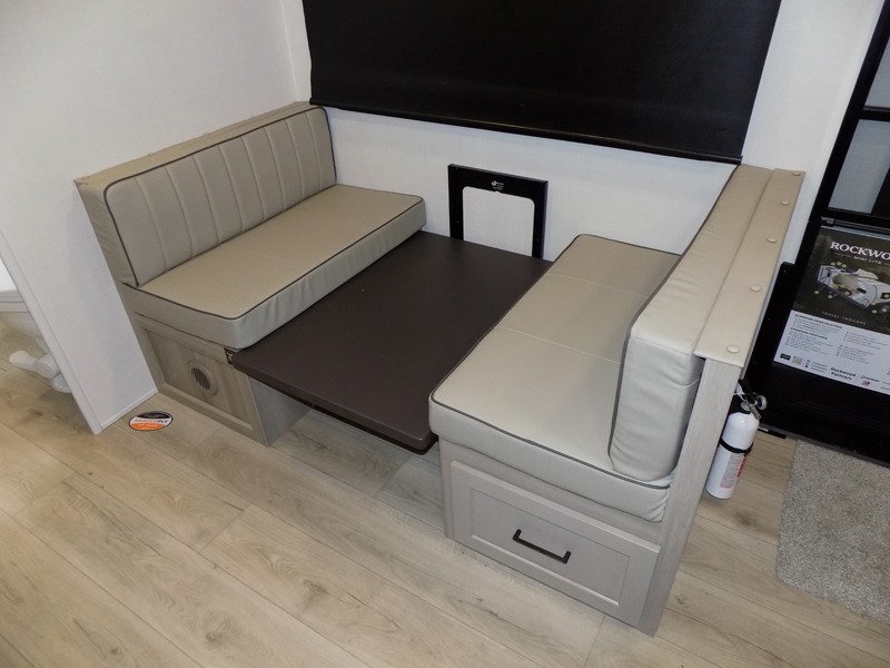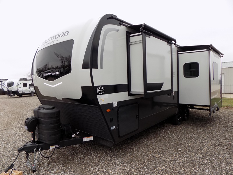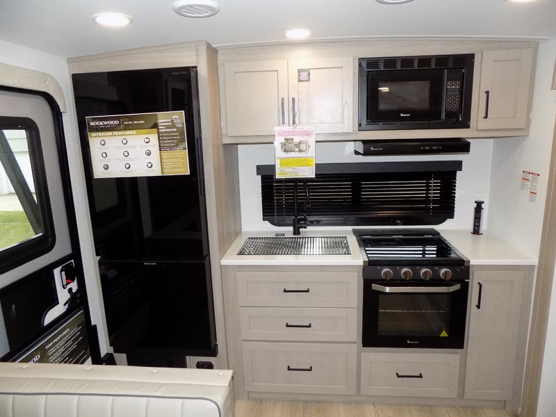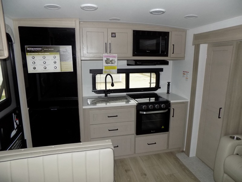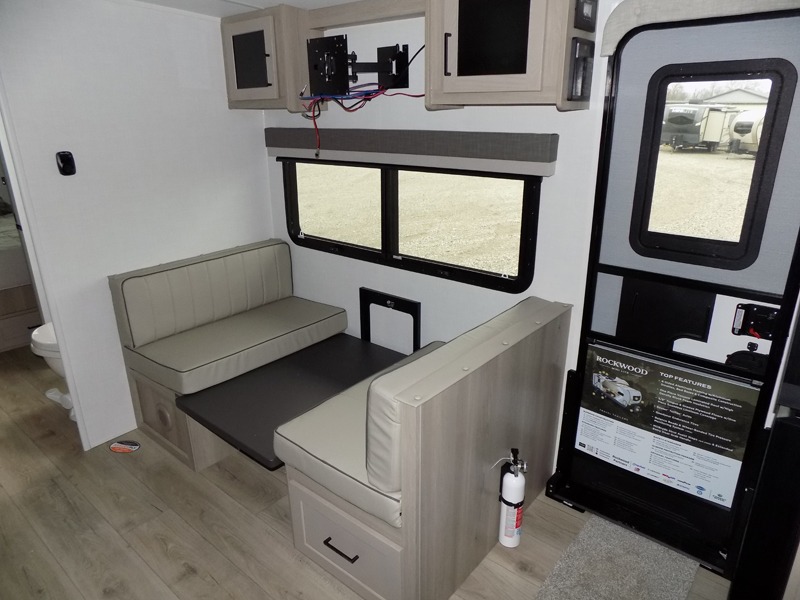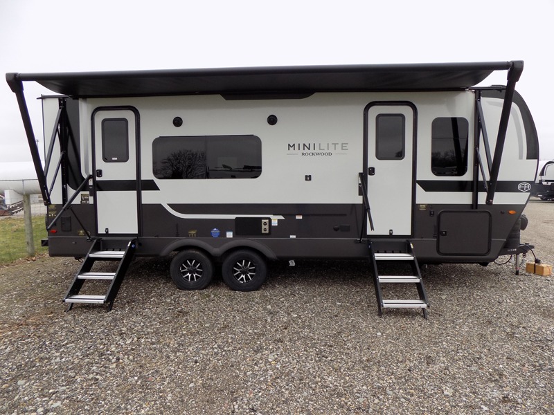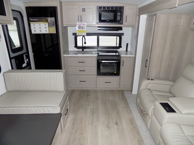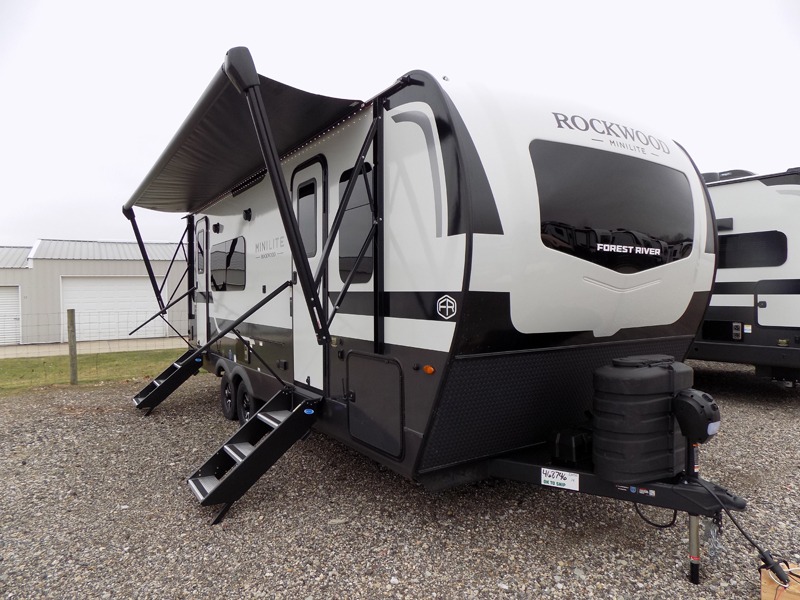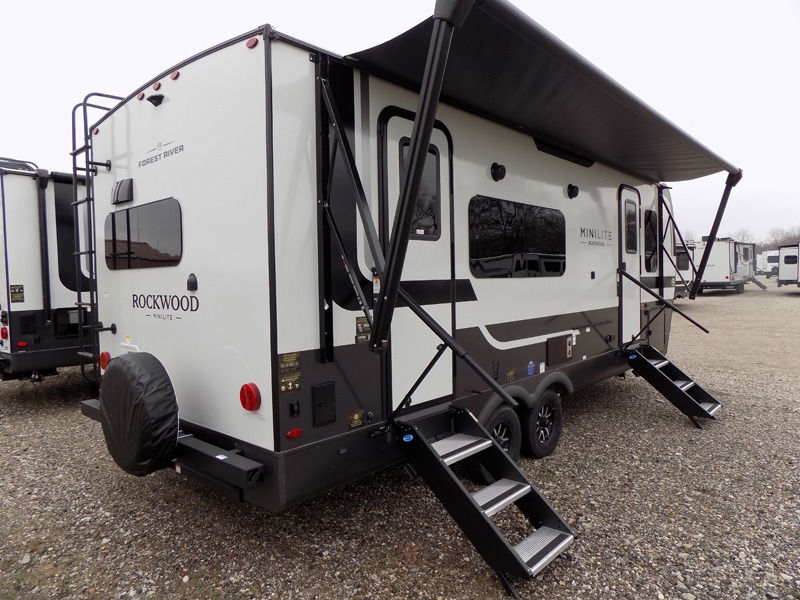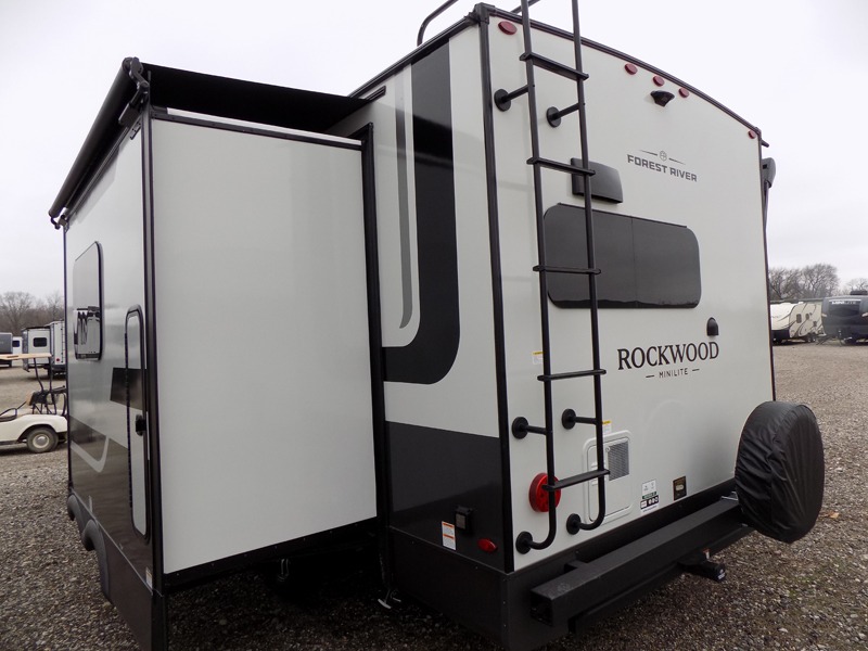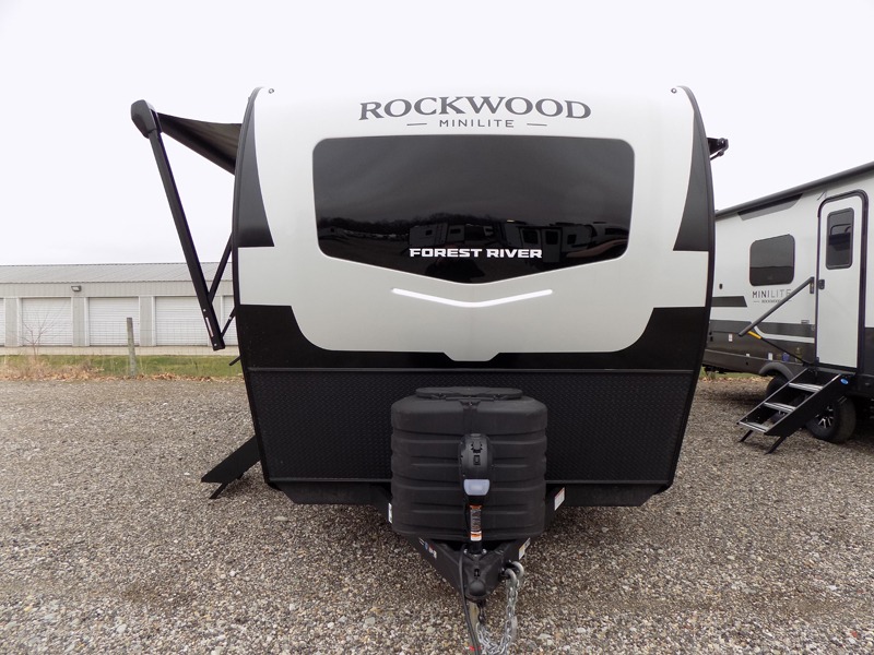 Each Rockwood Mini Lite travel trailer by Forest River is constructed with a fully laminated one-piece walkable roof, sleek frameless windows, and a six-sided full aluminum frame for strength and durability. The 12V thermostatically controlled heated tanks, plus radiant foil in the underbelly will allow you to camp well into the colder months, and the 200W roof solar panel will be perfect for a little off-gridding. Each model includes solid surface kitchen countertops, hidden hinge cabinet doors, roller shades, plus many more interior features. Having an AIR 360+ omnidirectional antenna with WiFi prep on board gives you the option to get some work done if it's needed, and the power tongue jack provides hassle-free set up, so you can enjoy more time relaxing!