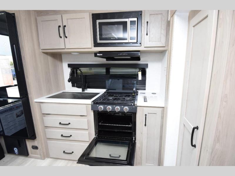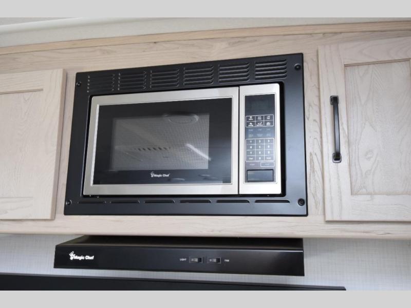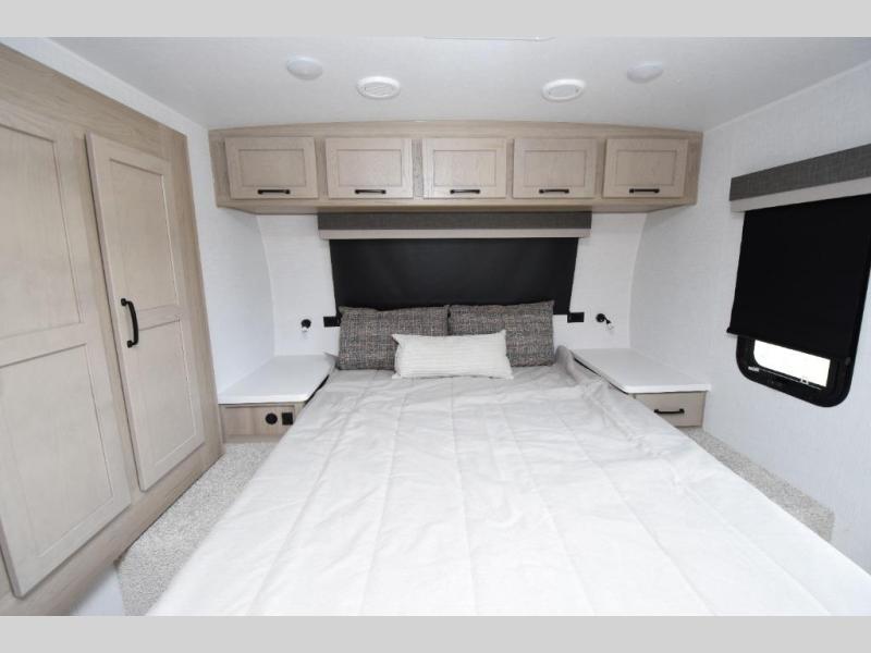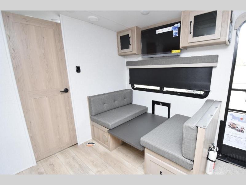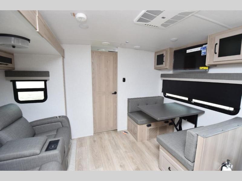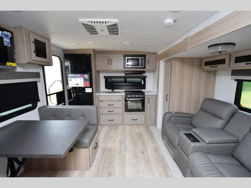 You and your spouse will have a great time camping in this travel trailer! You will have your own RV queen bed to sleep on in the front private bedroom, and an optional TV can be added if you enjoy the morning news in bed. Breakfast can be made on the three burner cooktop in the rear kitchen. The 67" theater seating with cupholders will provide a place to relax and dine together, and the spacious walk-through bath will allow you to clean up before you head out for the day. This model includes plenty of storage space, including a pantry for your snacks, a wardrobe slide out in the bedroom, plus a drop-frame pass-through storage for larger camp gear!