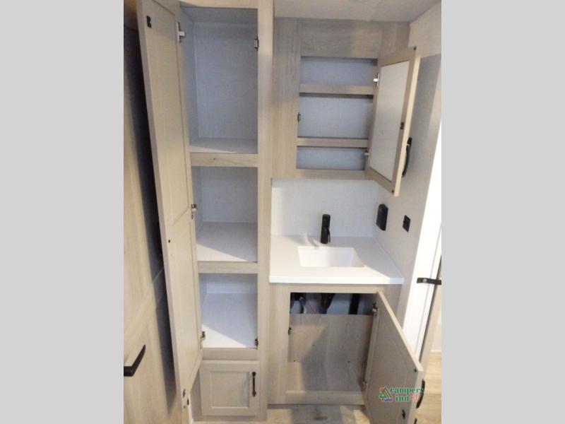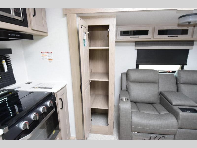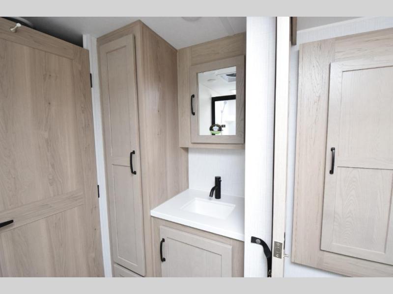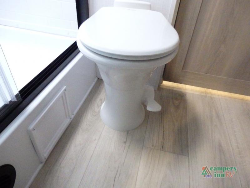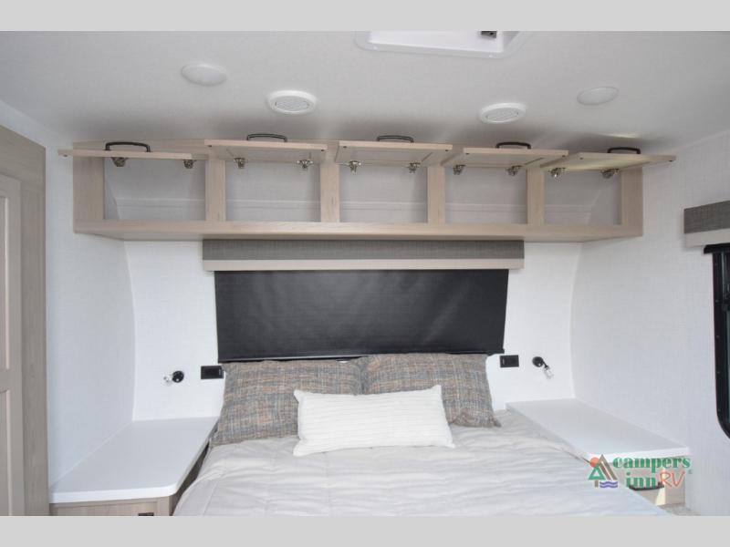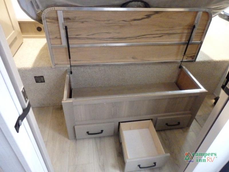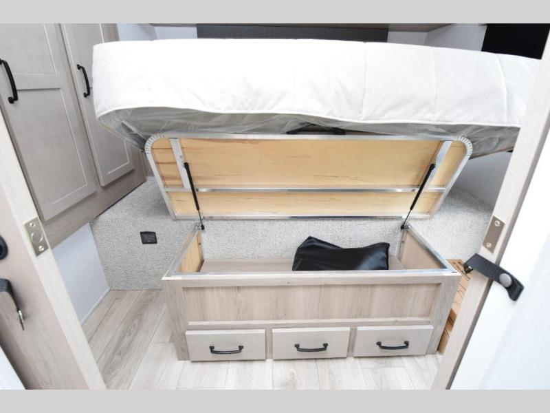 You and your spouse will have a great time camping in this travel trailer! You will have your own RV queen bed to sleep on in the front private bedroom, and an optional TV can be added if you enjoy the morning news in bed. Breakfast can be made on the three burner cooktop in the rear kitchen. The 67" theater seating with cupholders will provide a place to relax and dine together, and the spacious walk-through bath will allow you to clean up before you head out for the day. This model includes plenty of storage space, including a pantry for your snacks, a wardrobe slide out in the bedroom, plus a drop-frame pass-through storage for larger camp gear!