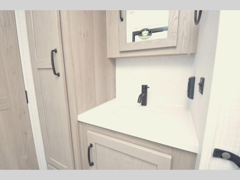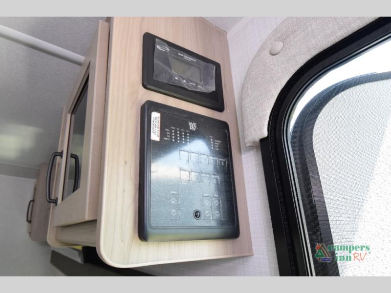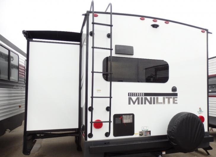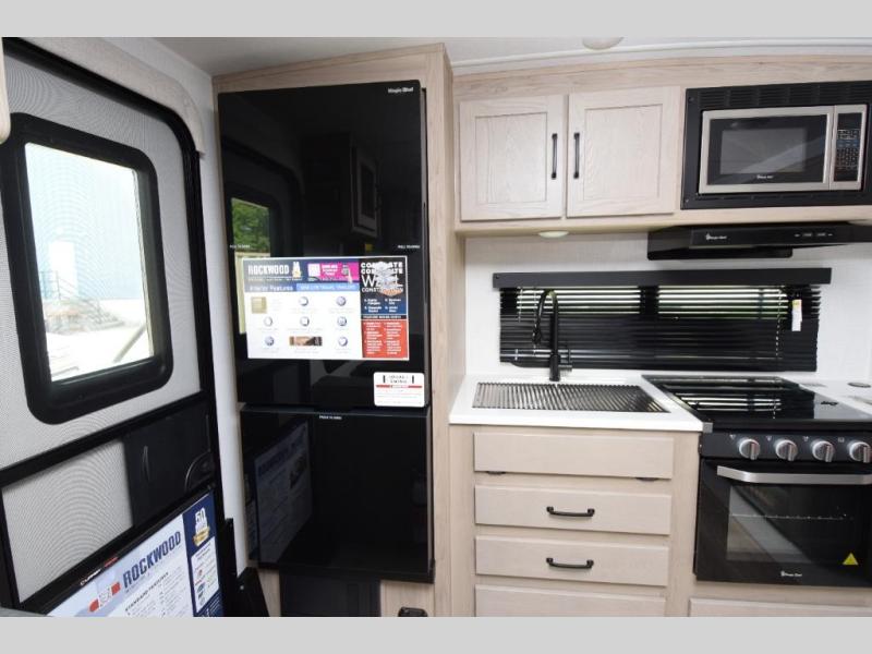 Each Rockwood Mini Lite travel trailer by Forest River is constructed with a fully laminated one-piece walkable roof, sleek frameless windows, and a six-sided full aluminum frame for strength and durability. The 12V thermostatically controlled heated tanks, plus radiant foil in the underbelly will allow you to camp well into the colder months, and the 200W roof solar panel will be perfect for a little off-gridding. Each model includes solid surface kitchen countertops, hidden hinge cabinet doors, roller shades, plus many more interior features. Having an AIR 360+ omnidirectional antenna with WiFi prep on board gives you the option to get some work done if it's needed, and the power tongue jack provides hassle-free set up, so you can enjoy more time relaxing!