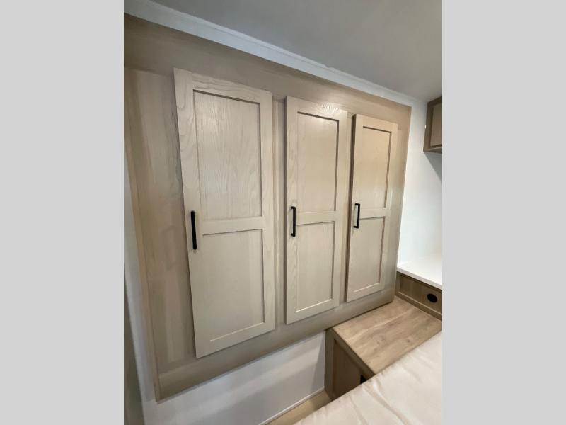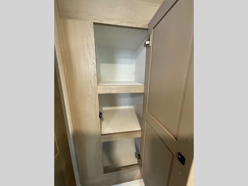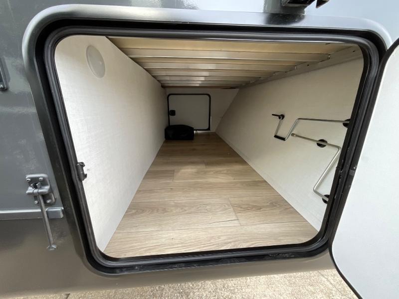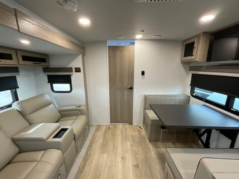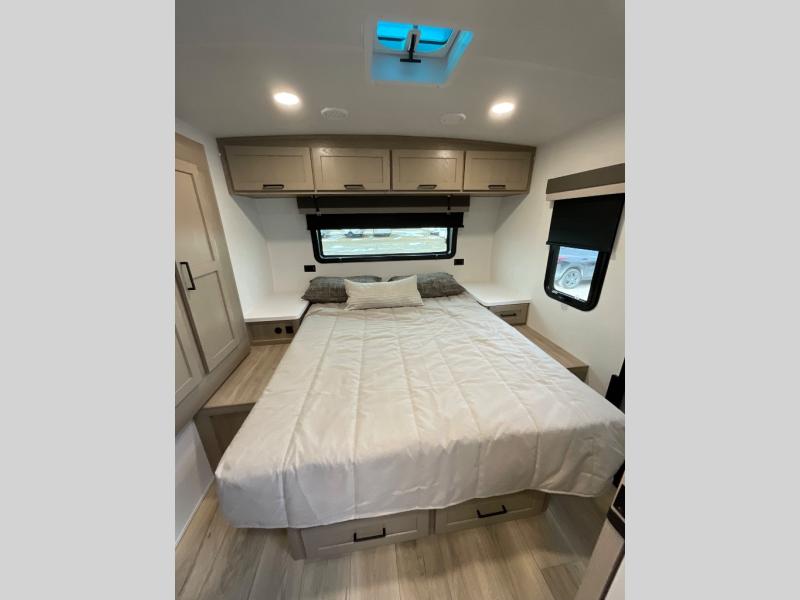 You and your spouse will have a great time camping in this travel trailer! You will have your own RV queen bed to sleep on in the front private bedroom, and an optional TV can be added if you enjoy the morning news in bed. Breakfast can be made on the three burner cooktop in the rear kitchen. The 67" theater seating with cupholders will provide a place to relax and dine together, and the spacious walk-through bath will allow you to clean up before you head out for the day. This model includes plenty of storage space, including a pantry for your snacks, a wardrobe slide out in the bedroom, plus a drop-frame pass-through storage for larger camp gear!