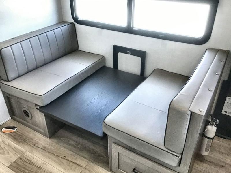 You and your spouse will have a great time camping in this travel trailer! You will have your own RV queen bed to sleep on in the front private bedroom, and an optional TV can be added if you enjoy the morning news in bed. Breakfast can be made on the three burner cooktop in the rear kitchen, or head outdoors to cook on the outside griddle. The 67" theater seating with cupholders will provide a place to relax and dine together, and the spacious walk-through bath will allow you to clean up before you head out for the day. This model includes plenty of storage space, including a pantry for your snacks, a wardrobe slide out in the bedroom, plus a drop-frame pass-through storage for larger camp gear!