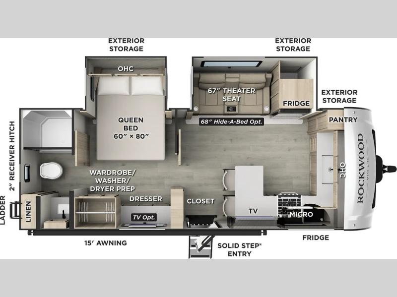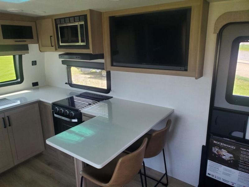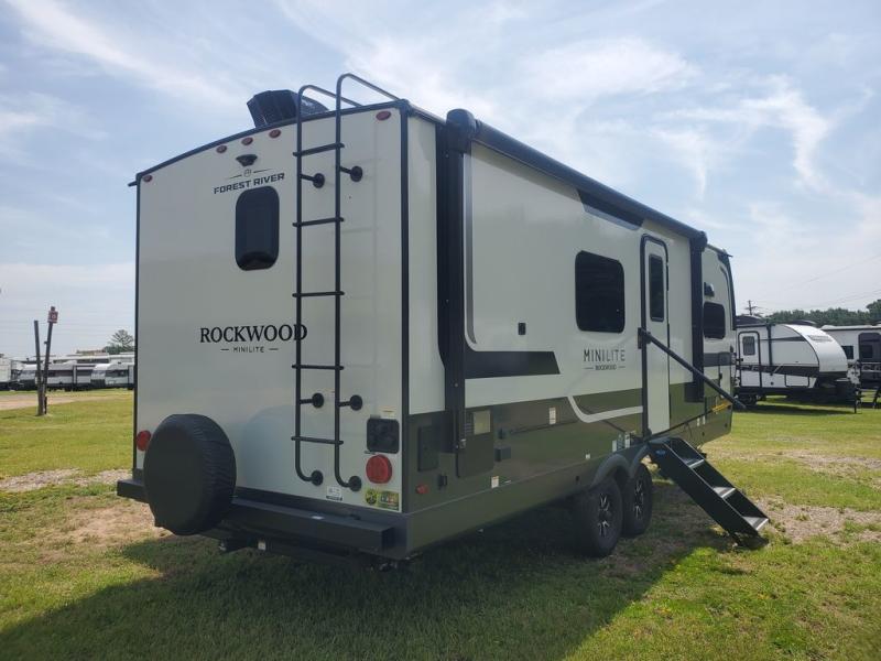Each Rockwood Mini Lite travel trailer by Forest River is constructed with a fully laminated one-piece walkable roof, sleek frameless windows, and a six-sided full aluminum frame for strength and durability. The 12V thermostatically controlled heated tanks, plus radiant foil in the underbelly and slide out floors will allow you to camp well into the colder months, and the 200W roof solar panel will be perfect for a little off-gridding. Each model includes solid surface kitchen countertops, solid wood cabinet doors, night roller shades, plus many more interior features. Having an AIR 360+ omnidirectional antenna with WiFi prep on board gives you the option to get some work done if it's needed, and the power tongue jack provides hassle-free set up, so you can enjoy more time relaxing!