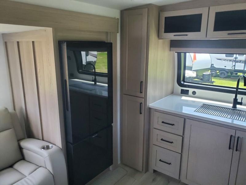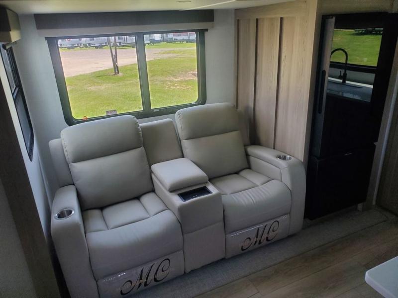 Pick your favorite campground to take this travel trailer to! Once you arrive, unload your gear from the exterior drop-frame pass-through storage, then start lunch on either the exterior griddle or the three burner cooktop inside. If you need a rest after traveling all day, the RV queen bed with flip-up storage in the front bedroom is sure to give you comfort, or you can relax on the 67" theater seating. The entertainment center will make this space feel just like home, and check out the spacious full rear bath for added privacy. This model also includes a 20' power awning to relax underneath rain or shine!