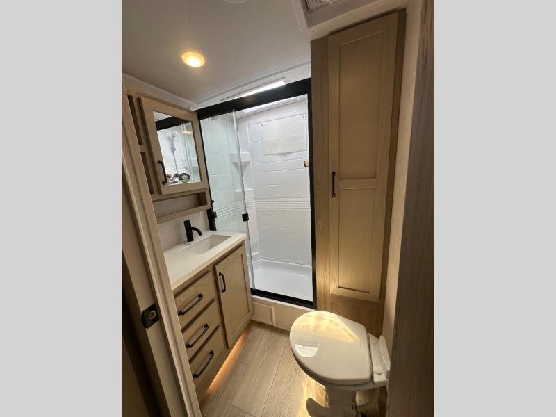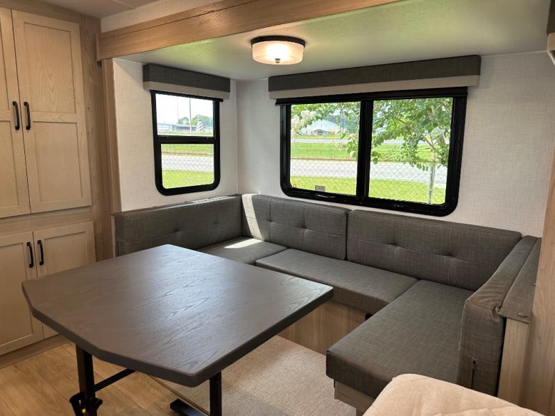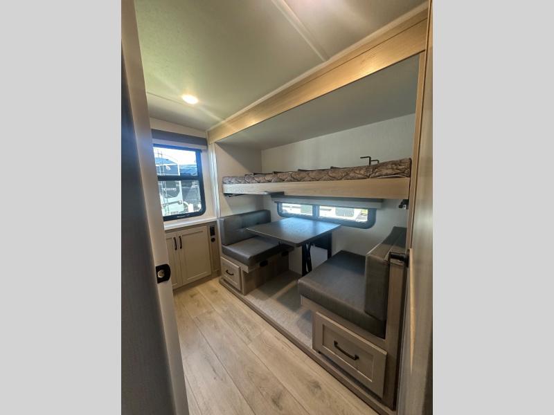 This trailer is one the whole crew will love! Start unloading the pass-thru storage when you arrive at your campsite, then put out the 18' power awning and start lunch on the exterior griddle. There is a full bath inside when you need to freshen up, and the fully-equipped interior kitchen can be used if the weather isn't cooperating with your plans. A U-shaped dinette slide provides a place to dine together and play board games, and two guests can sleep here at night. Speaking of nighttime, there is also a private bunkhouse in the back with a Dream Dinette and flip-up bunk plus a slide out for more space and an optional TV. You'll find your own space up front on the RV queen Murphy bed, complete with dual wardrobes and a privacy curtain when you need to get dressed. And in the morning you can fold away the bed to relax on the 74" sofa!