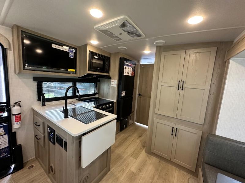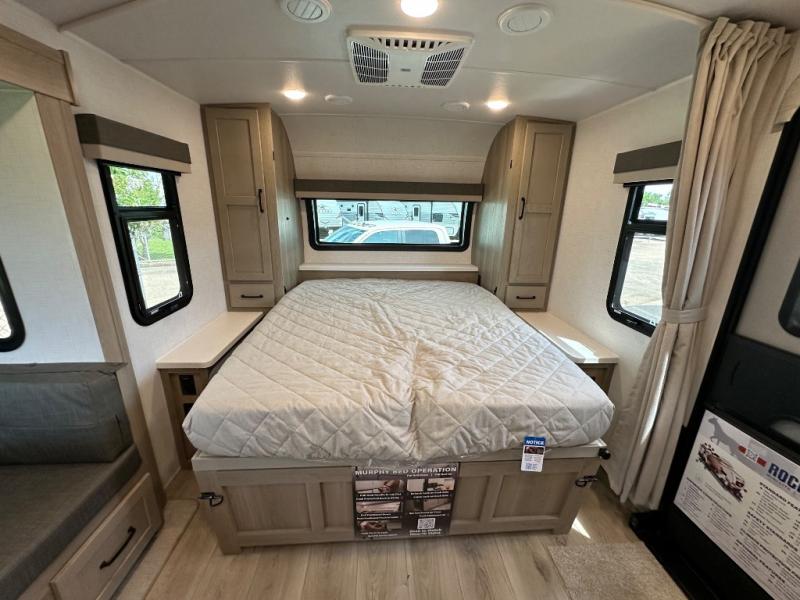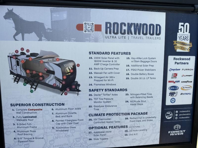 Each Rockwood Mini Lite travel trailer by Forest River is constructed with a fully laminated one-piece walkable roof, sleek frameless windows, and a six-sided full aluminum frame for strength and durability. The 12V thermostatically controlled heated tanks, plus radiant foil in the underbelly and slide out floors will allow you to camp well into the colder months, and the 200W roof solar panel will be perfect for a little off-gridding. Each model includes solid surface kitchen countertops, solid wood cabinet doors, night roller shades, plus many more interior features. Having an AIR 360+ omnidirectional antenna with WiFi prep on board gives you the option to get some work done if it's needed, and the power tongue jack provides hassle-free set up, so you can enjoy more time relaxing!