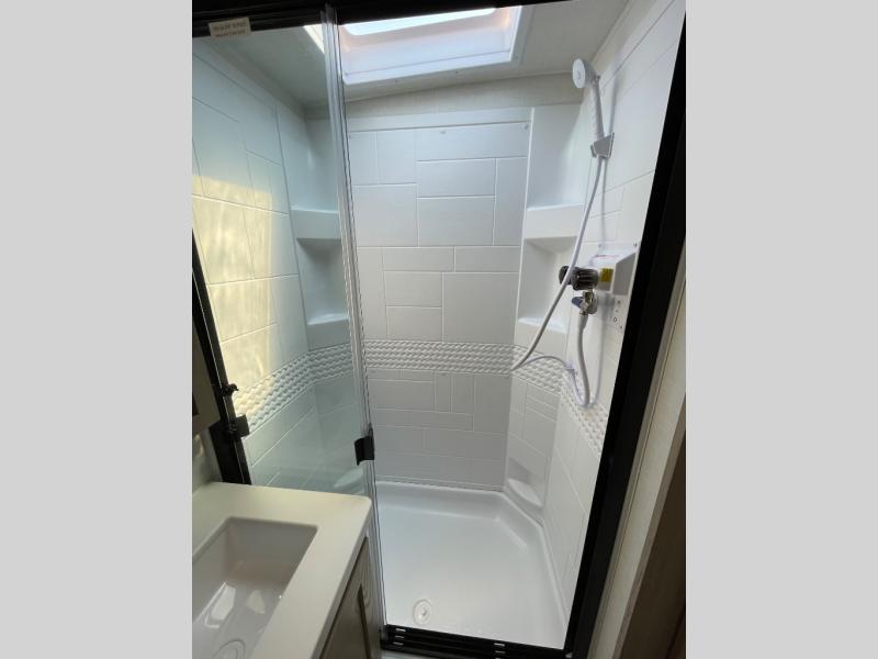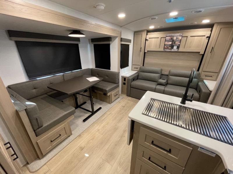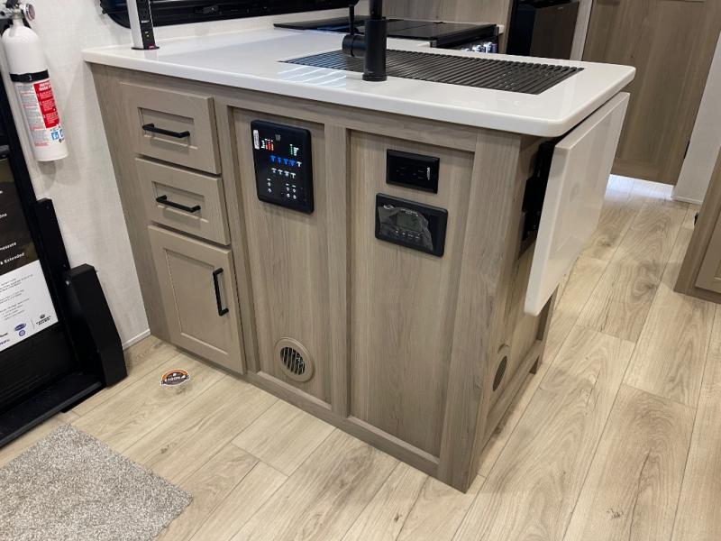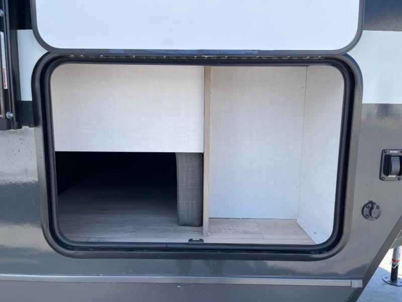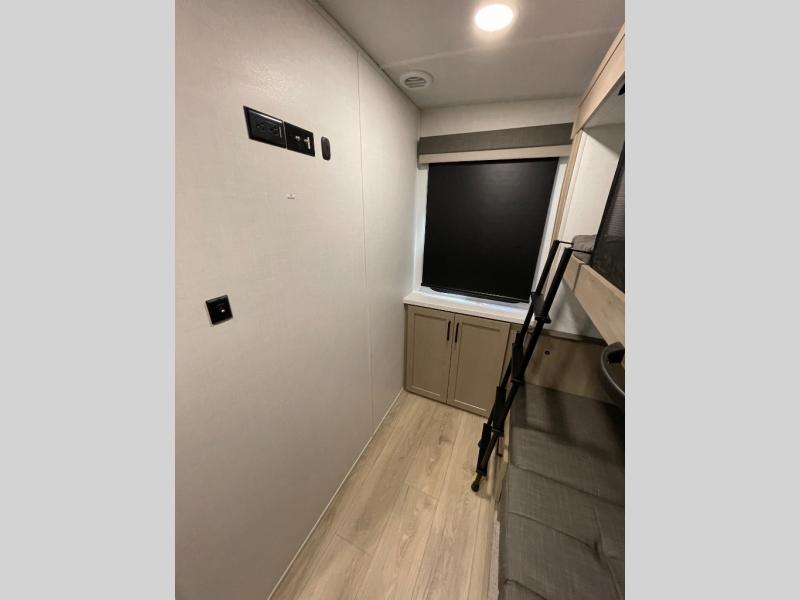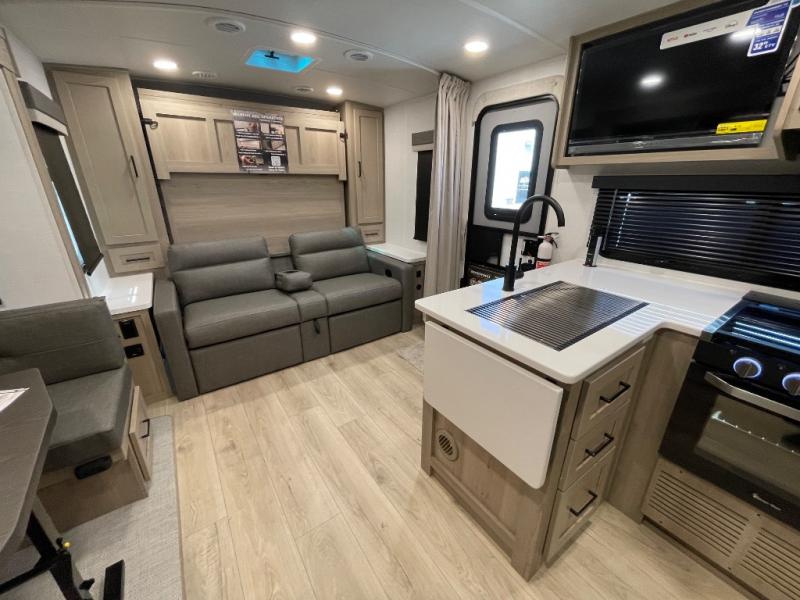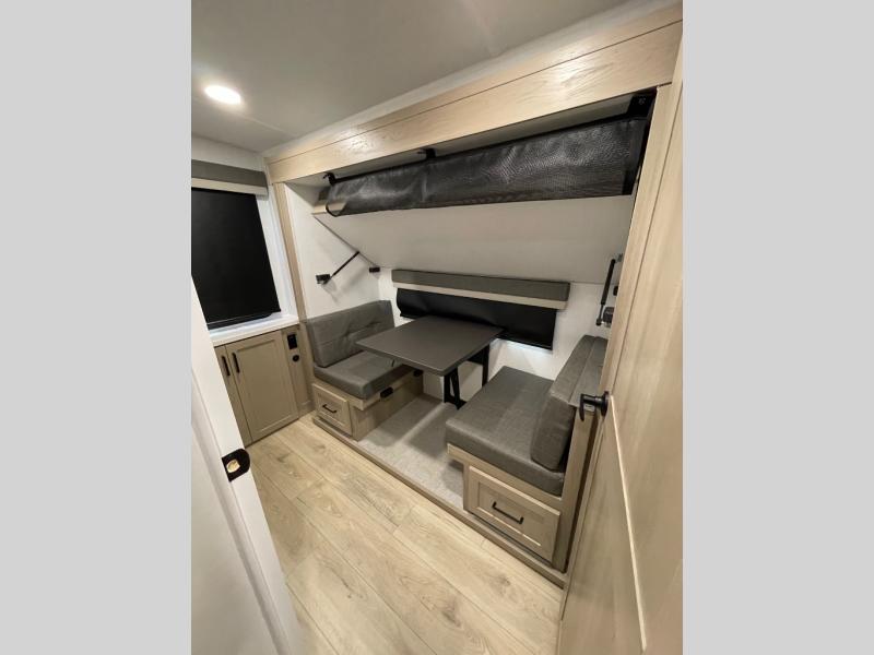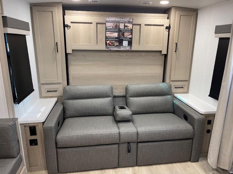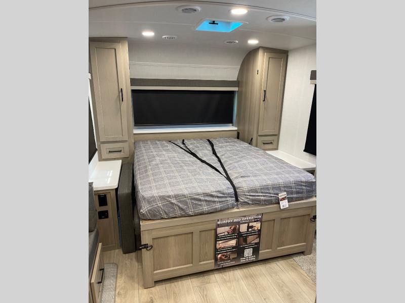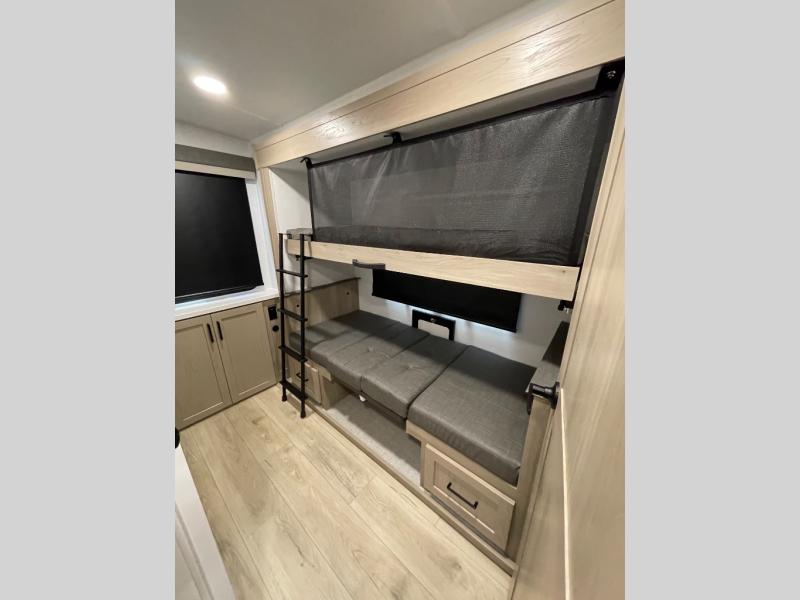 This trailer is one the whole crew will love! Start unloading the pass-thru storage when you arrive at your campsite, then put out the 18' power awning and start lunch on the exterior griddle. There is a full bath inside when you need to freshen up, and the fully-equipped interior kitchen can be used if the weather isn't cooperating with your plans. A U-shaped dinette slide provides a place to dine together and play board games, and two guests can sleep here at night. Speaking of nighttime, there is also a private bunkhouse in the back with a Dream Dinette and flip-up bunk plus a slide out for more space and an optional TV. You'll find your own space up front on the RV queen Murphy bed, complete with dual wardrobes and a privacy curtain when you need to get dressed. And in the morning you can fold away the bed to relax on the 74" sofa!