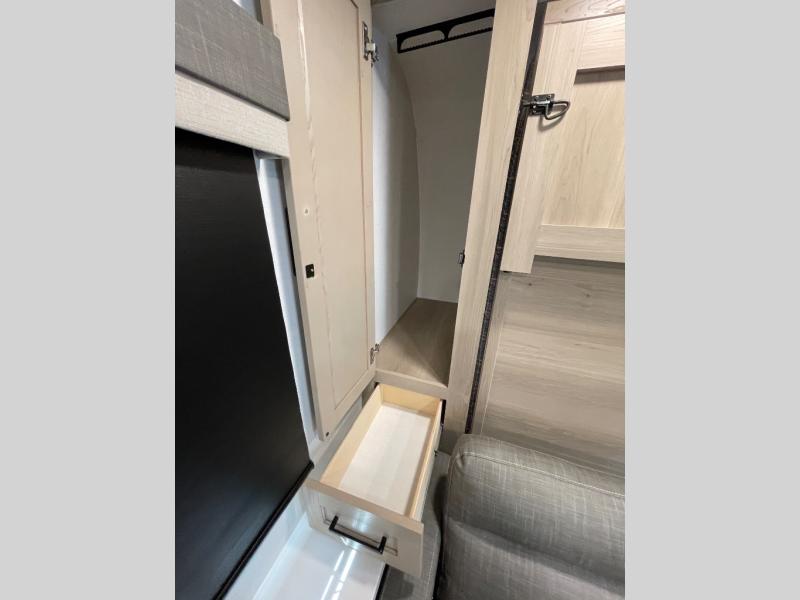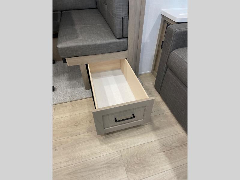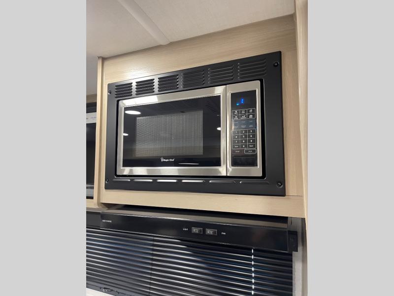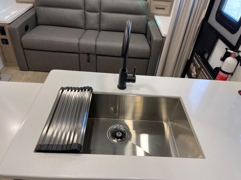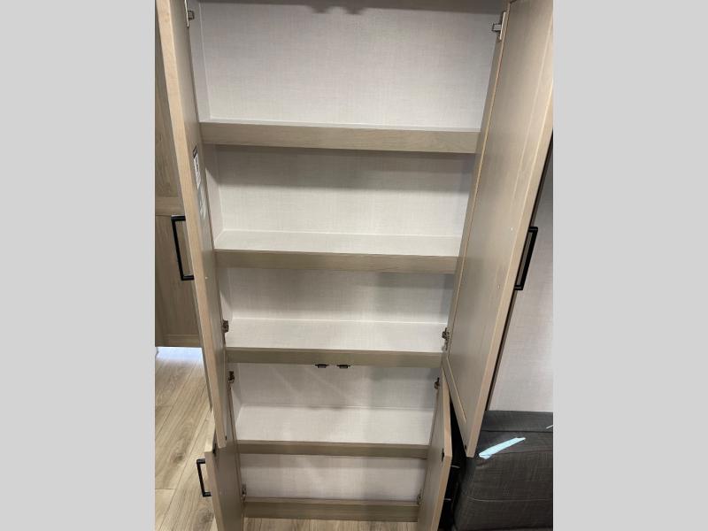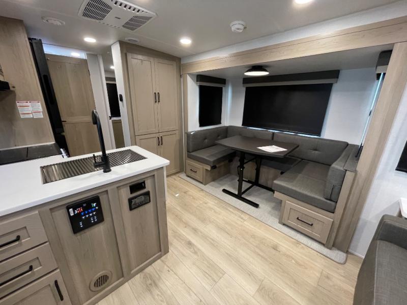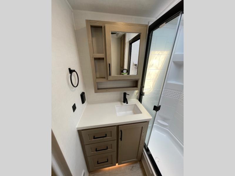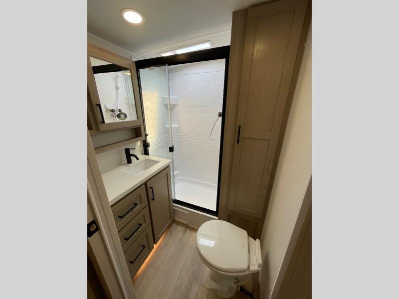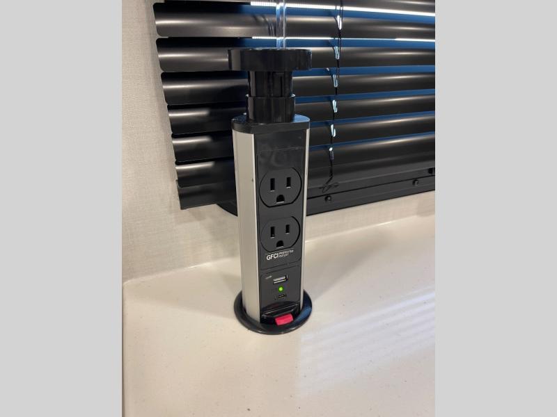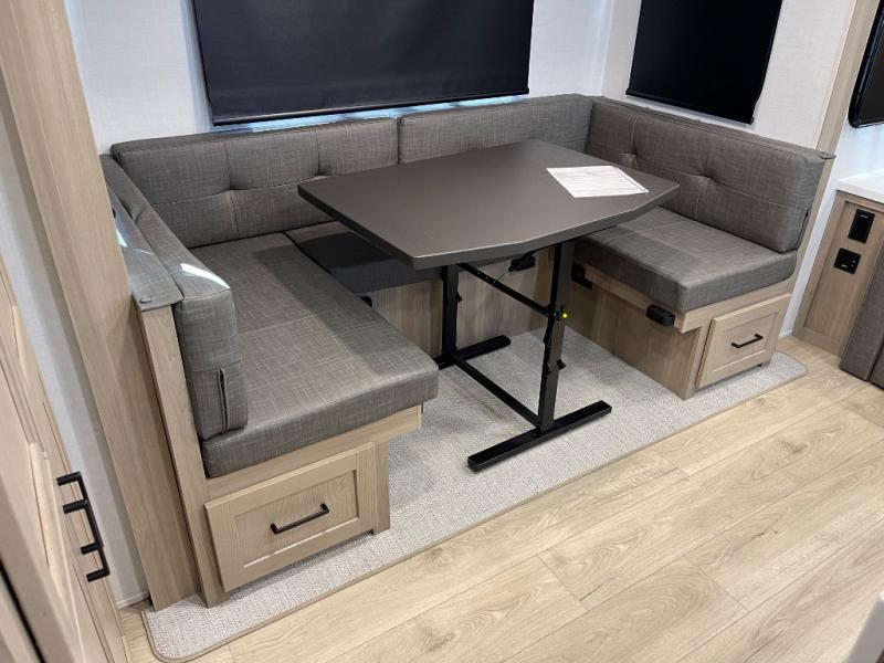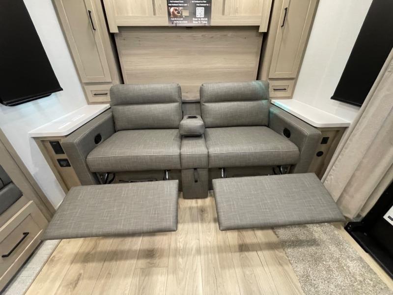 This trailer is one the whole crew will love! Start unloading the pass-thru storage when you arrive at your campsite, then put out the 18' power awning and start lunch on the exterior griddle. There is a full bath inside when you need to freshen up, and the fully-equipped interior kitchen can be used if the weather isn't cooperating with your plans. A U-shaped dinette slide provides a place to dine together and play board games, and two guests can sleep here at night. Speaking of nighttime, there is also a private bunkhouse in the back with a Dream Dinette and flip-up bunk plus a slide out for more space and an optional TV. You'll find your own space up front on the RV queen Murphy bed, complete with dual wardrobes and a privacy curtain when you need to get dressed. And in the morning you can fold away the bed to relax on the 74" sofa!