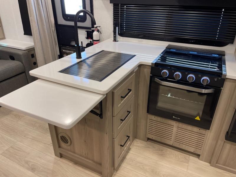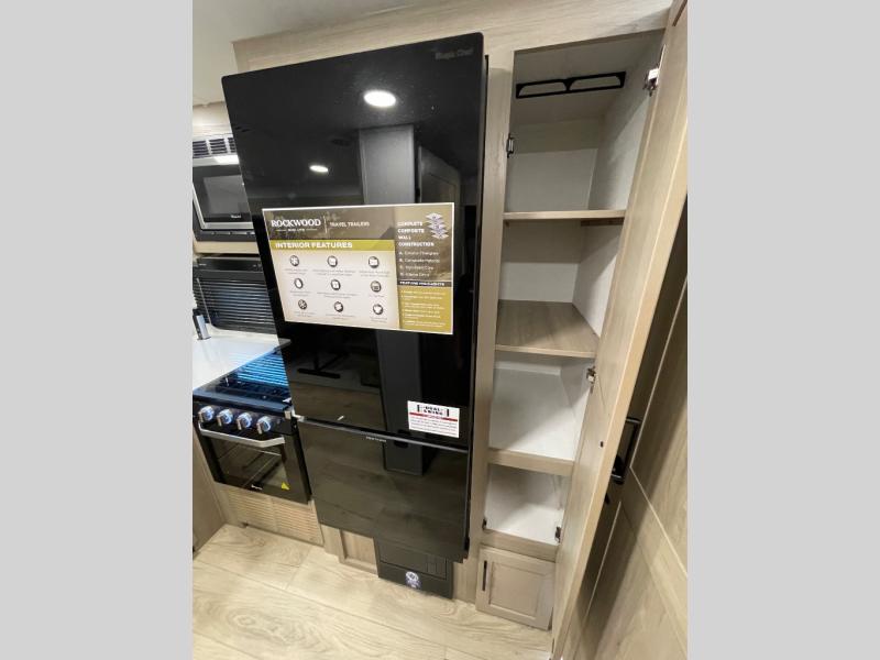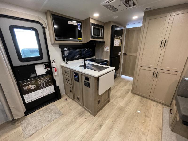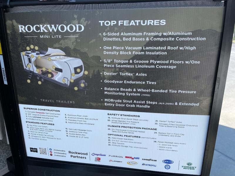 Each Rockwood Mini Lite travel trailer by Forest River is constructed with a fully laminated one-piece walkable roof, sleek frameless windows, and a six-sided full aluminum frame for strength and durability. The 12V thermostatically controlled heated tanks, plus radiant foil in the underbelly will allow you to camp well into the colder months, and the 200W roof solar panel will be perfect for a little off-gridding. Each model includes solid surface kitchen countertops, hidden hinge cabinet doors, roller shades, plus many more interior features. Having an AIR 360+ omnidirectional antenna with WiFi prep on board gives you the option to get some work done if it's needed, and the power tongue jack provides hassle-free set up, so you can enjoy more time relaxing!