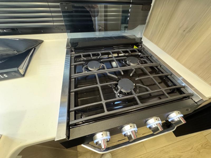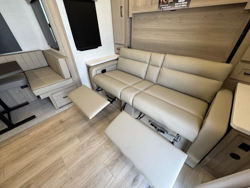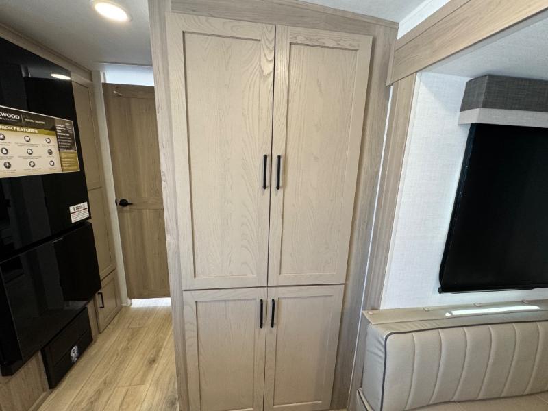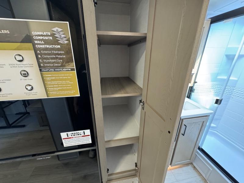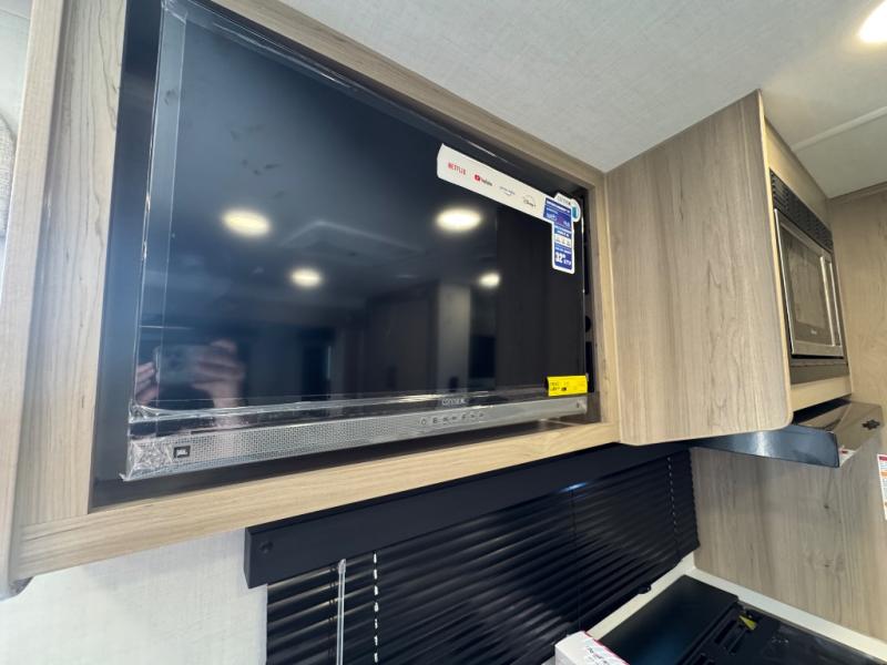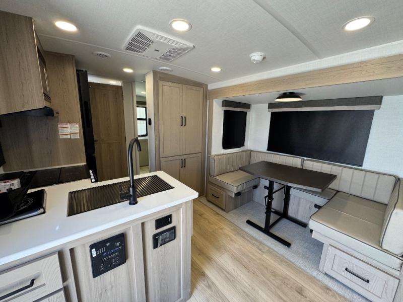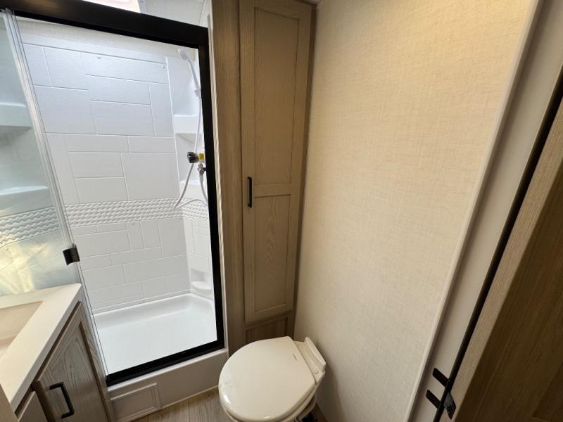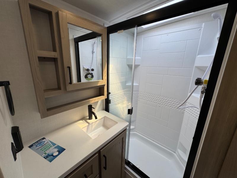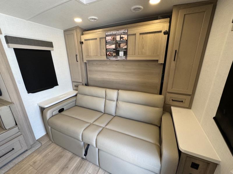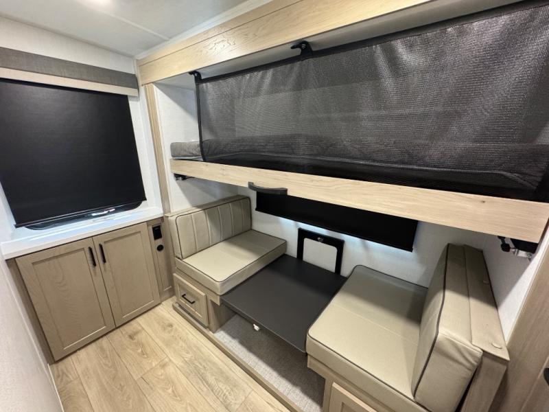 This trailer is one the whole crew will love! Start unloading the pass-thru storage when you arrive at your campsite, then put out the 18' power awning and start lunch on the exterior griddle. There is a full bath inside when you need to freshen up, and the fully-equipped interior kitchen can be used if the weather isn't cooperating with your plans. A U-shaped dinette slide provides a place to dine together and play board games, and two guests can sleep here at night. Speaking of nighttime, there is also a private bunkhouse in the back with a Dream Dinette and flip-up bunk plus a slide out for more space and an optional TV. You'll find your own space up front on the RV queen Murphy bed, complete with dual wardrobes and a privacy curtain when you need to get dressed. And in the morning you can fold away the bed to relax on the 74" sofa!