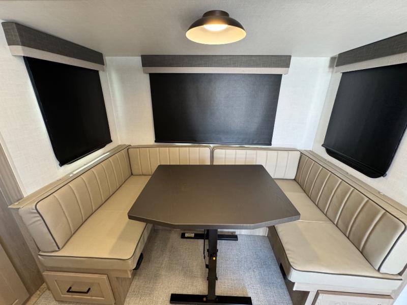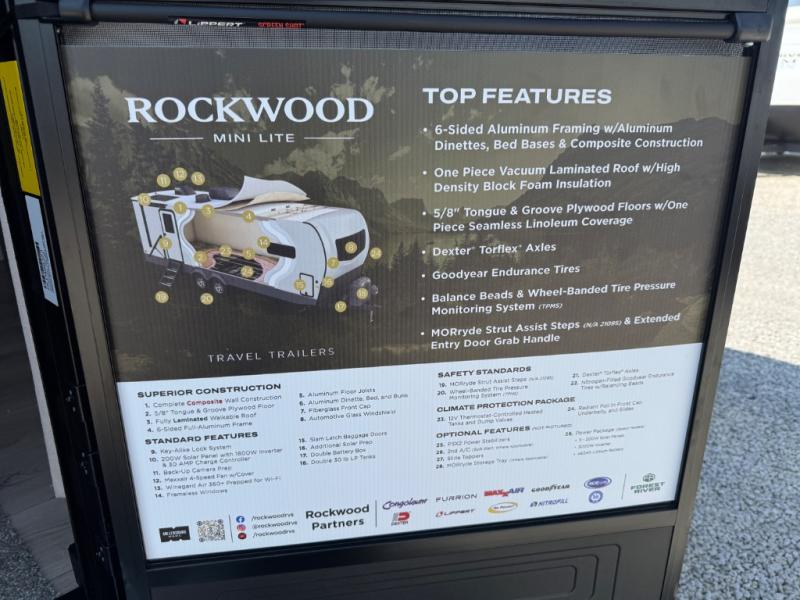 Each Rockwood Mini Lite travel trailer by Forest River is constructed with a fully laminated one-piece walkable roof, sleek frameless windows, and a six-sided full aluminum frame for strength and durability. The 12V thermostatically controlled heated tanks, plus radiant foil in the underbelly will allow you to camp well into the colder months, and the 200W roof solar panel will be perfect for a little off-gridding. Each model includes solid surface kitchen countertops, hidden hinge cabinet doors, roller shades, plus many more interior features. Having an AIR 360+ omnidirectional antenna with WiFi prep on board gives you the option to get some work done if it's needed, and the power tongue jack provides hassle-free set up, so you can enjoy more time relaxing!