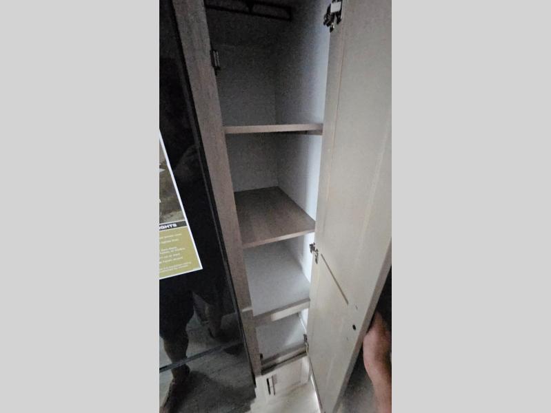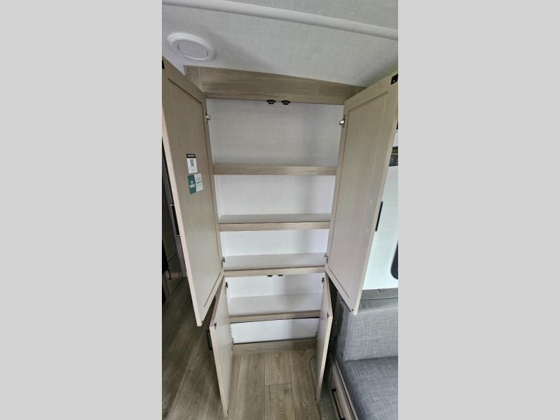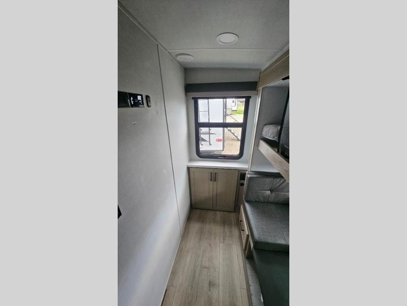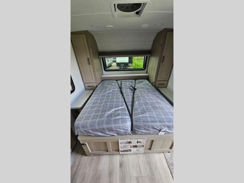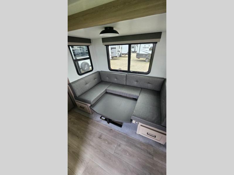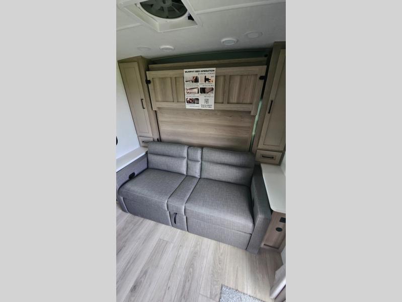 This trailer is one the whole crew will love! Start unloading the pass-thru storage when you arrive at your campsite, then put out the 18' power awning and start lunch on the exterior griddle. There is a full bath inside when you need to freshen up, and the fully-equipped interior kitchen can be used if the weather isn't cooperating with your plans. A U-shaped dinette slide provides a place to dine together and play board games, and two guests can sleep here at night. Speaking of nighttime, there is also a private bunkhouse in the back with a Dream Dinette and flip-up bunk plus a slide out for more space and an optional TV. You'll find your own space up front on the RV queen Murphy bed, complete with dual wardrobes and a privacy curtain when you need to get dressed. And in the morning you can fold away the bed to relax on the 74" sofa!