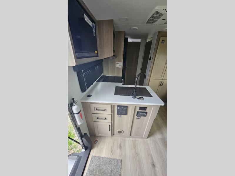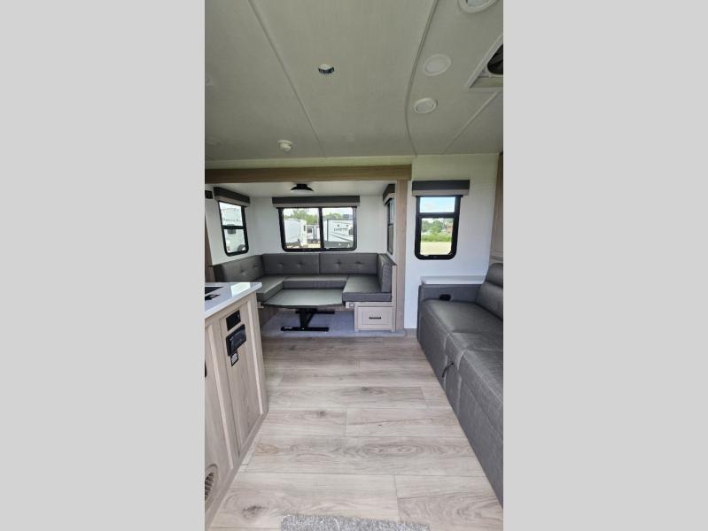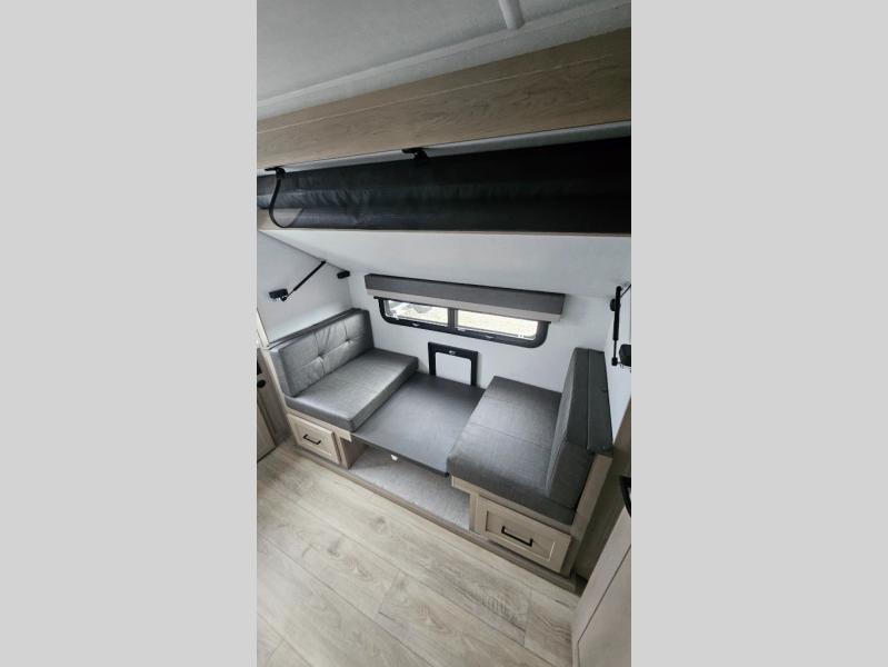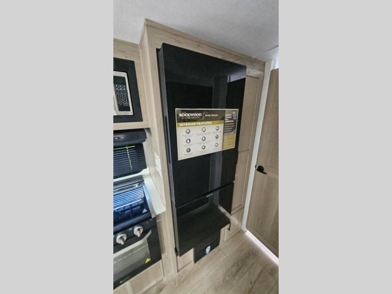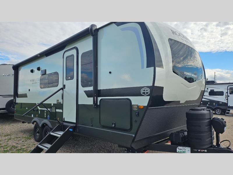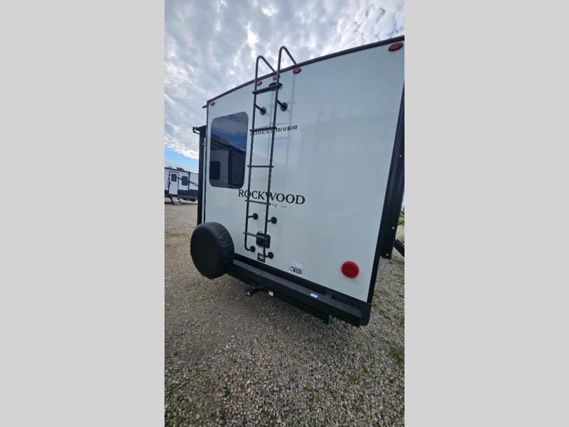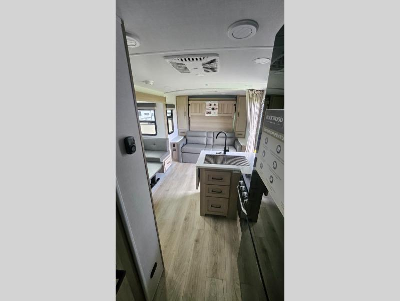 Each Rockwood Mini Lite travel trailer by Forest River is constructed with a fully laminated one-piece walkable roof, sleek frameless windows, and a six-sided full aluminum frame for strength and durability. The 12V thermostatically controlled heated tanks, plus radiant foil in the underbelly will allow you to camp well into the colder months, and the 200W roof solar panel will be perfect for a little off-gridding. Each model includes solid surface kitchen countertops, hidden hinge cabinet doors, roller shades, plus many more interior features. Having an AIR 360+ omnidirectional antenna with WiFi prep on board gives you the option to get some work done if it's needed, and the power tongue jack provides hassle-free set up, so you can enjoy more time relaxing!