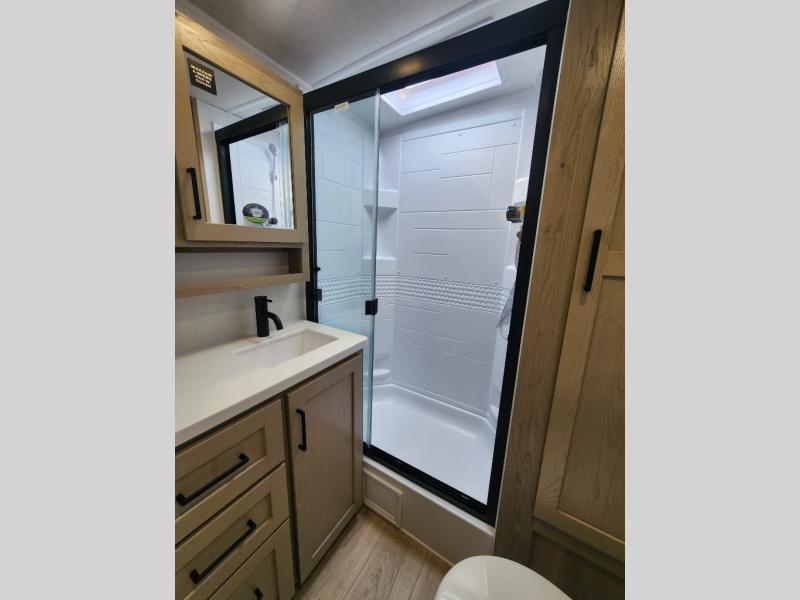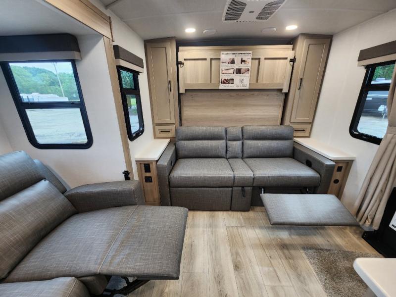 This trailer is one the whole crew will love! Start unloading the pass-thru storage when you arrive at your campsite, then put out the 18' power awning and start lunch on the exterior griddle. There is a full bath inside when you need to freshen up, and the fully-equipped interior kitchen can be used if the weather isn't cooperating with your plans. A U-shaped dinette slide provides a place to dine together and play board games, and two guests can sleep here at night. Speaking of nighttime, there is also a private bunkhouse in the back with a Dream Dinette and flip-up bunk plus a slide out for more space and an optional TV. You'll find your own space up front on the RV queen Murphy bed, complete with dual wardrobes and a privacy curtain when you need to get dressed. And in the morning you can fold away the bed to relax on the 74" sofa!