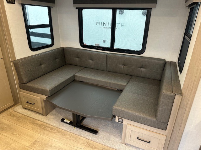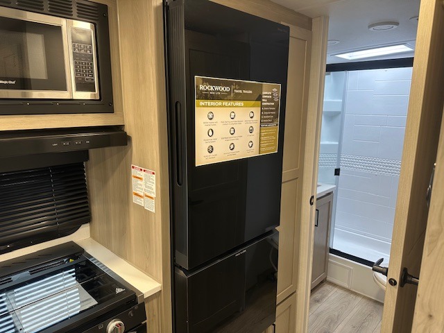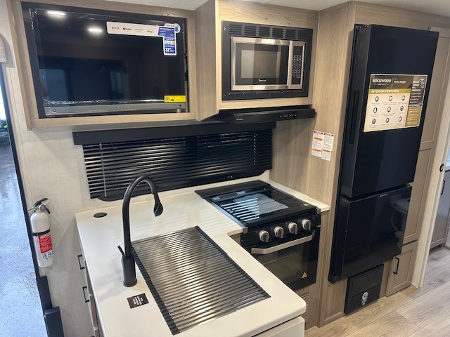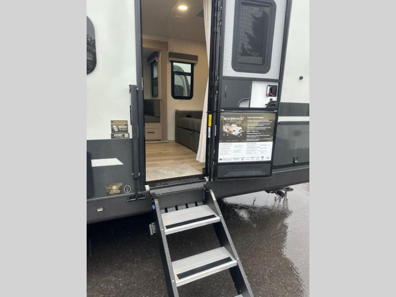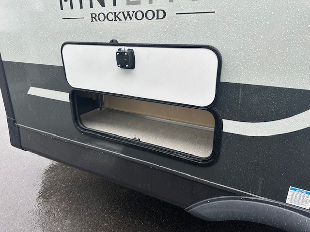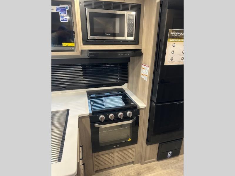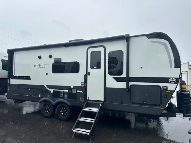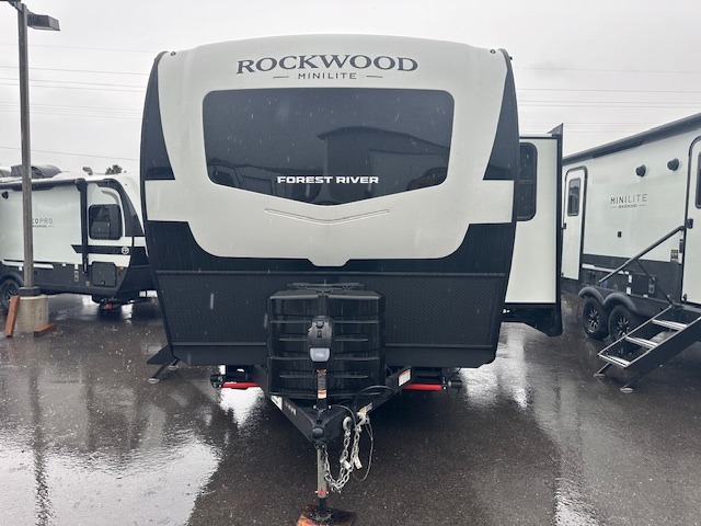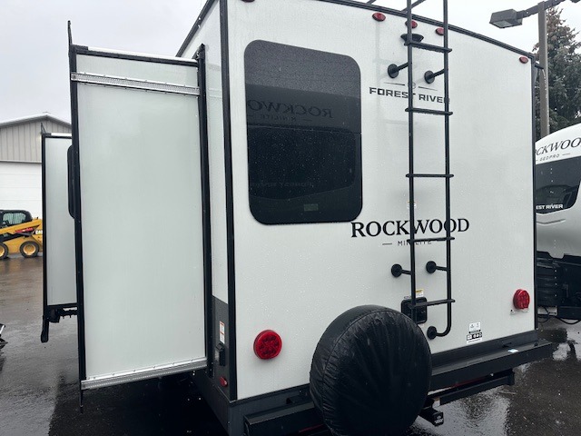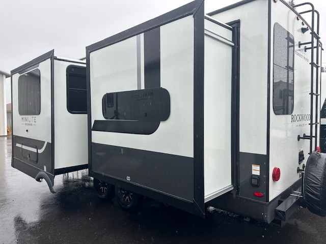 Each Rockwood Mini Lite travel trailer by Forest River is constructed with a fully laminated one-piece walkable roof, sleek frameless windows, and a six-sided full aluminum frame for strength and durability. The 12V thermostatically controlled heated tanks, plus radiant foil in the underbelly will allow you to camp well into the colder months, and the 200W roof solar panel will be perfect for a little off-gridding. Each model includes solid surface kitchen countertops, hidden hinge cabinet doors, roller shades, plus many more interior features. Having an AIR 360+ omnidirectional antenna with WiFi prep on board gives you the option to get some work done if it's needed, and the power tongue jack provides hassle-free set up, so you can enjoy more time relaxing!