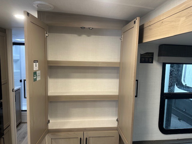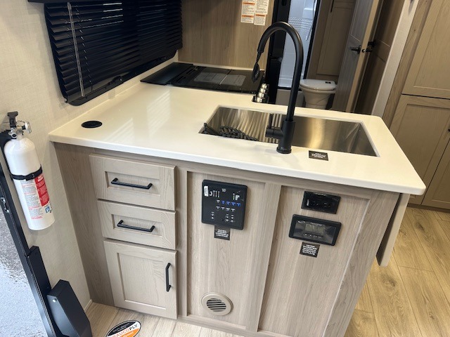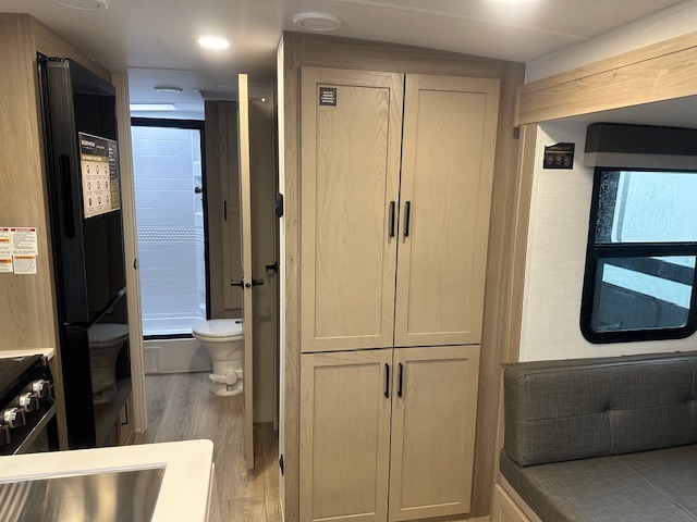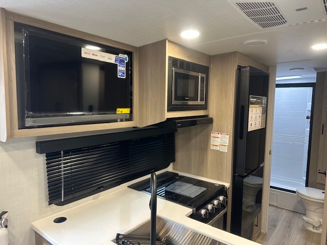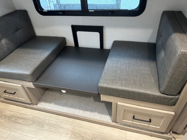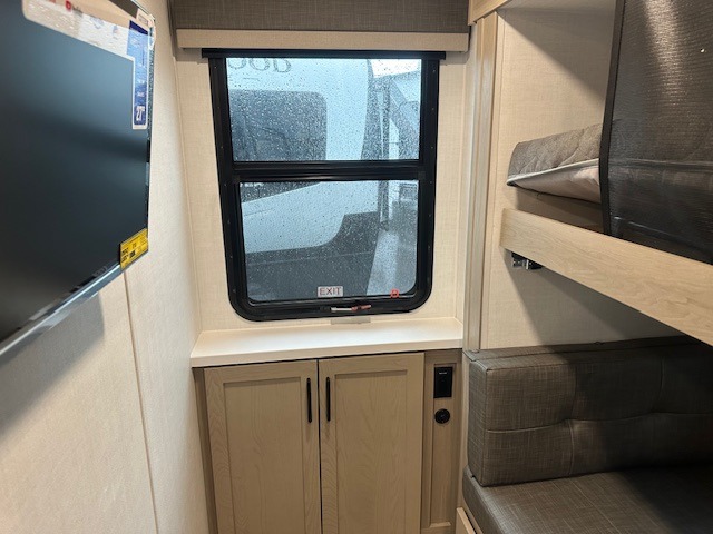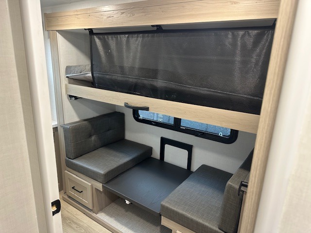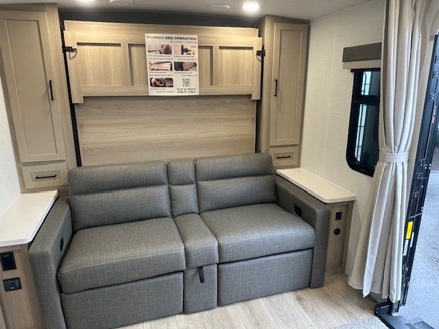 This trailer is one the whole crew will love! Start unloading the pass-thru storage when you arrive at your campsite, then put out the 18' power awning and start lunch on the exterior griddle. There is a full bath inside when you need to freshen up, and the fully-equipped interior kitchen can be used if the weather isn't cooperating with your plans. A U-shaped dinette slide provides a place to dine together and play board games, and two guests can sleep here at night. Speaking of nighttime, there is also a private bunkhouse in the back with a Dream Dinette and flip-up bunk plus a slide out for more space and an optional TV. You'll find your own space up front on the RV queen Murphy bed, complete with dual wardrobes and a privacy curtain when you need to get dressed. And in the morning you can fold away the bed to relax on the 74" sofa!