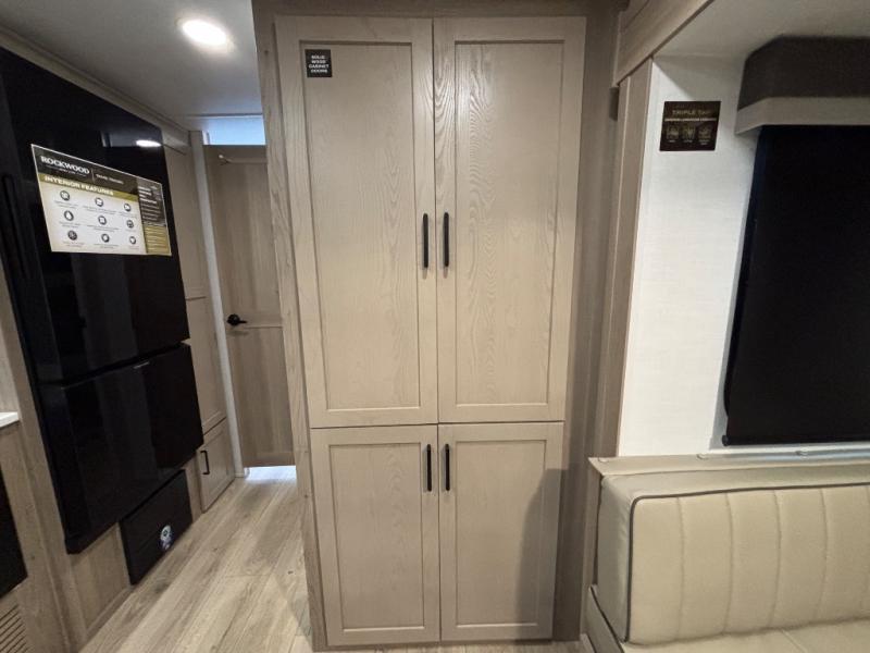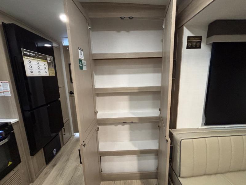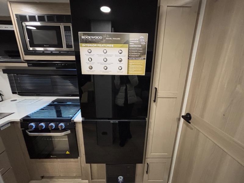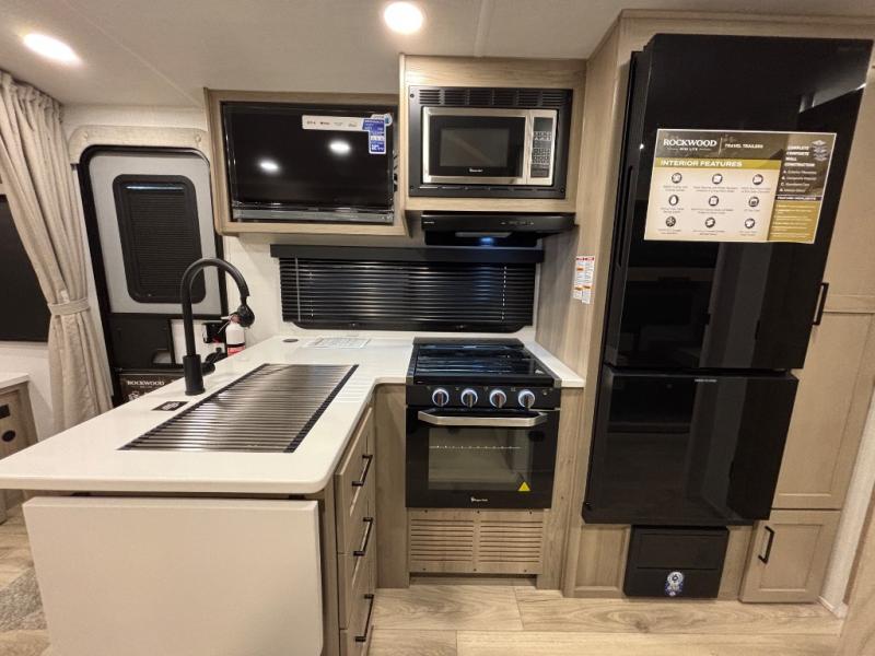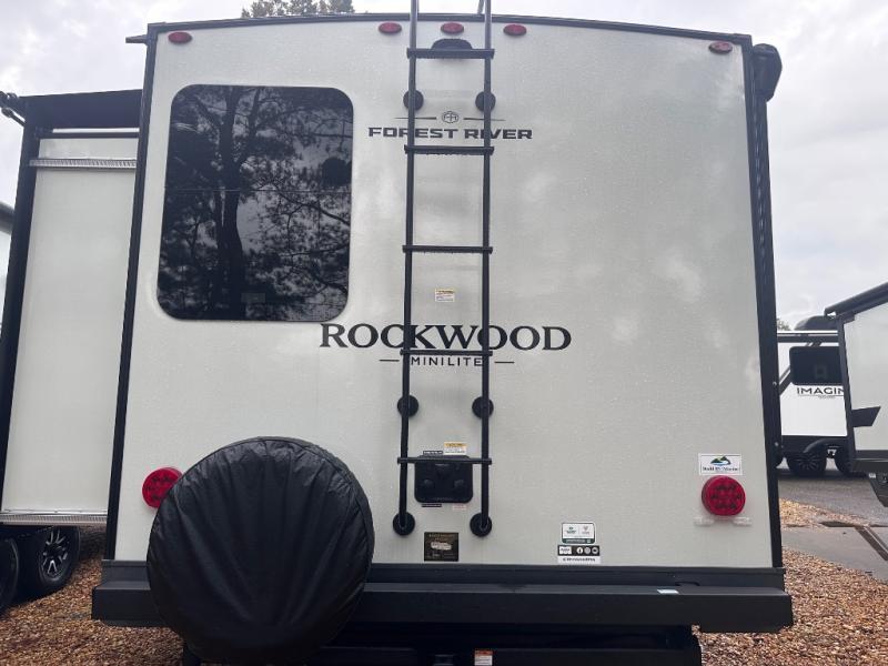Each Rockwood Mini Lite travel trailer by Forest River is constructed with a fully laminated one-piece walkable roof, sleek frameless windows, and a six-sided full aluminum frame for strength and durability. The 12V thermostatically controlled heated tanks, plus radiant foil in the underbelly will allow you to camp well into the colder months, and the 200W roof solar panel will be perfect for a little off-gridding. Each model includes solid surface kitchen countertops, hidden hinge cabinet doors, roller shades, plus many more interior features. Having an AIR 360+ omnidirectional antenna with WiFi prep on board gives you the option to get some work done if it's needed, and the power tongue jack provides hassle-free set up, so you can enjoy more time relaxing!