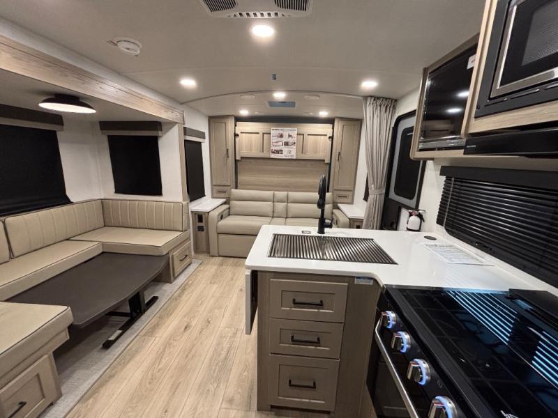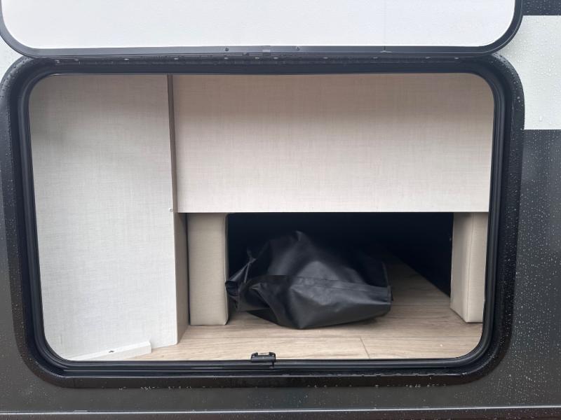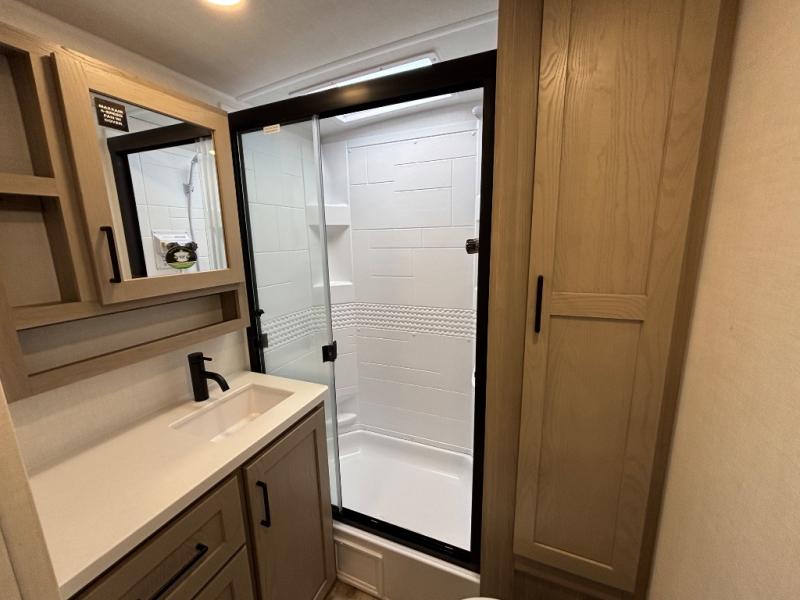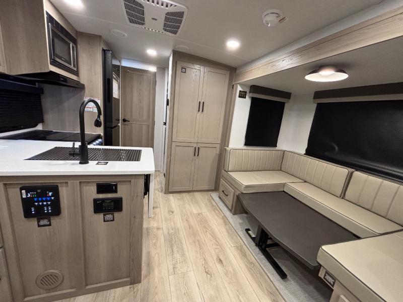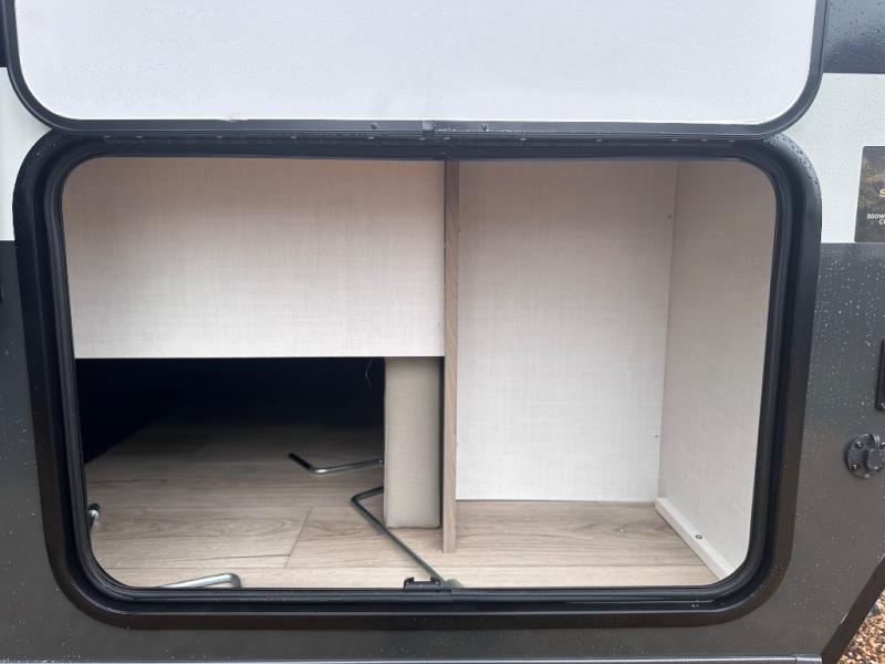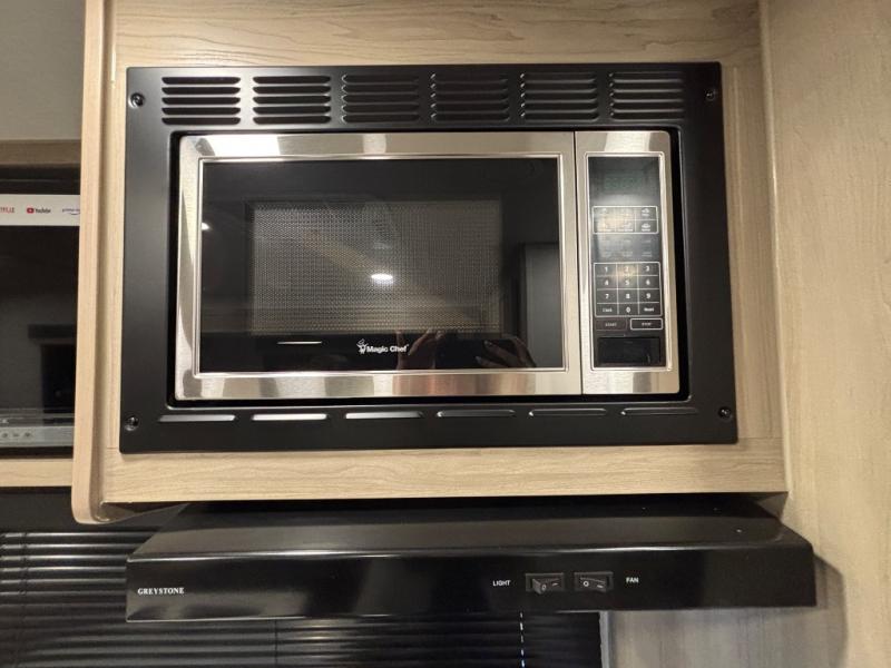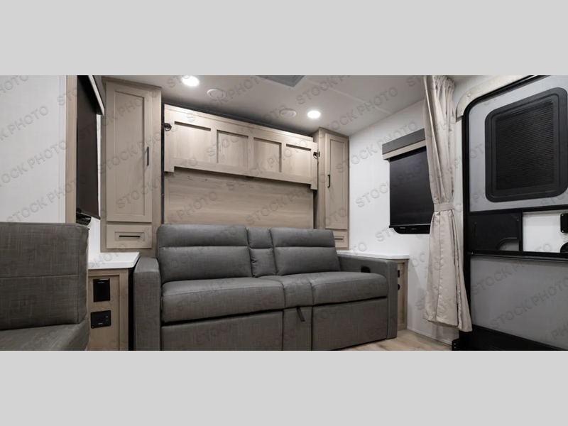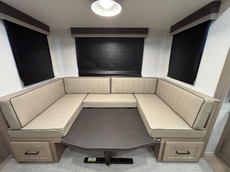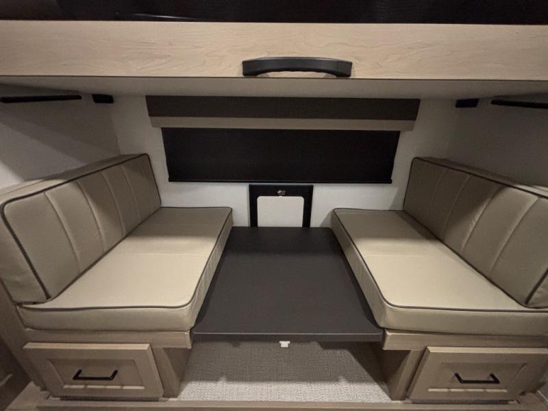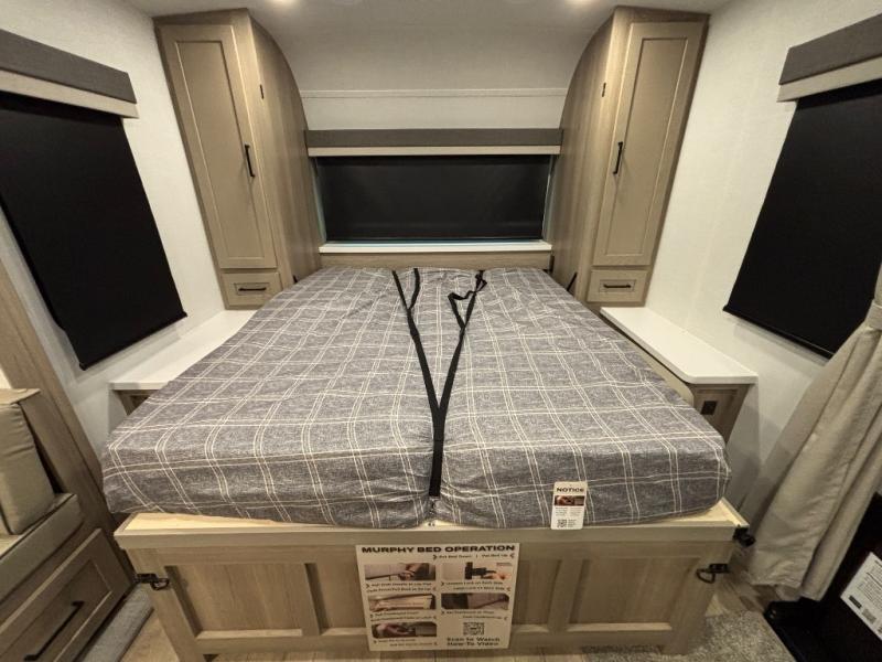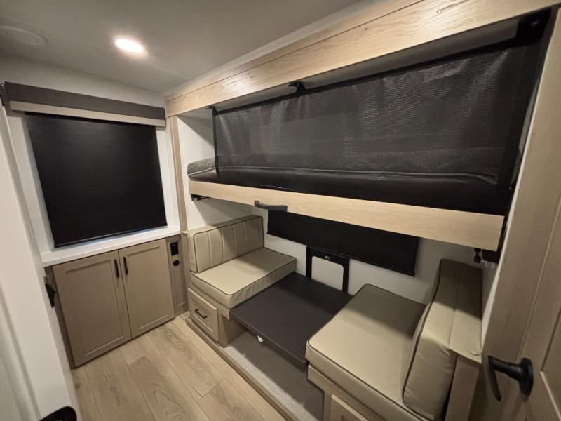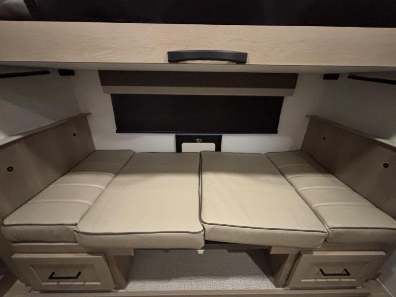 This trailer is one the whole crew will love! Start unloading the pass-thru storage when you arrive at your campsite, then put out the 18' power awning. There is a full bath inside when you need to freshen up, and the fully equipped interior kitchen can be used if the weather isn't cooperating with your plans. A U-shaped dinette slide provides a place to dine together and play board games, and two guests can sleep here at night. Speaking of nighttime, there is also a private bunkhouse in the back with a Dream Dinette and flip-up bunk plus a slide out for more space and an optional TV. You'll find your own space up front on the RV queen Murphy bed, complete with dual wardrobes and a privacy curtain when you need to get dressed. And in the morning, you can fold away the bed to relax on the 74" sofa!