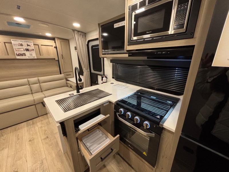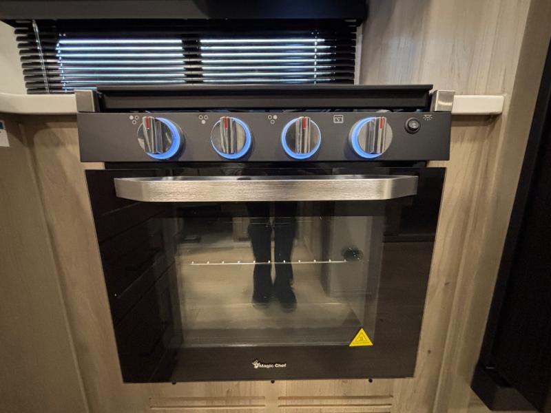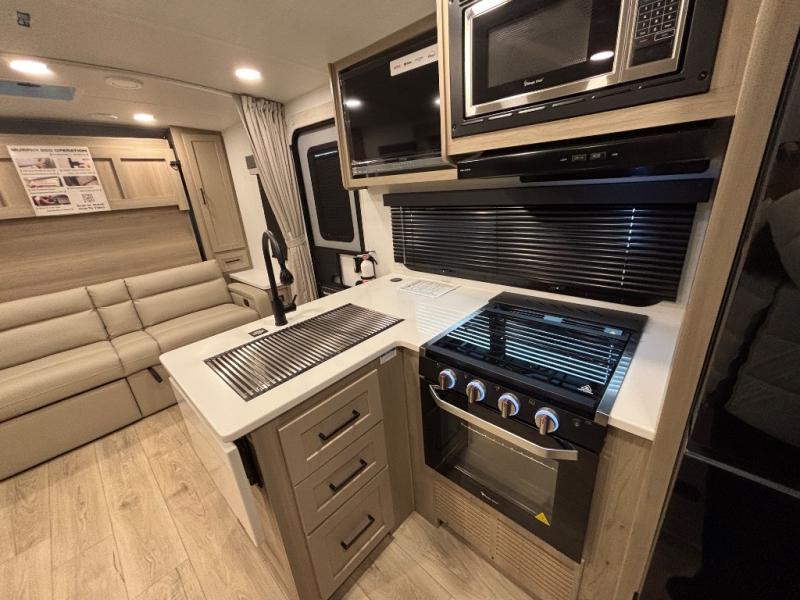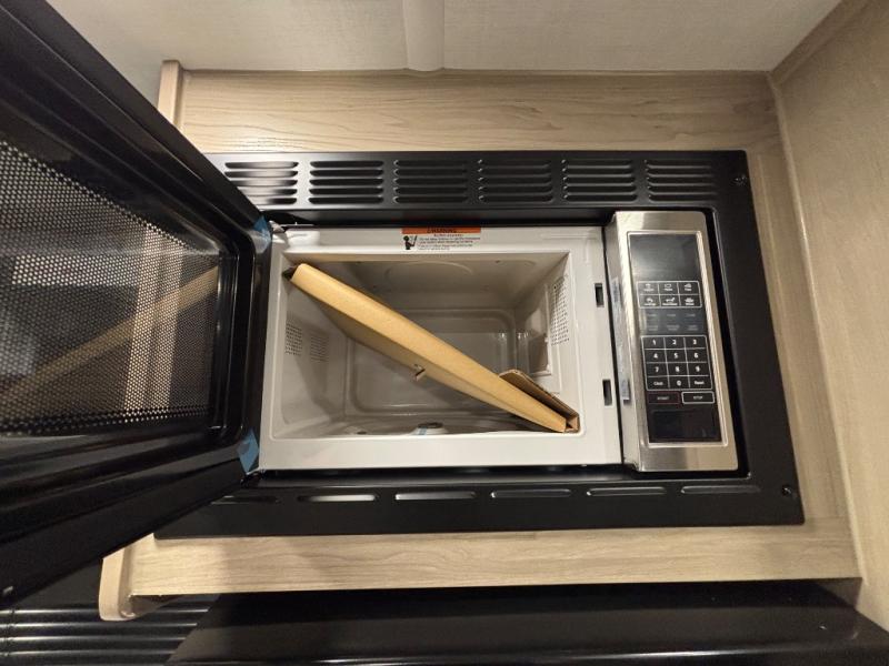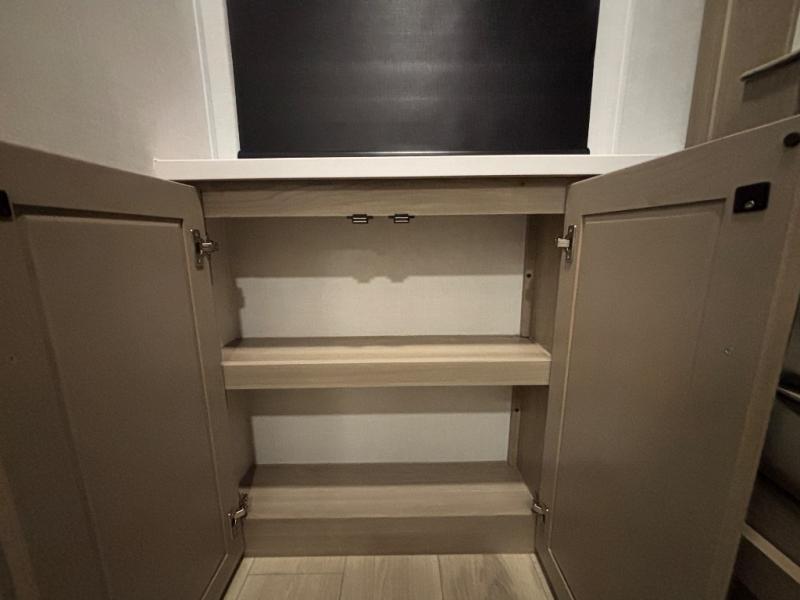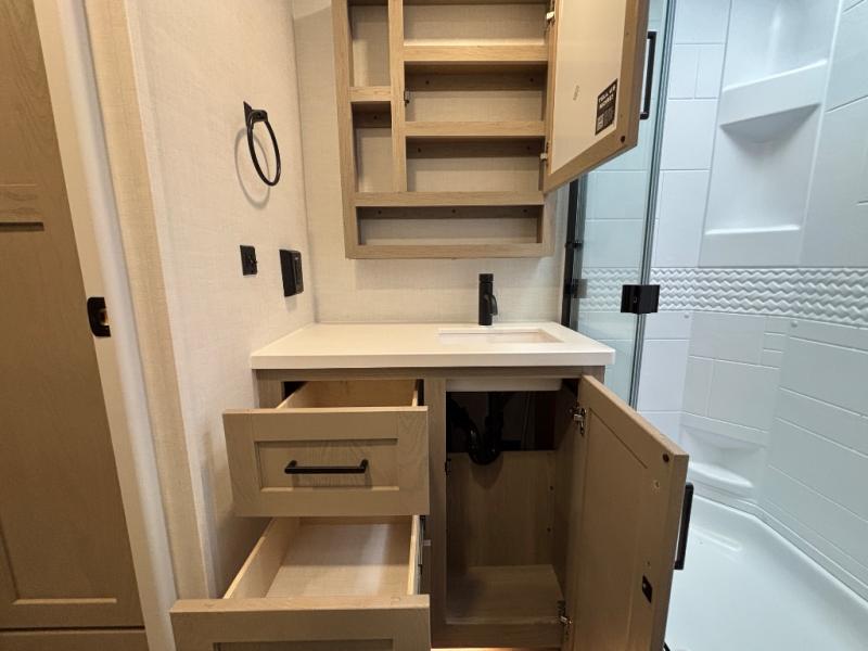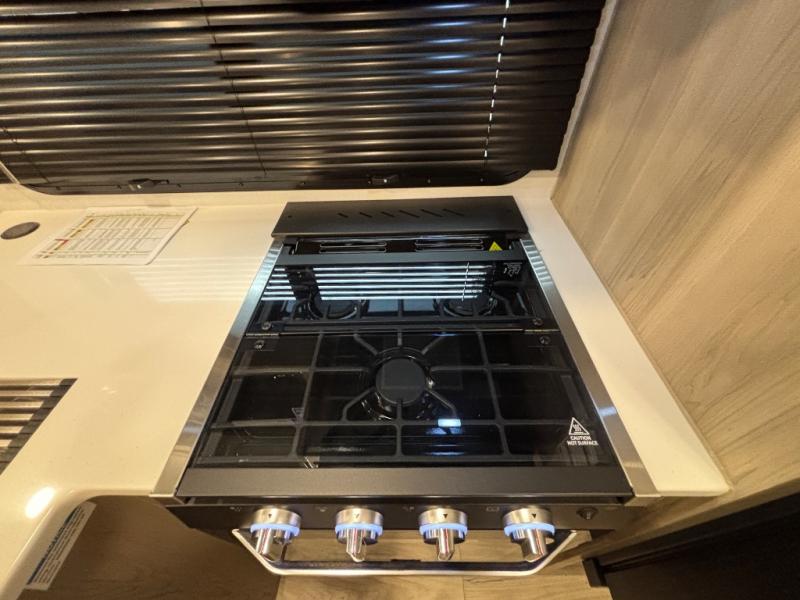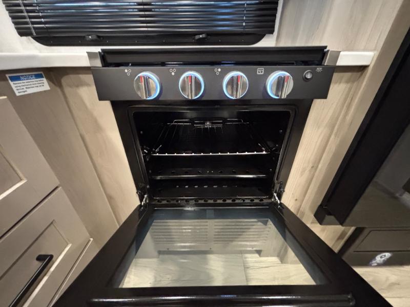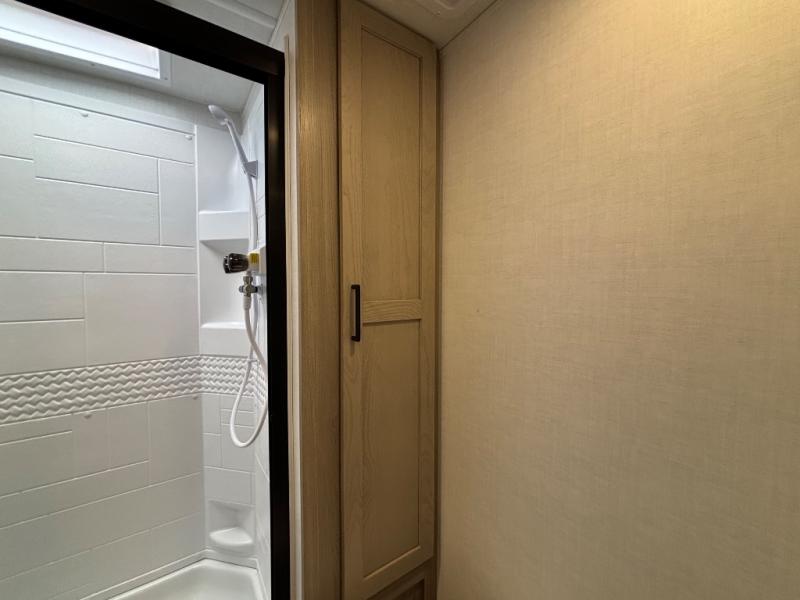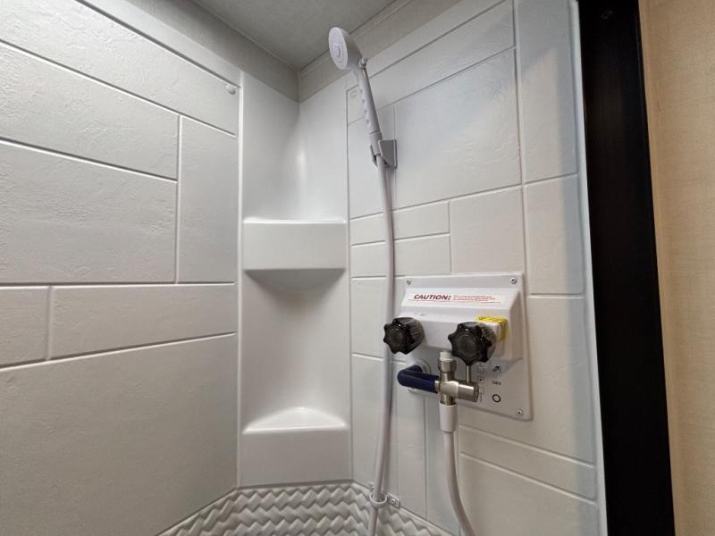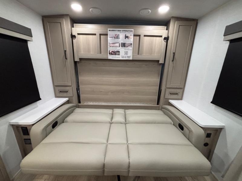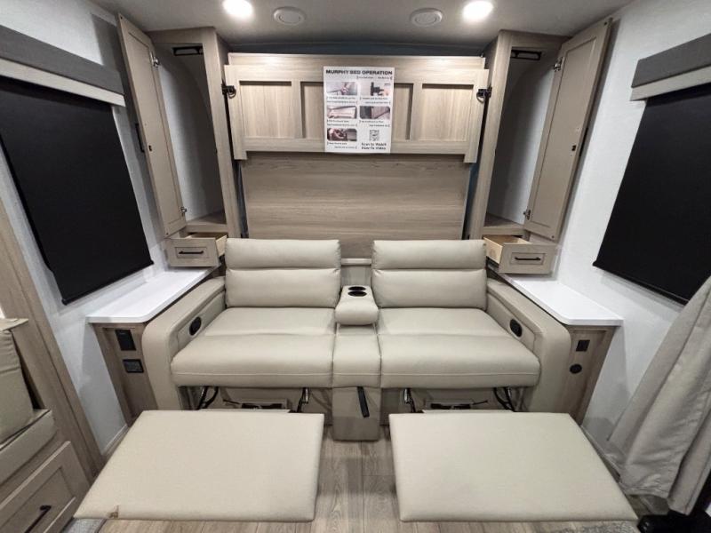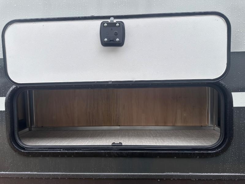 This trailer is one the whole crew will love! Start unloading the pass-thru storage when you arrive at your campsite, then put out the 18' power awning. There is a full bath inside when you need to freshen up, and the fully equipped interior kitchen can be used if the weather isn't cooperating with your plans. A U-shaped dinette slide provides a place to dine together and play board games, and two guests can sleep here at night. Speaking of nighttime, there is also a private bunkhouse in the back with a Dream Dinette and flip-up bunk plus a slide out for more space and an optional TV. You'll find your own space up front on the RV queen Murphy bed, complete with dual wardrobes and a privacy curtain when you need to get dressed. And in the morning, you can fold away the bed to relax on the 74" sofa!