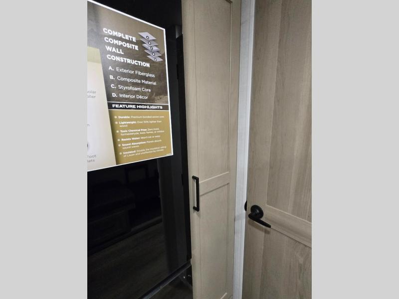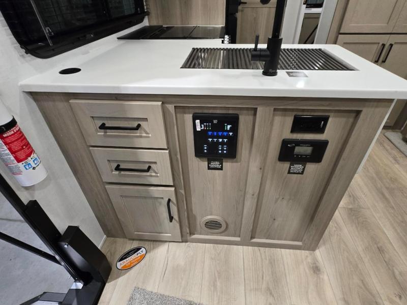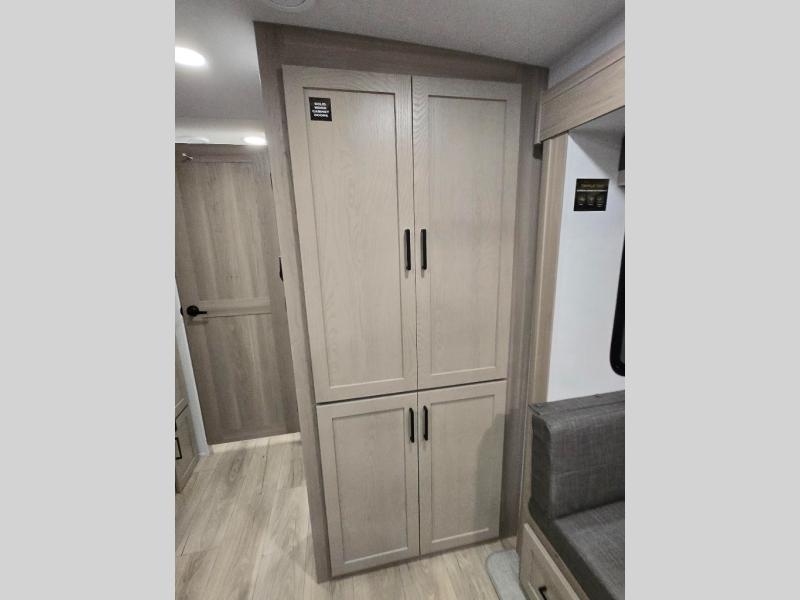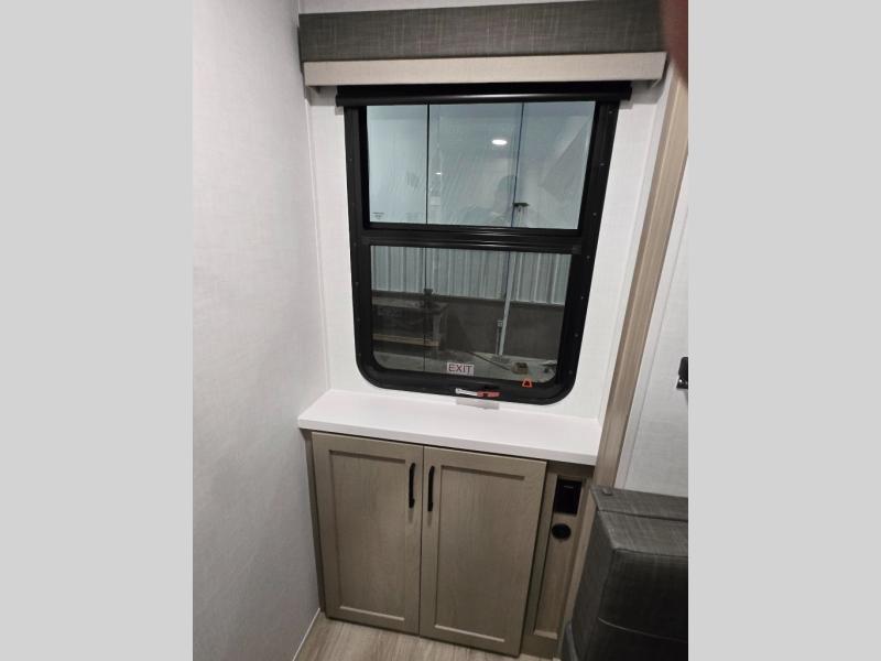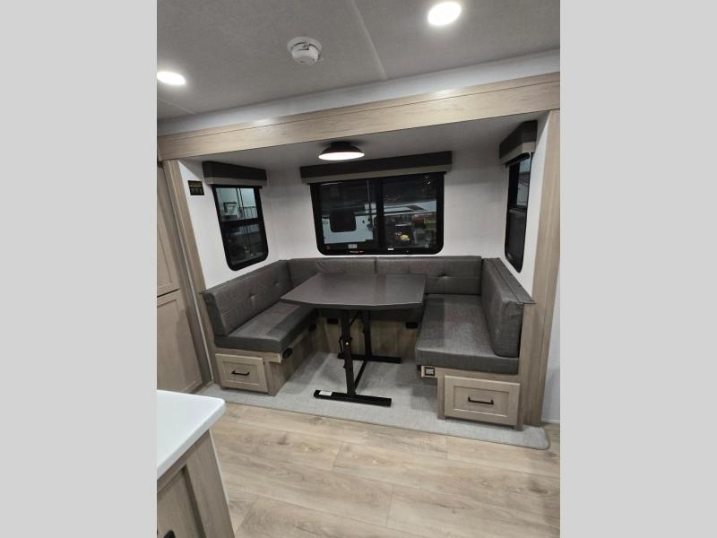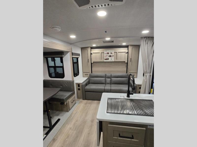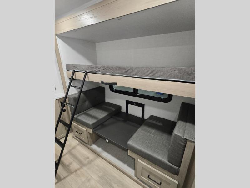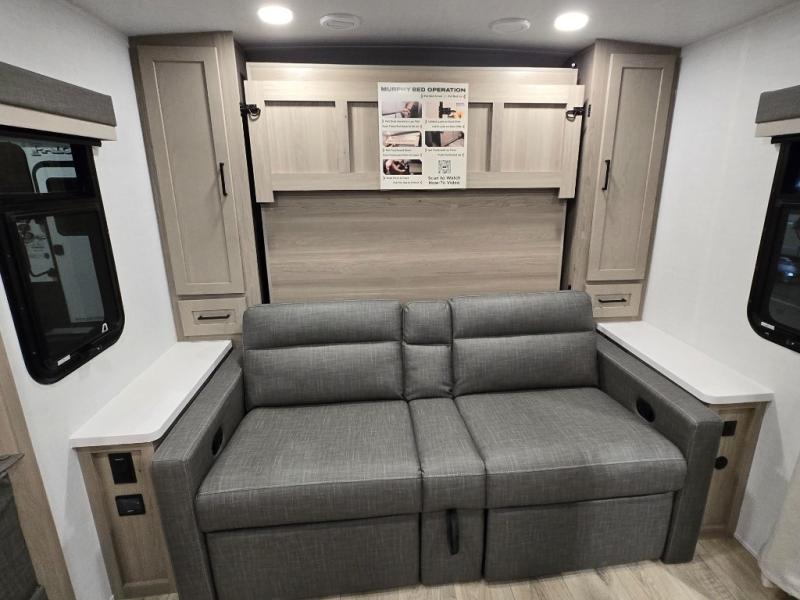 This trailer is one the whole crew will love! Start unloading the pass-thru storage when you arrive at your campsite, then put out the 18' power awning. There is a full bath inside when you need to freshen up, and the fully equipped interior kitchen can be used if the weather isn't cooperating with your plans. A U-shaped dinette slide provides a place to dine together and play board games, and two guests can sleep here at night. Speaking of nighttime, there is also a private bunkhouse in the back with a Dream Dinette and flip-up bunk plus a slide out for more space and an optional TV. You'll find your own space up front on the RV queen Murphy bed, complete with dual wardrobes and a privacy curtain when you need to get dressed. And in the morning, you can fold away the bed to relax on the 74" sofa!