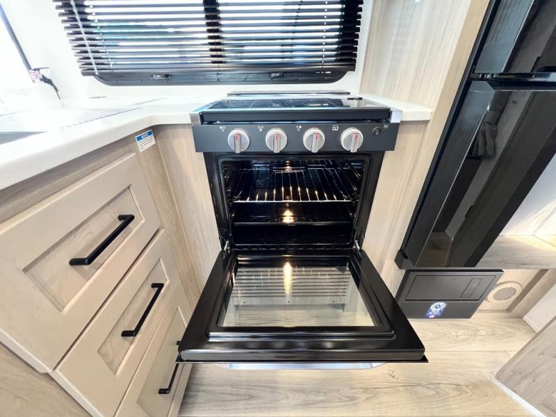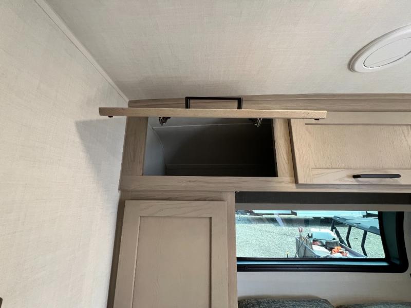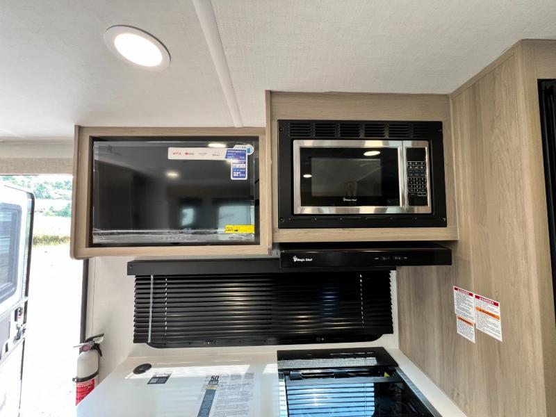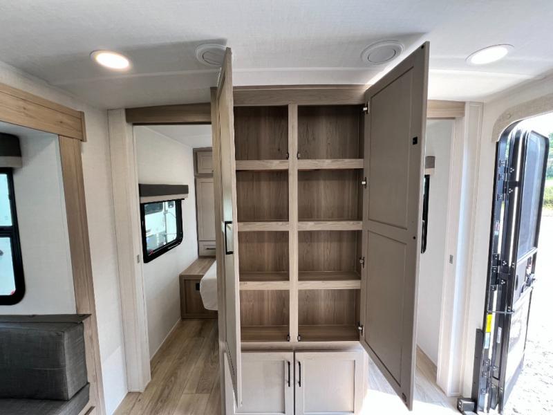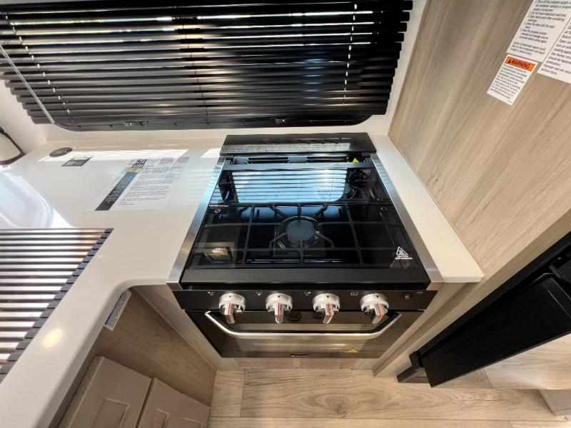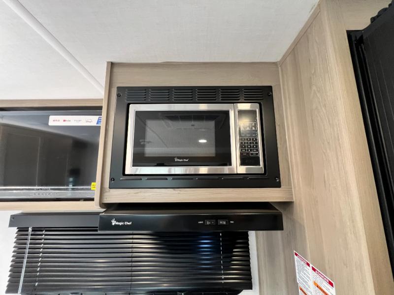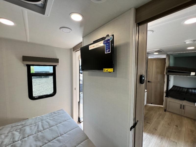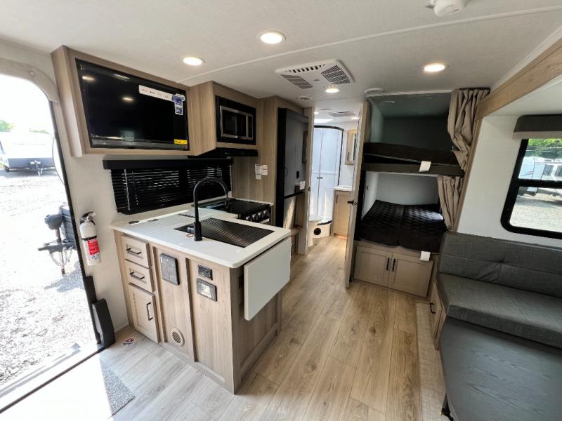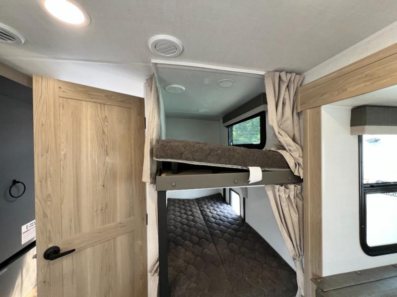 This bunkhouse model is perfect for your crew of six! You will appreciate the exterior bike door that lets you store gear under the flip-up bottom bunk, plus there is a pass-thru storage up front for even more storage. The RV queen bed in the front bedroom includes flip-up storage, two wardrobes, and a TV option if you like to stay up late with a movie. In the morning, everyone can meet in the combined kitchen and living area to dine around the U-shaped dinette, or you can take your plate outdoors to sit under the 18' power awning with LED lights. This model also includes an exterior griddle for a pancake breakfast!