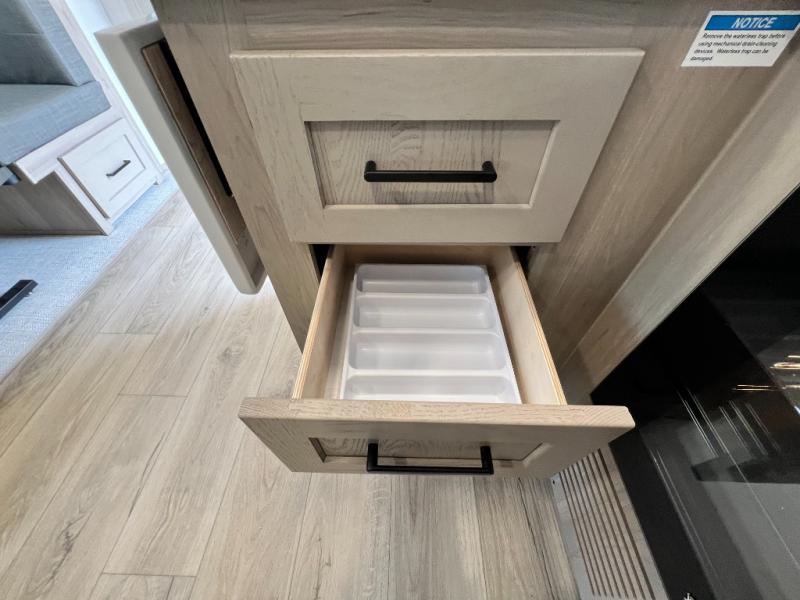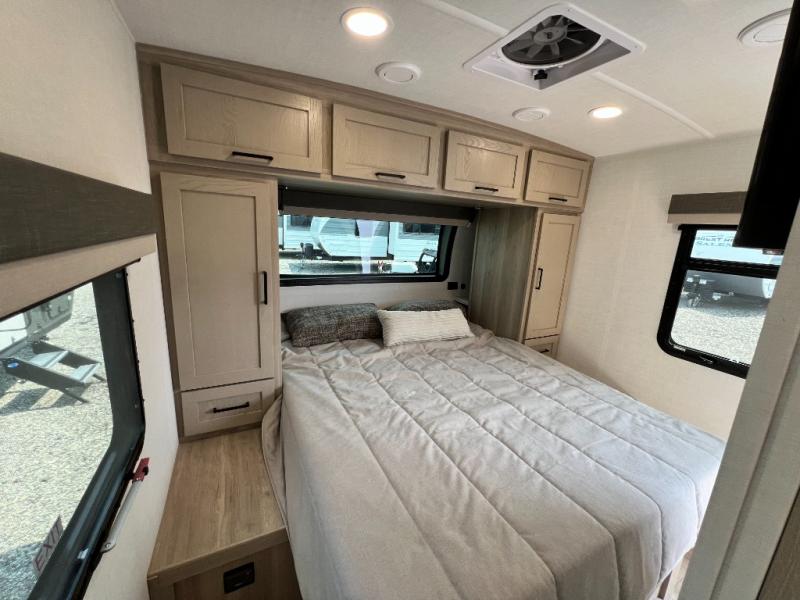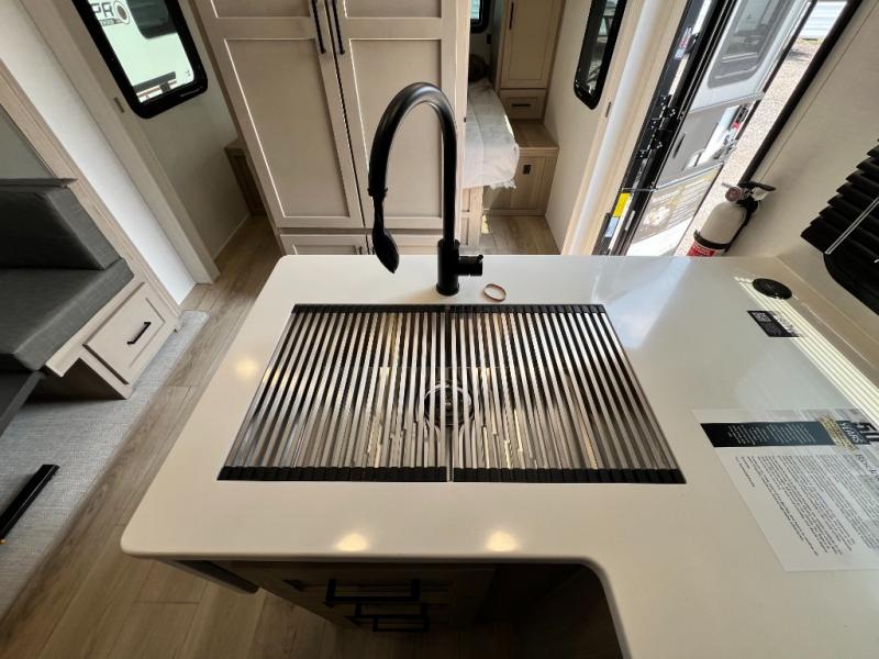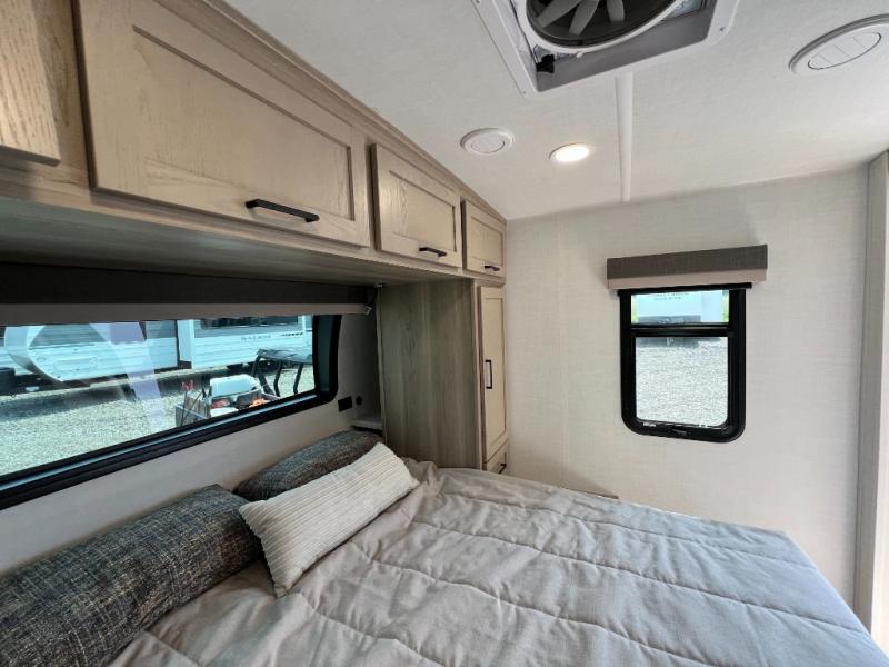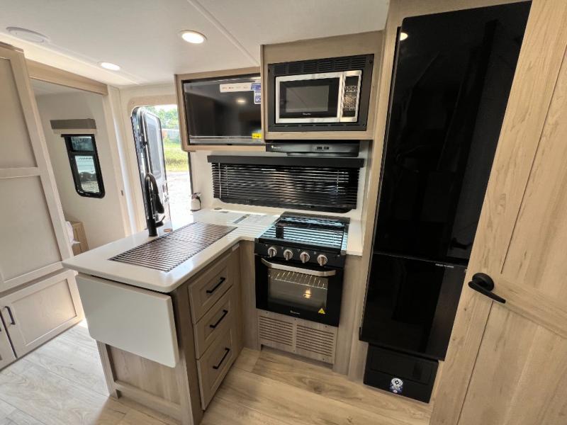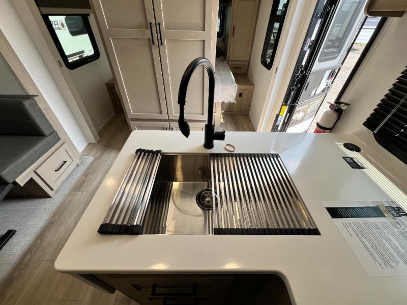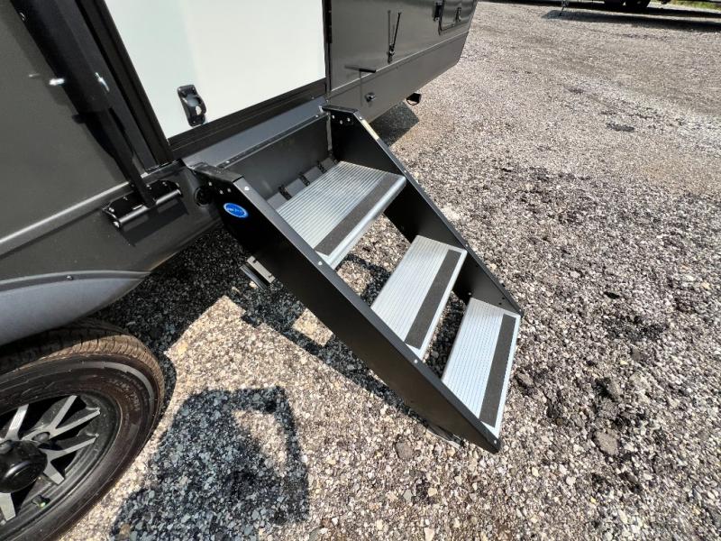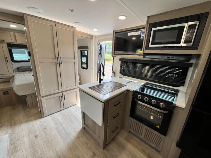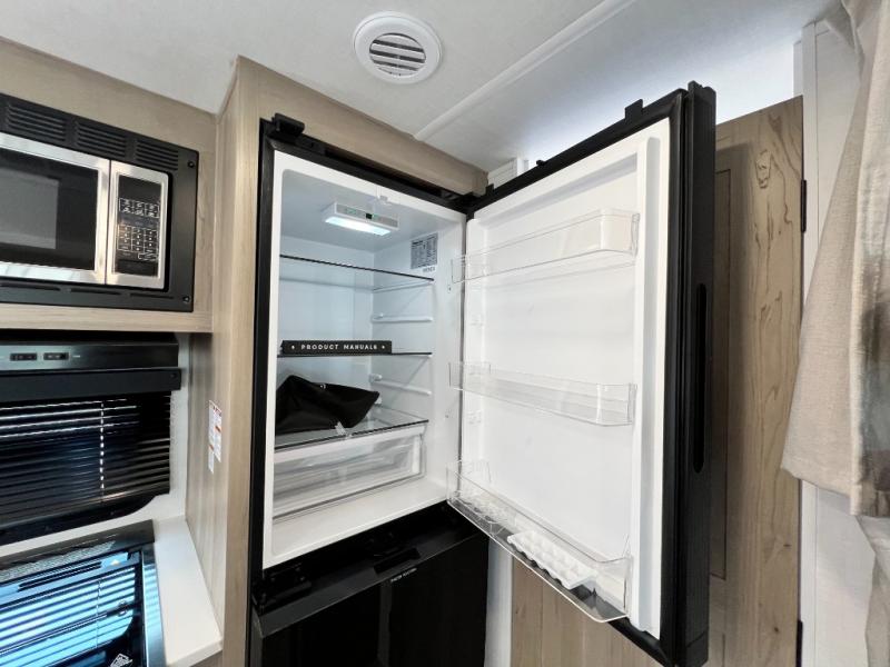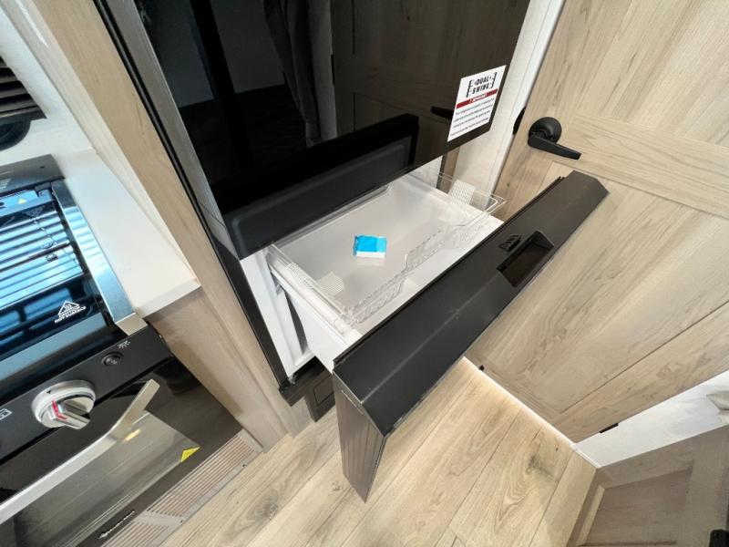 This bunkhouse model is perfect for your crew of six! You will appreciate the exterior bike door that lets you store gear under the flip-up bottom bunk, plus there is a pass-thru storage up front for even more storage. The RV queen bed in the front bedroom includes flip-up storage, two wardrobes, and a TV option if you like to stay up late with a movie. In the morning, everyone can meet in the combined kitchen and living area to dine around the U-shaped dinette, or you can take your plate outdoors to sit under the 18' power awning with LED lights. This model also includes an exterior griddle for a pancake breakfast!