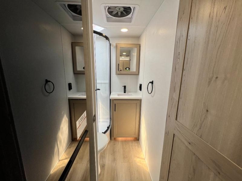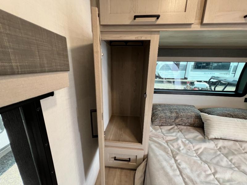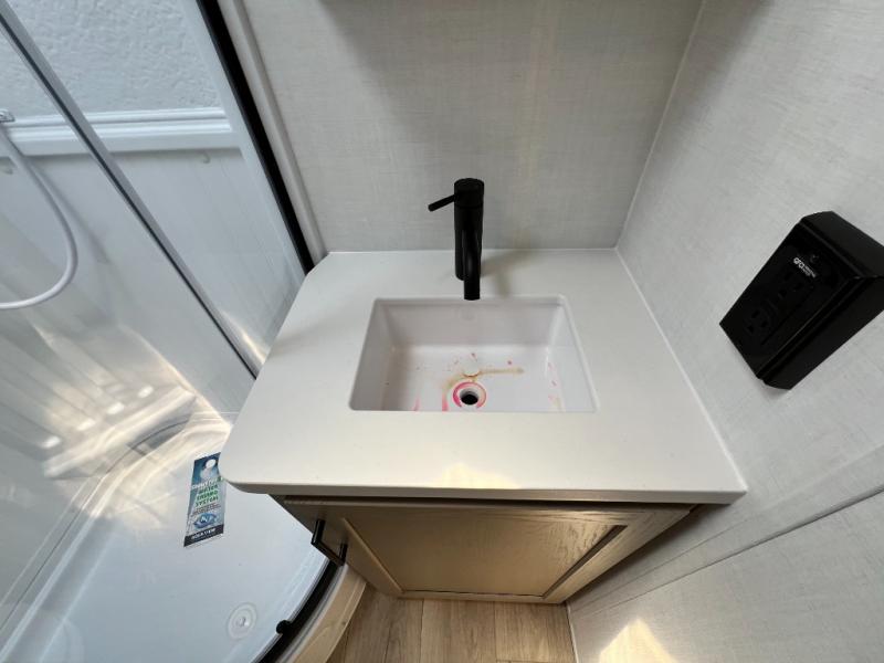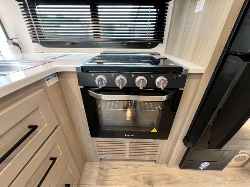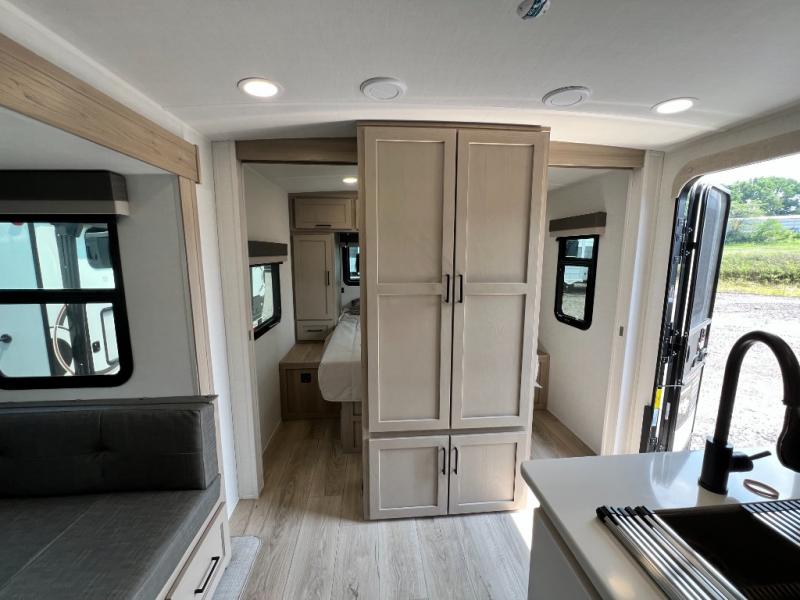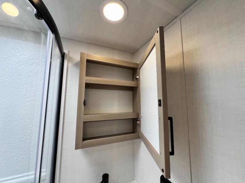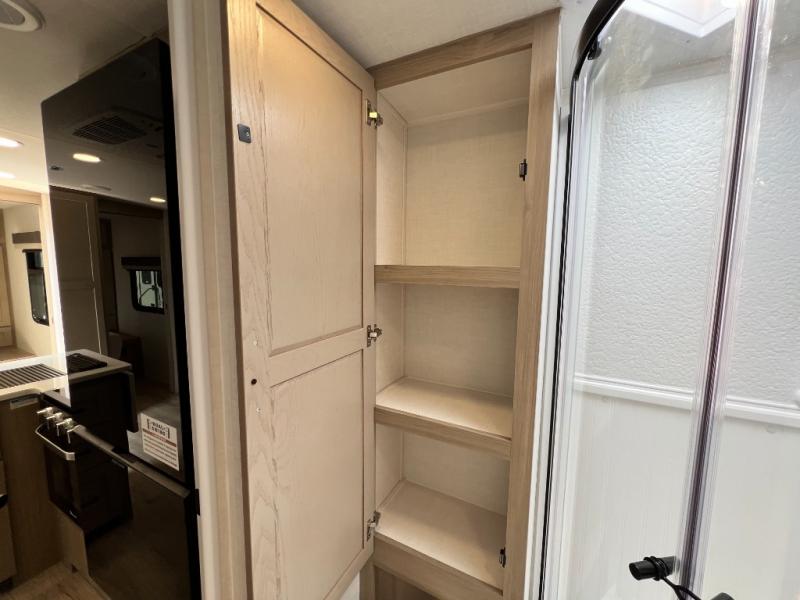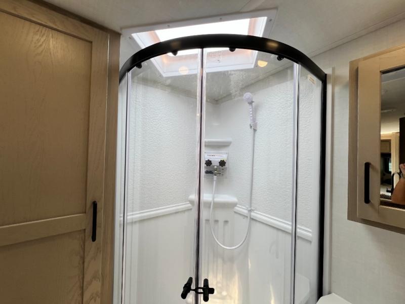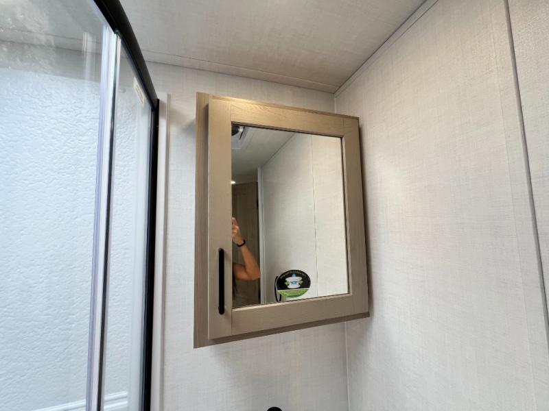 This bunkhouse model is perfect for your crew of six! You will appreciate the exterior bike door that lets you store gear under the flip-up bottom bunk, plus there is a pass-thru storage up front for even more storage. The RV queen bed in the front bedroom includes flip-up storage, two wardrobes, and a TV option if you like to stay up late with a movie. In the morning, everyone can meet in the combined kitchen and living area to dine around the U-shaped dinette, or you can take your plate outdoors to sit under the 18' power awning with LED lights. This model also includes an exterior griddle for a pancake breakfast!