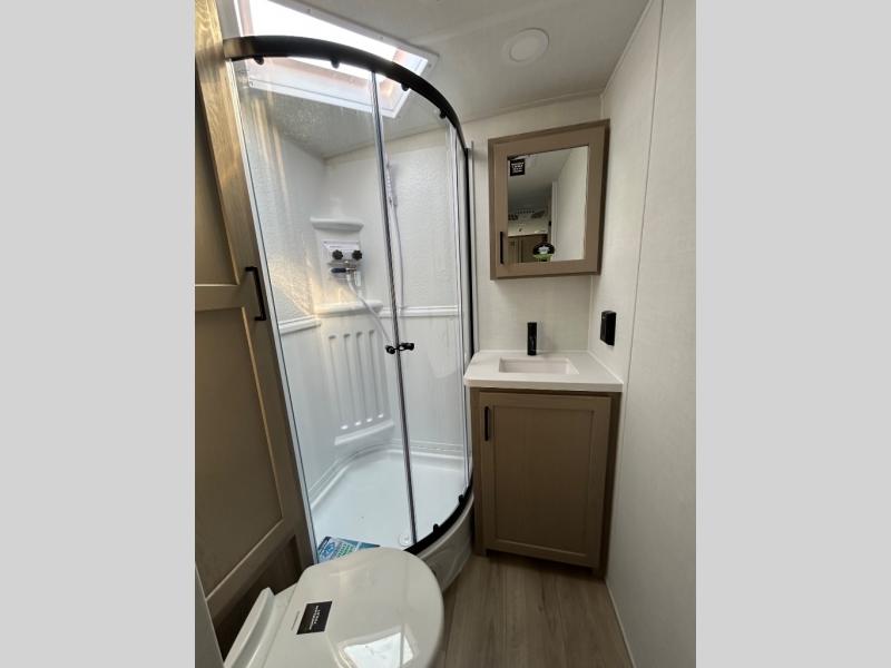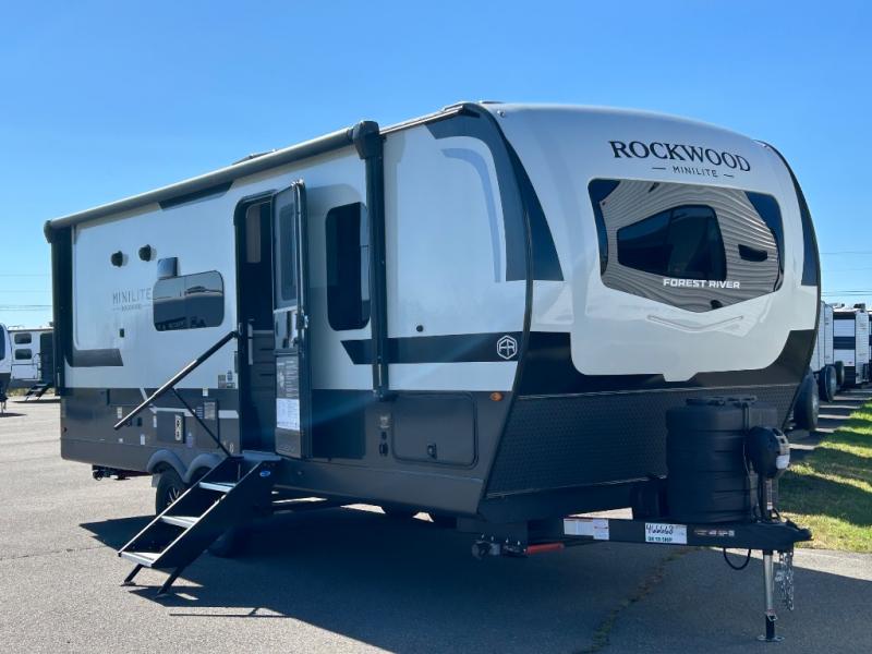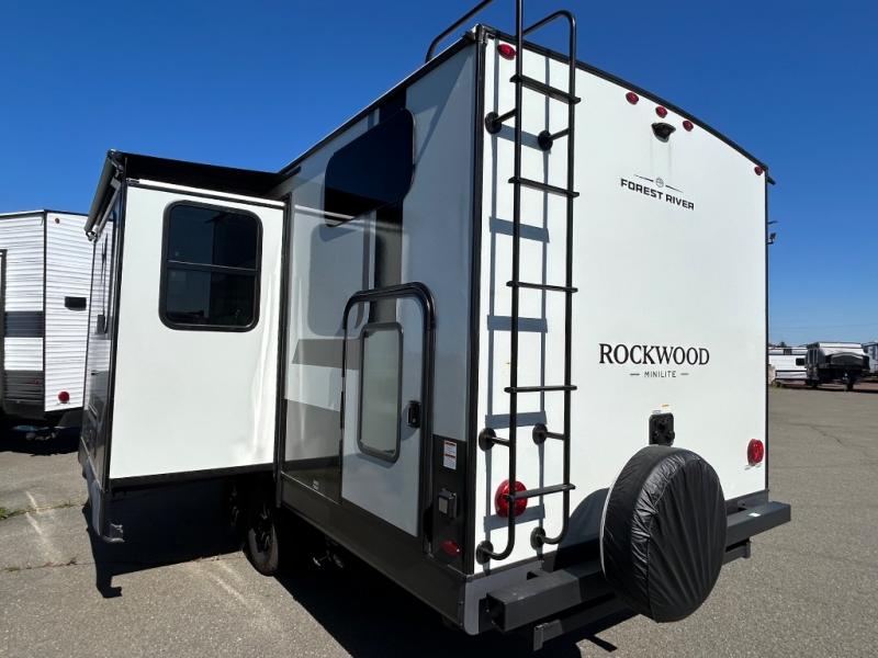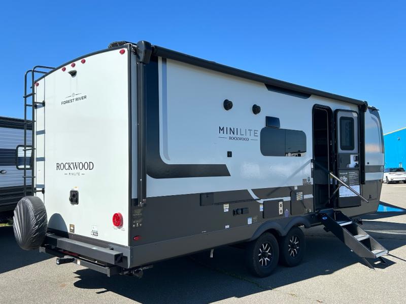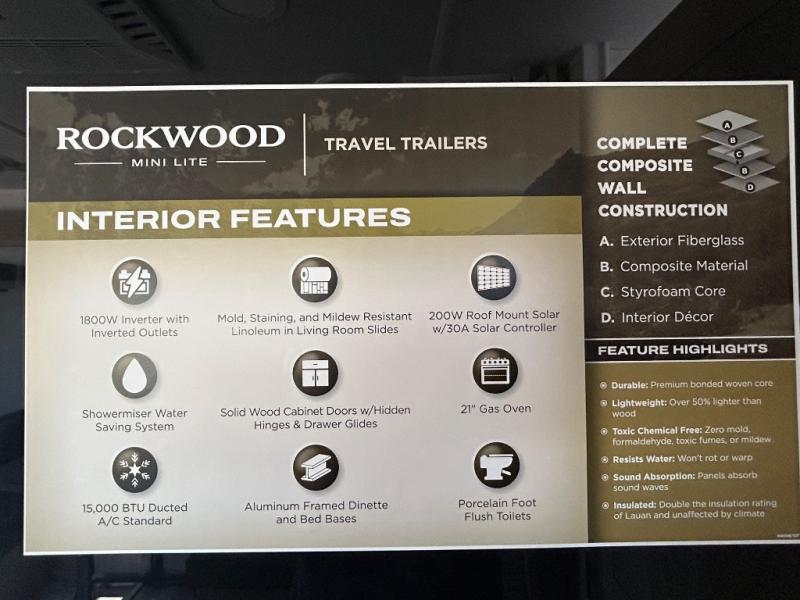 Each Rockwood Mini Lite travel trailer by Forest River is constructed with a fully laminated one-piece walkable roof, sleek frameless windows, and a six-sided full aluminum frame for strength and durability. The 12V thermostatically controlled heated tanks, plus radiant foil in the underbelly will allow you to camp well into the colder months, and the 200W roof solar panel will be perfect for a little off-gridding. Each model includes solid surface kitchen countertops, hidden hinge cabinet doors, roller shades, plus many more interior features. Having an AIR 360+ omnidirectional antenna with WiFi prep on board gives you the option to get some work done if it's needed, and the power tongue jack provides hassle-free set up, so you can enjoy more time relaxing!