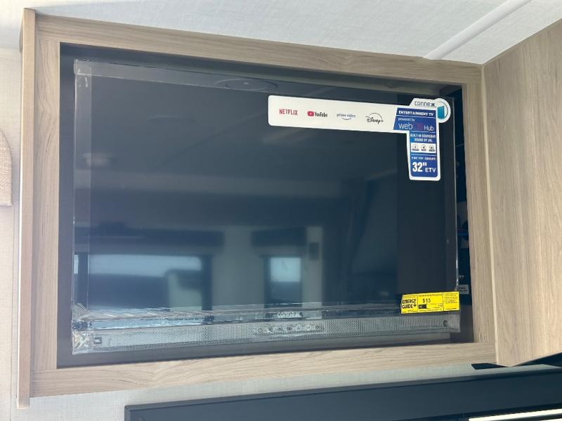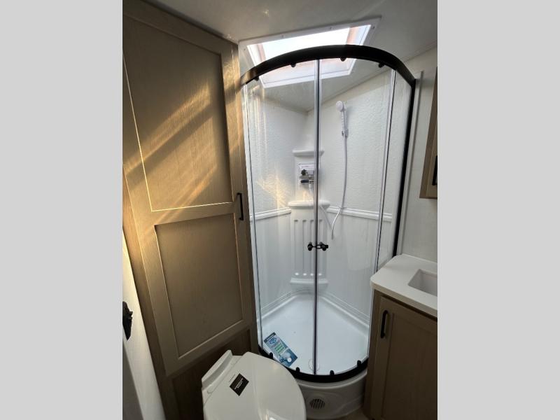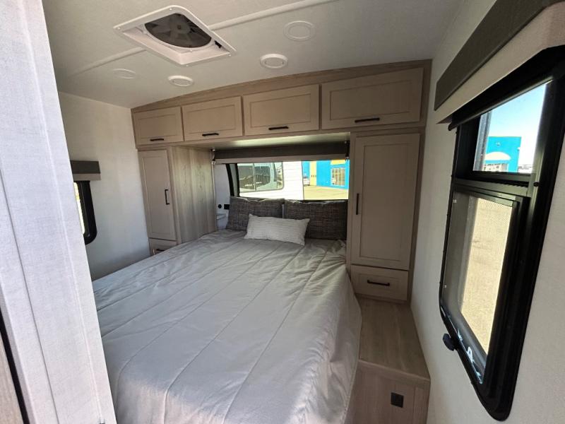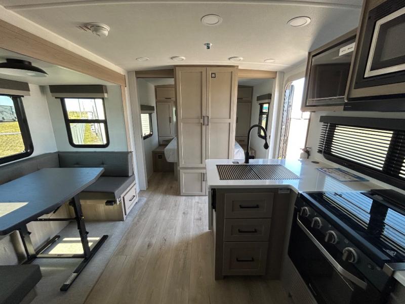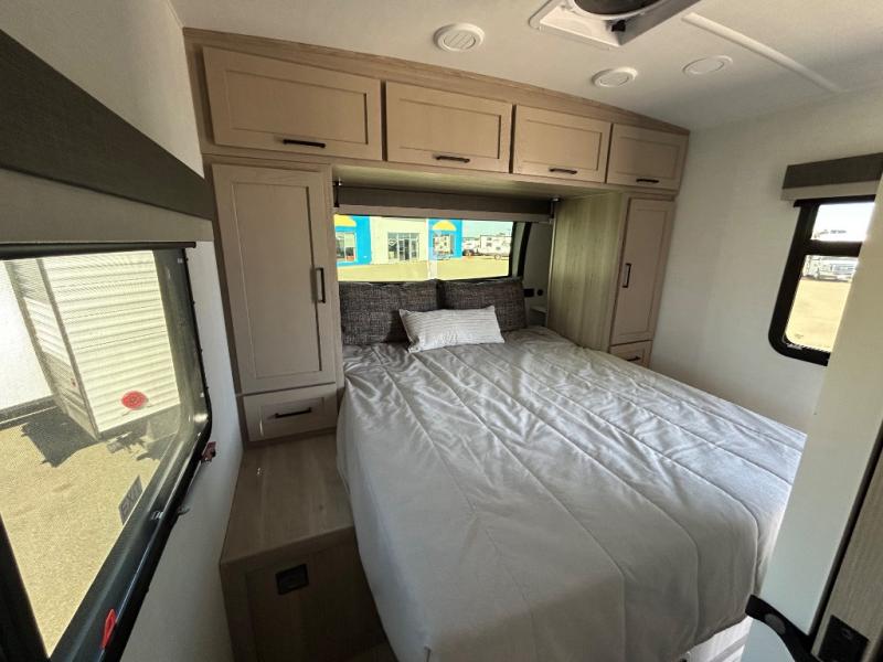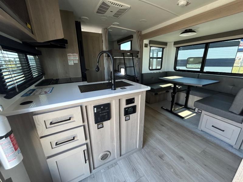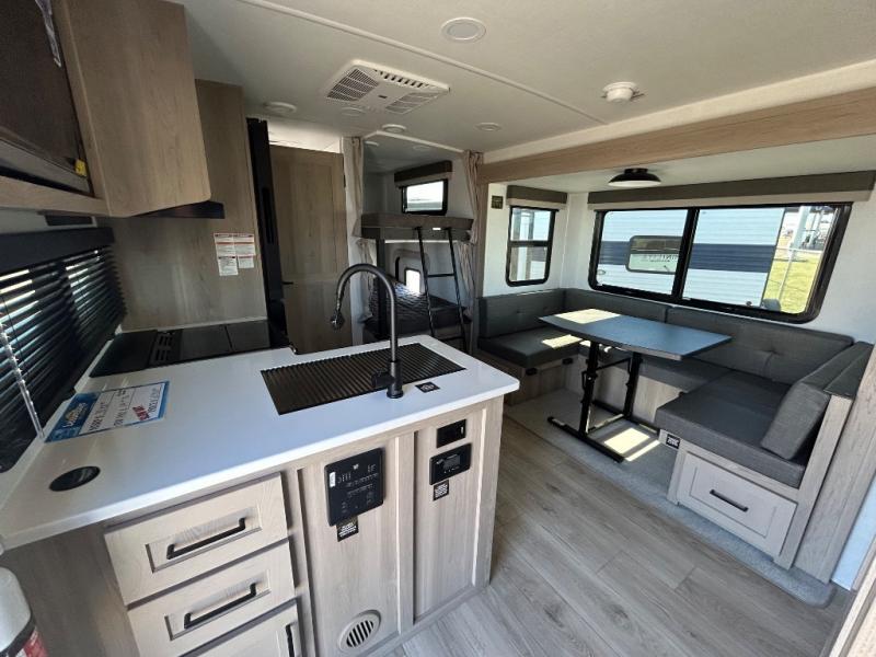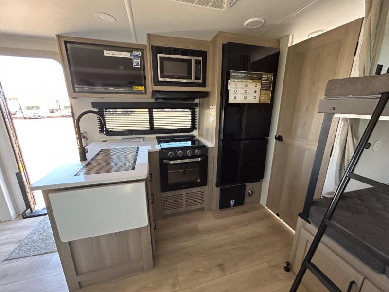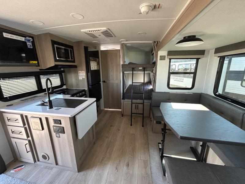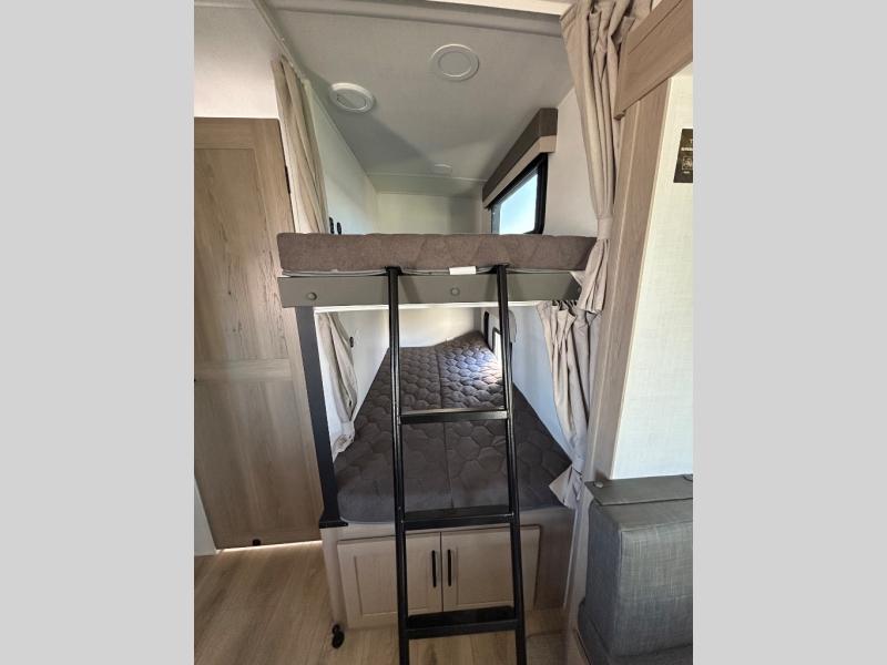 This bunkhouse model is perfect for your crew of six! You will appreciate the exterior bike door that lets you store gear under the flip-up bottom bunk, plus there is a pass-thru storage up front for even more storage. The RV queen bed in the front bedroom includes flip-up storage, two wardrobes, and a TV option if you like to stay up late with a movie. In the morning, everyone can meet in the combined kitchen and living area to dine around the U-shaped dinette, or you can take your plate outdoors to sit under the 18' power awning with LED lights. This model also includes an exterior griddle for a pancake breakfast!