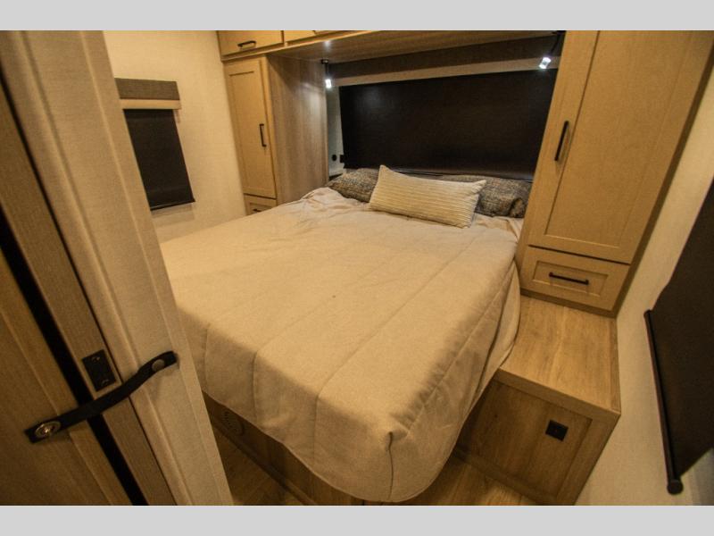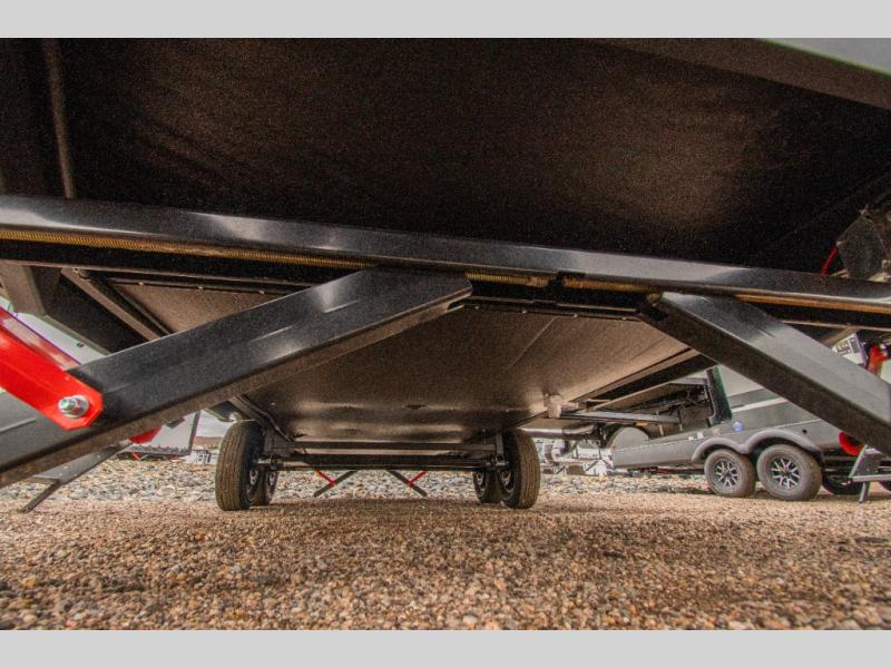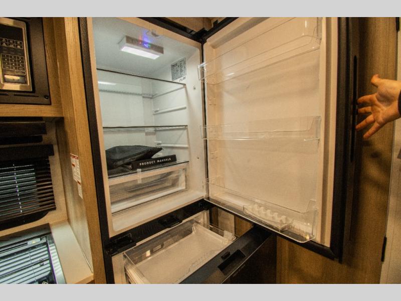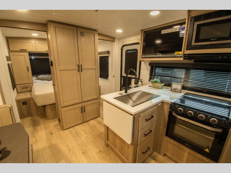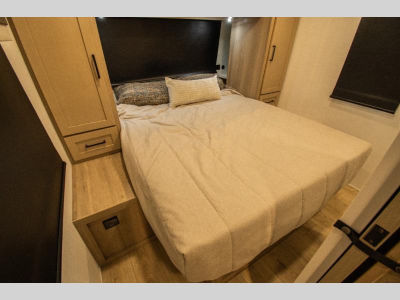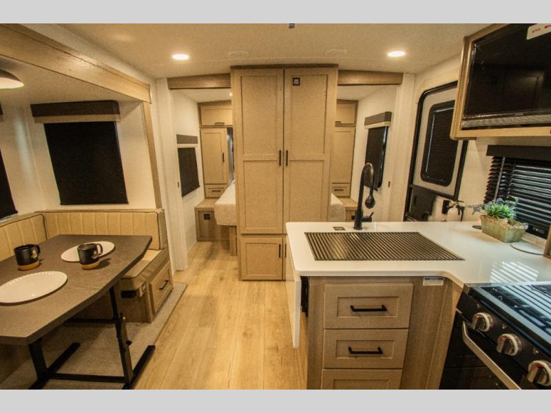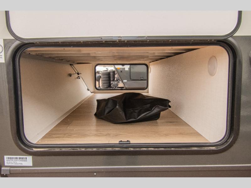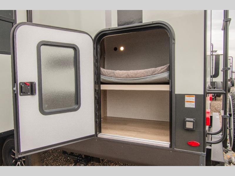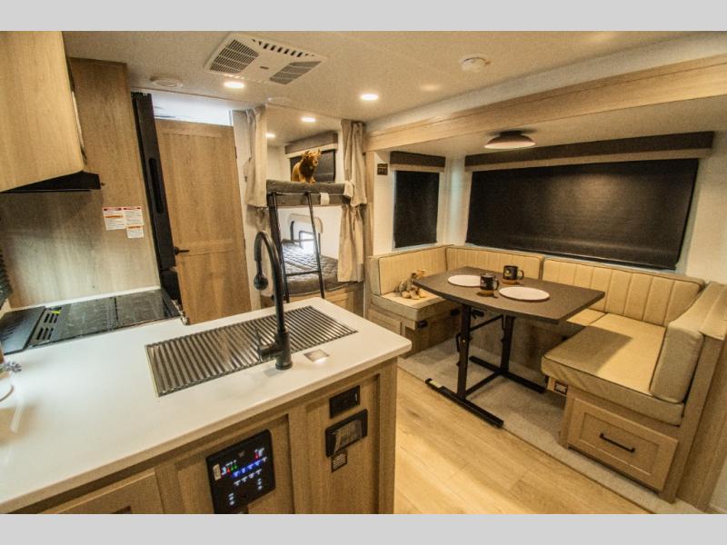 This bunkhouse model is perfect for your crew of six! You will appreciate the exterior bike door that lets you store gear under the flip-up bottom bunk, plus there is a pass-thru storage up front for even more storage. The RV queen bed in the front bedroom includes flip-up storage, two wardrobes, and a TV option if you like to stay up late with a movie. In the morning, everyone can meet in the combined kitchen and living area to dine around the U-shaped dinette, or you can take your plate outdoors to sit under the 18' power awning with LED lights. This model also includes an exterior griddle for a pancake breakfast!