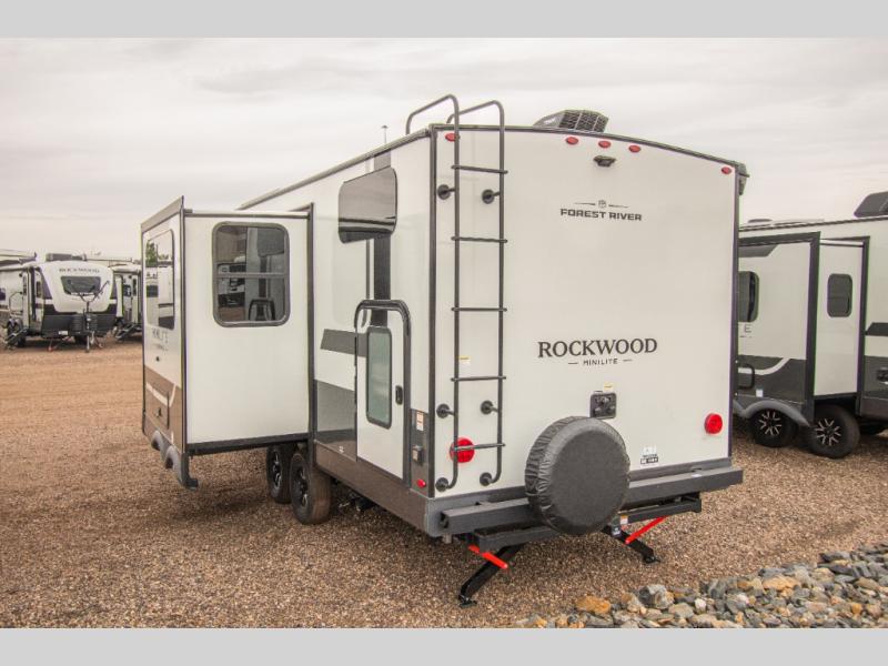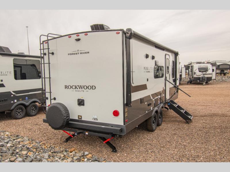 Each Rockwood Mini Lite travel trailer by Forest River is constructed with a fully laminated one-piece walkable roof, sleek frameless windows, and a six-sided full aluminum frame for strength and durability. The 12V thermostatically controlled heated tanks, plus radiant foil in the underbelly will allow you to camp well into the colder months, and the 200W roof solar panel will be perfect for a little off-gridding. Each model includes solid surface kitchen countertops, hidden hinge cabinet doors, roller shades, plus many more interior features. Having an AIR 360+ omnidirectional antenna with WiFi prep on board gives you the option to get some work done if it's needed, and the power tongue jack provides hassle-free set up, so you can enjoy more time relaxing!