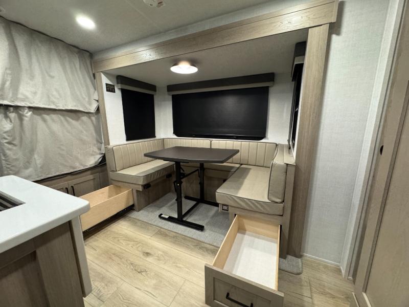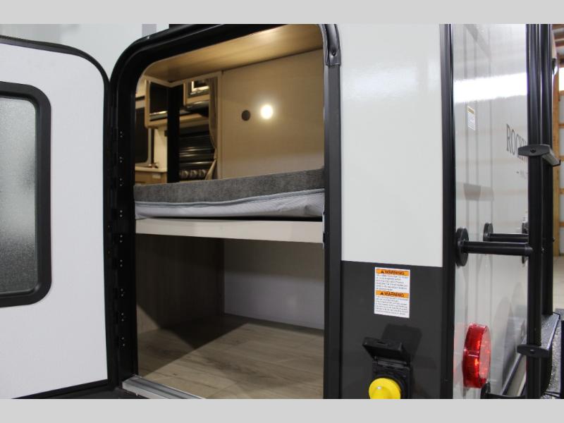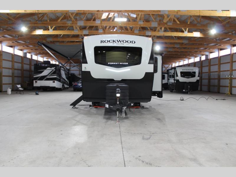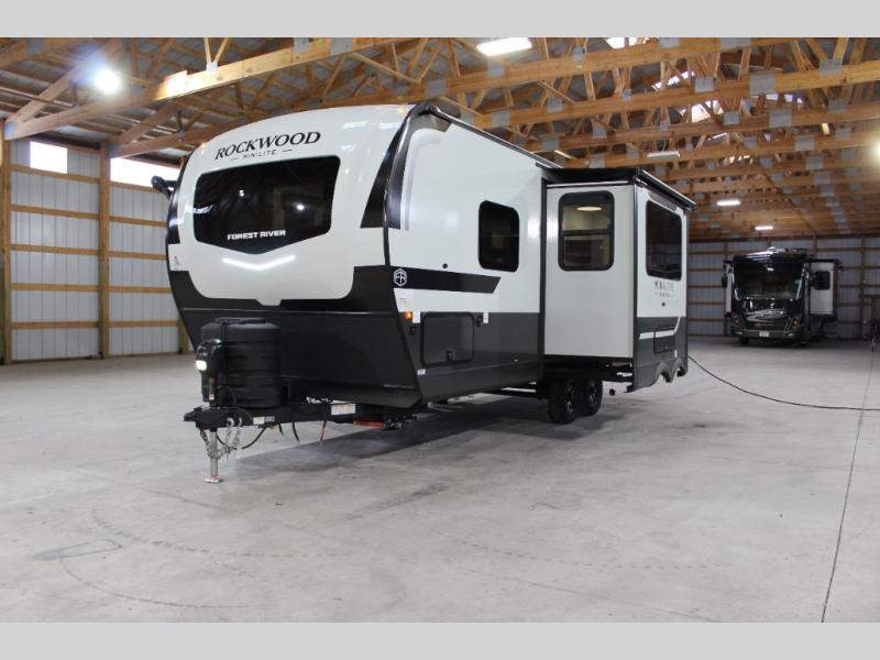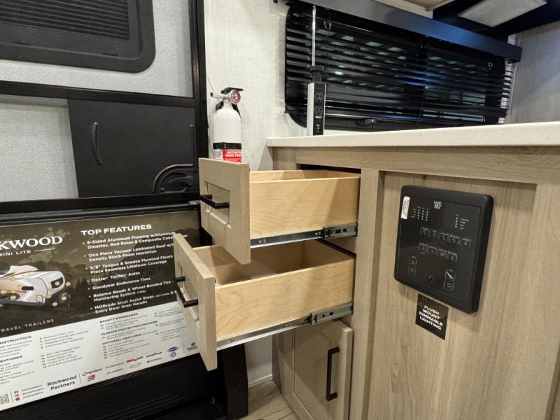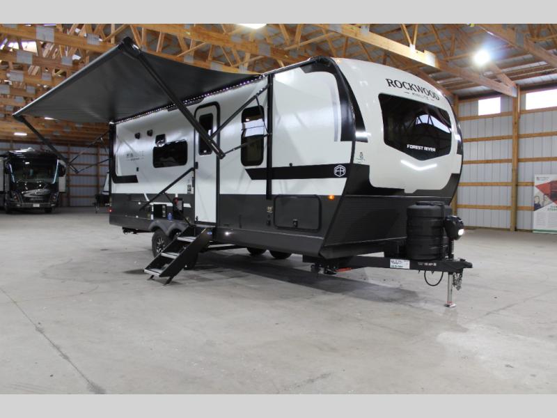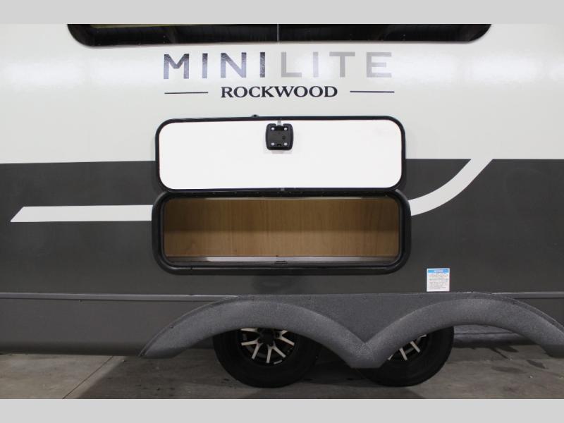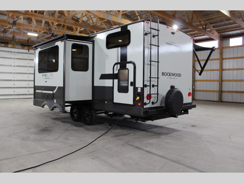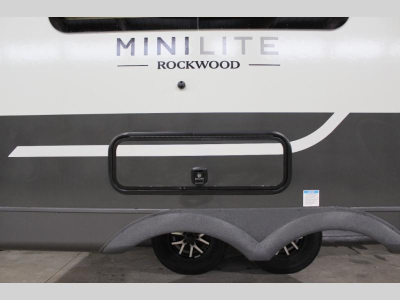 Each Rockwood Mini Lite travel trailer by Forest River is constructed with a fully laminated one-piece walkable roof, sleek frameless windows, and a six-sided full aluminum frame for strength and durability. The 12V thermostatically controlled heated tanks, plus radiant foil in the underbelly will allow you to camp well into the colder months, and the 200W roof solar panel will be perfect for a little off-gridding. Each model includes solid surface kitchen countertops, hidden hinge cabinet doors, roller shades, plus many more interior features. Having an AIR 360+ omnidirectional antenna with WiFi prep on board gives you the option to get some work done if it's needed, and the power tongue jack provides hassle-free set up, so you can enjoy more time relaxing!