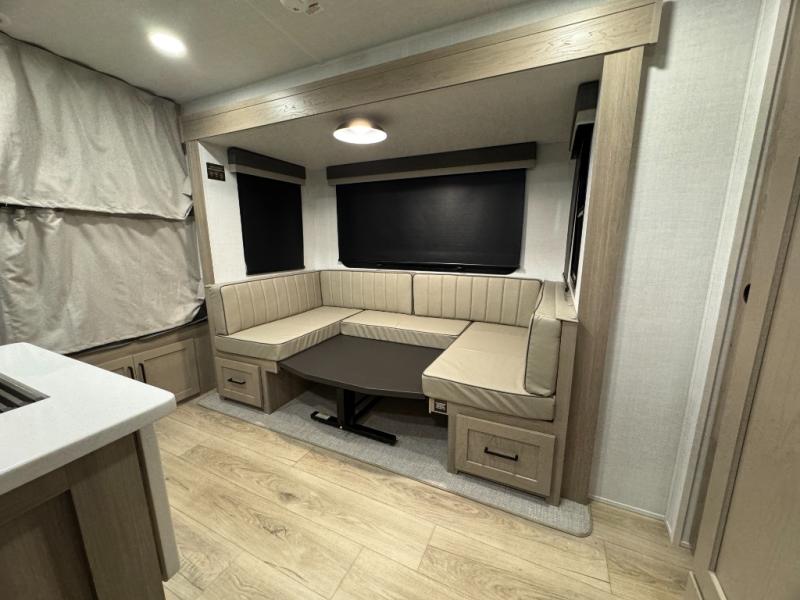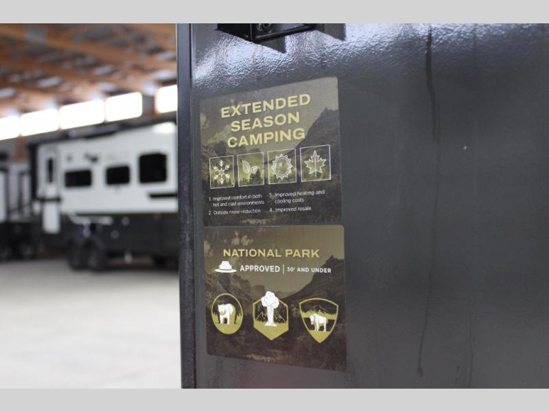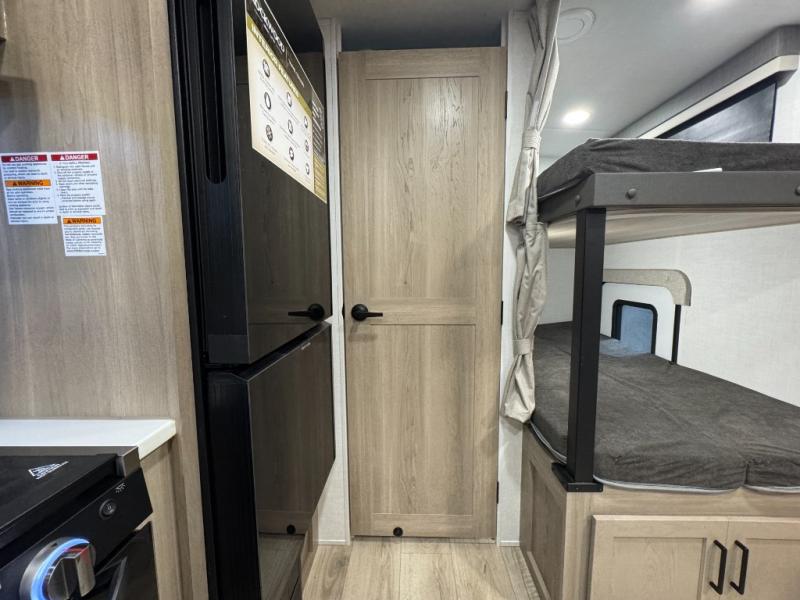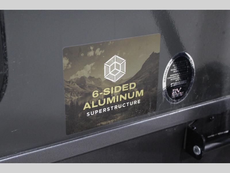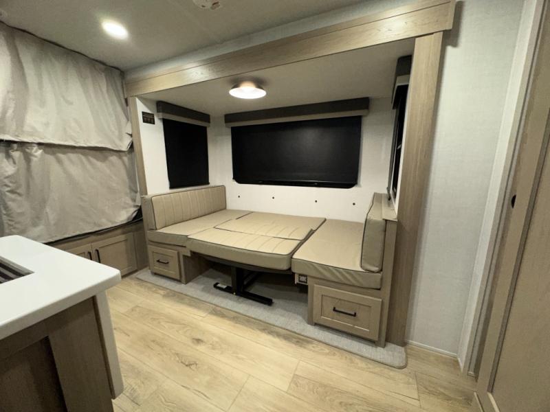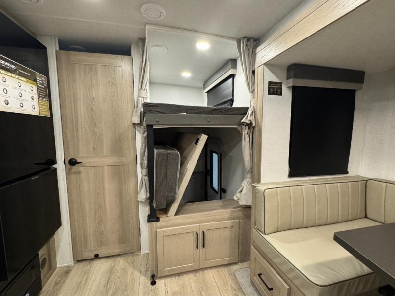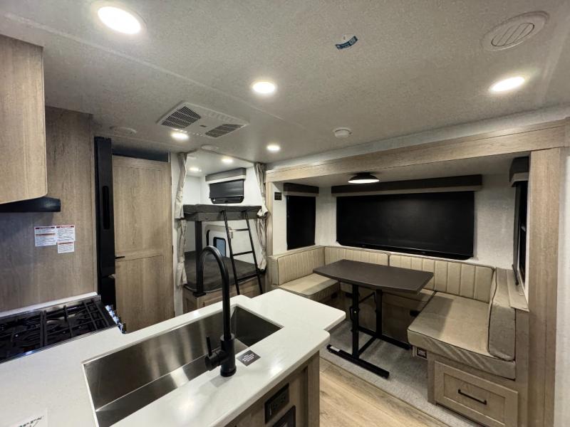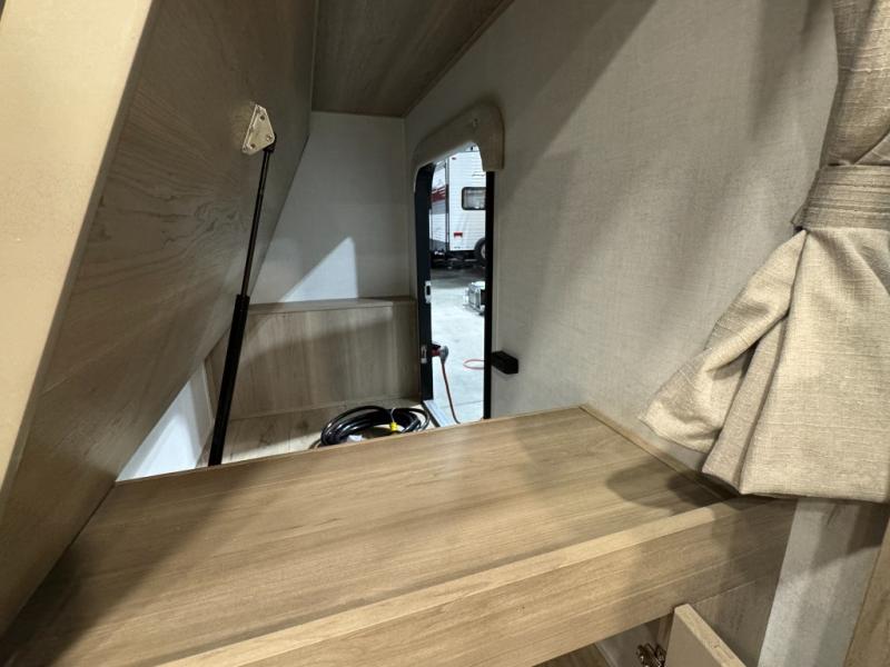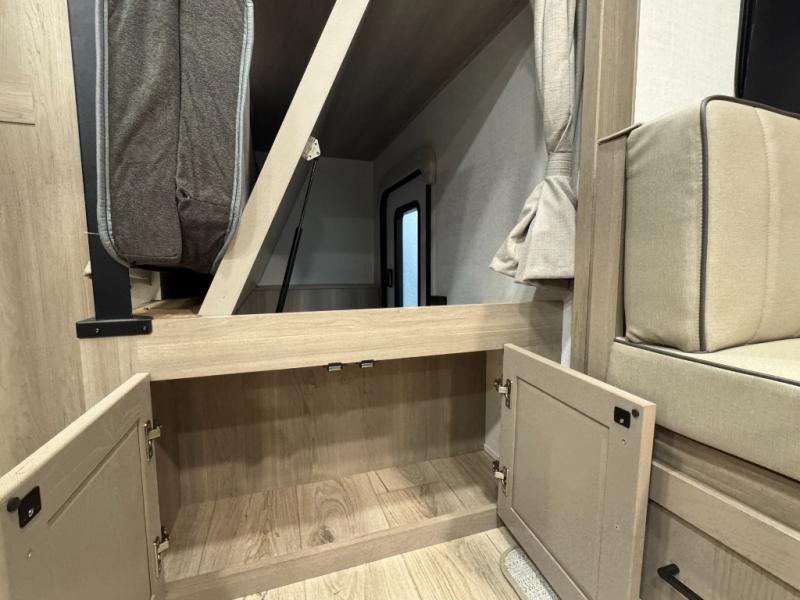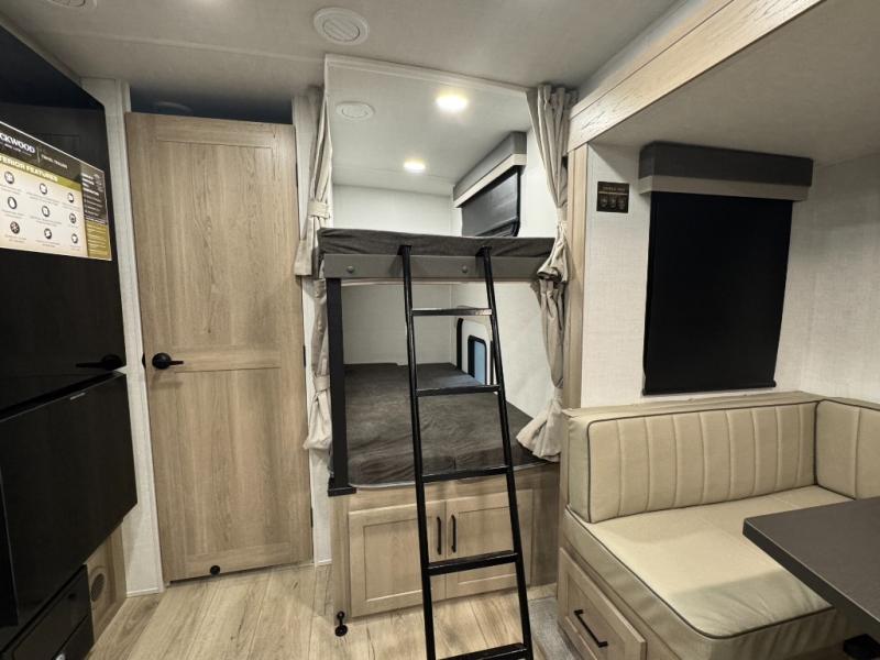This bunkhouse model is perfect for your crew of six! You will appreciate the exterior bike door that lets you store gear under the flip-up bottom bunk, plus there is a pass-thru storage up front for even more storage. The RV queen bed in the front bedroom includes flip-up storage, two wardrobes, and a TV option if you like to stay up late with a movie. In the morning, everyone can meet in the combined kitchen and living area to dine around the U-shaped dinette, or you can take your plate outdoors to sit under the 18' power awning with LED lights. This model also includes an exterior griddle for a pancake breakfast!