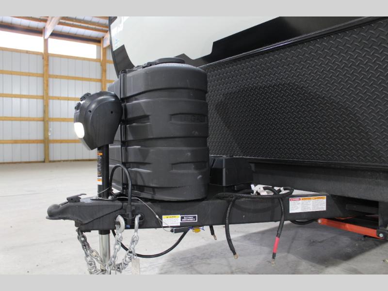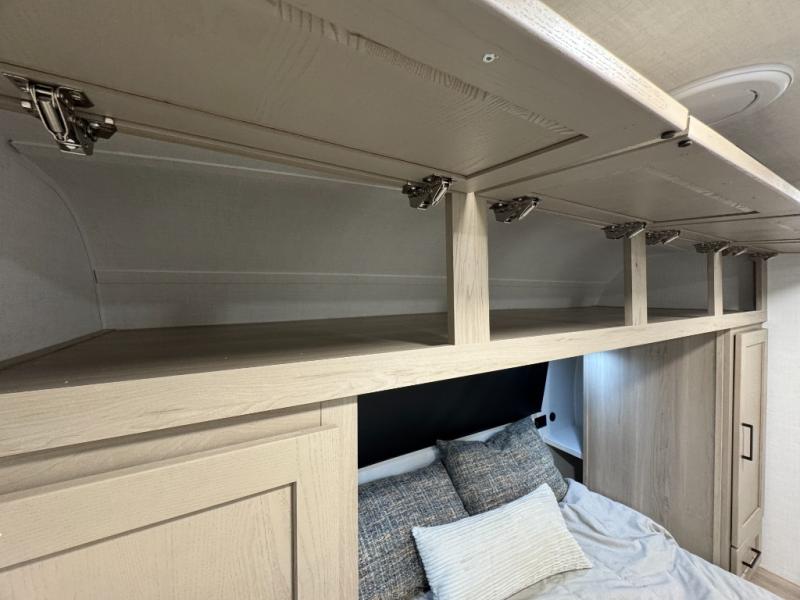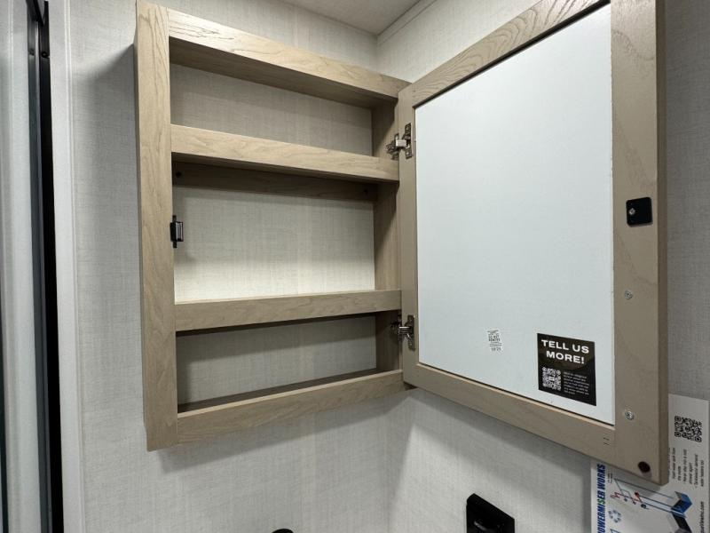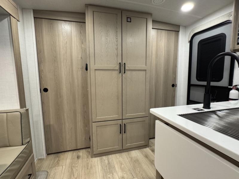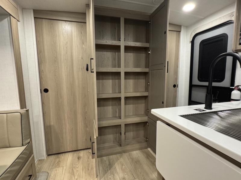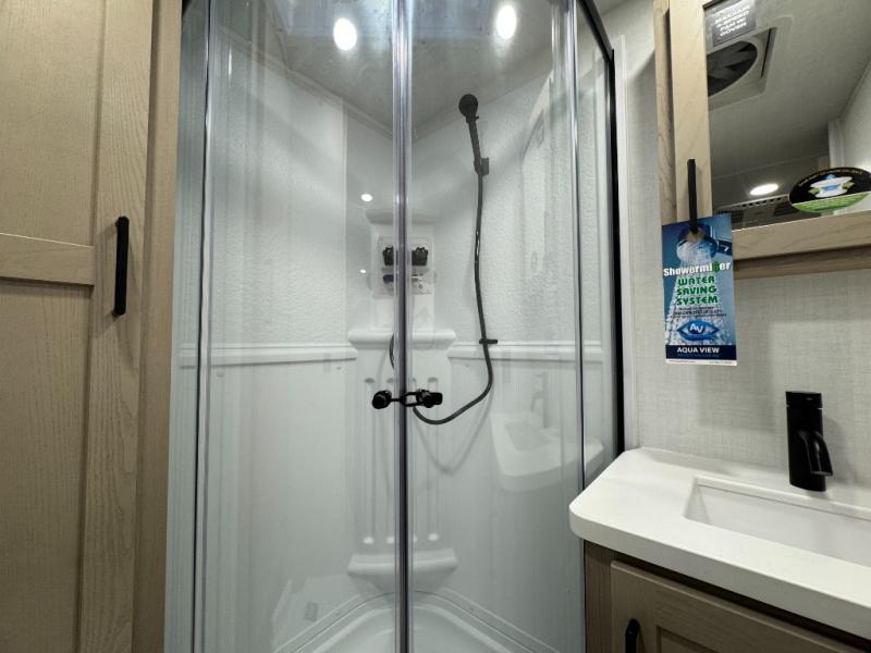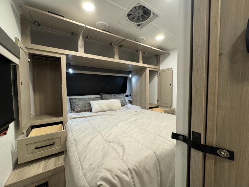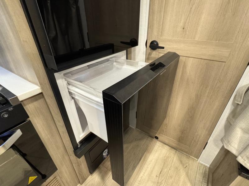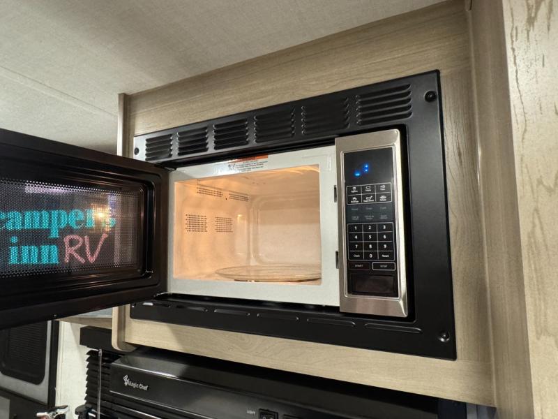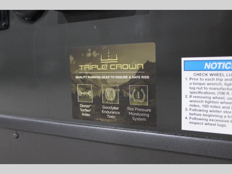 This bunkhouse model is perfect for your crew of six! You will appreciate the exterior bike door that lets you store gear under the flip-up bottom bunk, plus there is a pass-thru storage up front for even more storage. The RV queen bed in the front bedroom includes flip-up storage, two wardrobes, and a TV option if you like to stay up late with a movie. In the morning, everyone can meet in the combined kitchen and living area to dine around the U-shaped dinette, or you can take your plate outdoors to sit under the 18' power awning with LED lights. This model also includes an exterior griddle for a pancake breakfast!